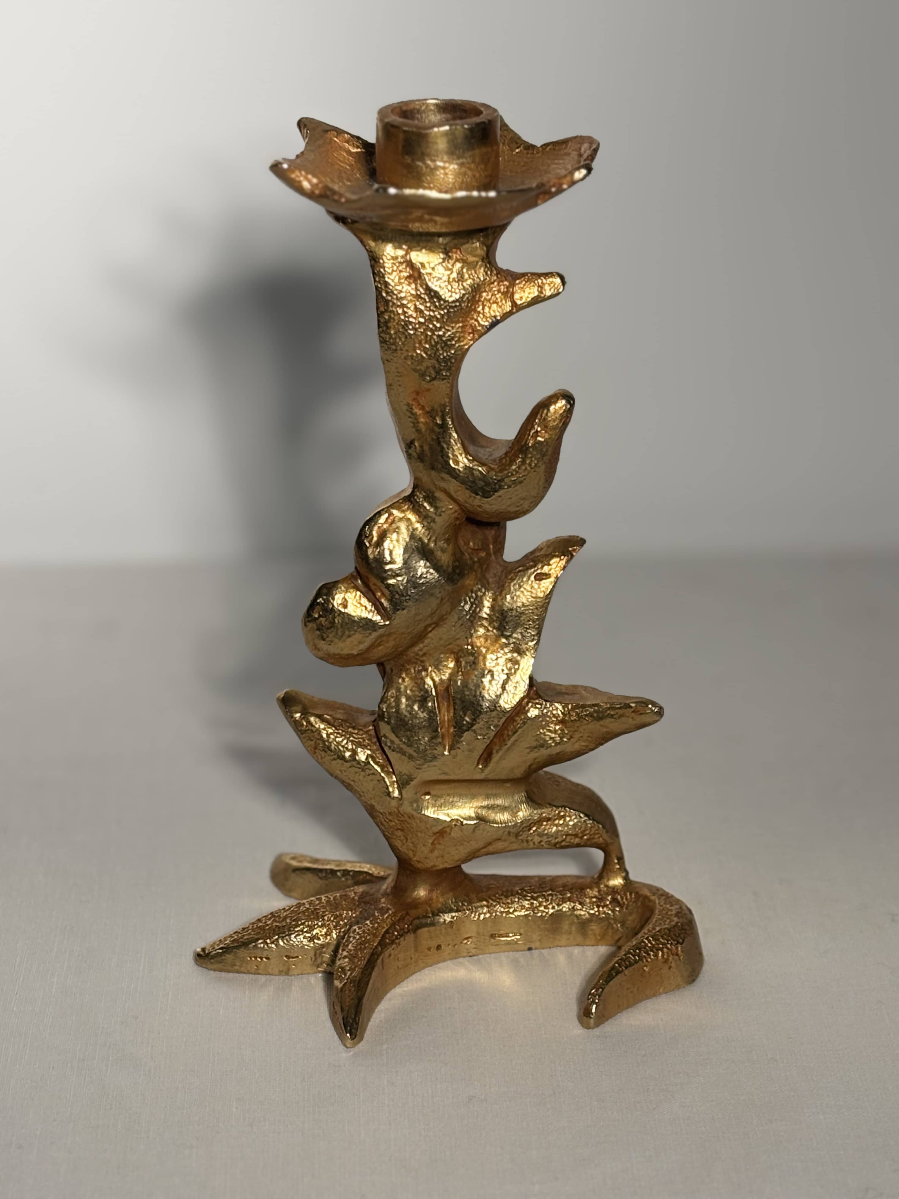 Elégant bougeoir en bronze sculpté à patine dorée, création de l'artiste designer Pierre Casenove. Cette pièce emblématique du style brutaliste poétique de l'artiste représente un oiseau stylisé aux lignes organiques, dont le corps s'élance. Le travail de texture est caractéristique de Casenove: une surface mouvementée qui accroche la lumière. L'oeuvre témoigne de l'esthétique propre aux années 80-90, fusionnant l'objet utilitaire et la sculpture animalière. Signé sur la base. France, XXe siècle