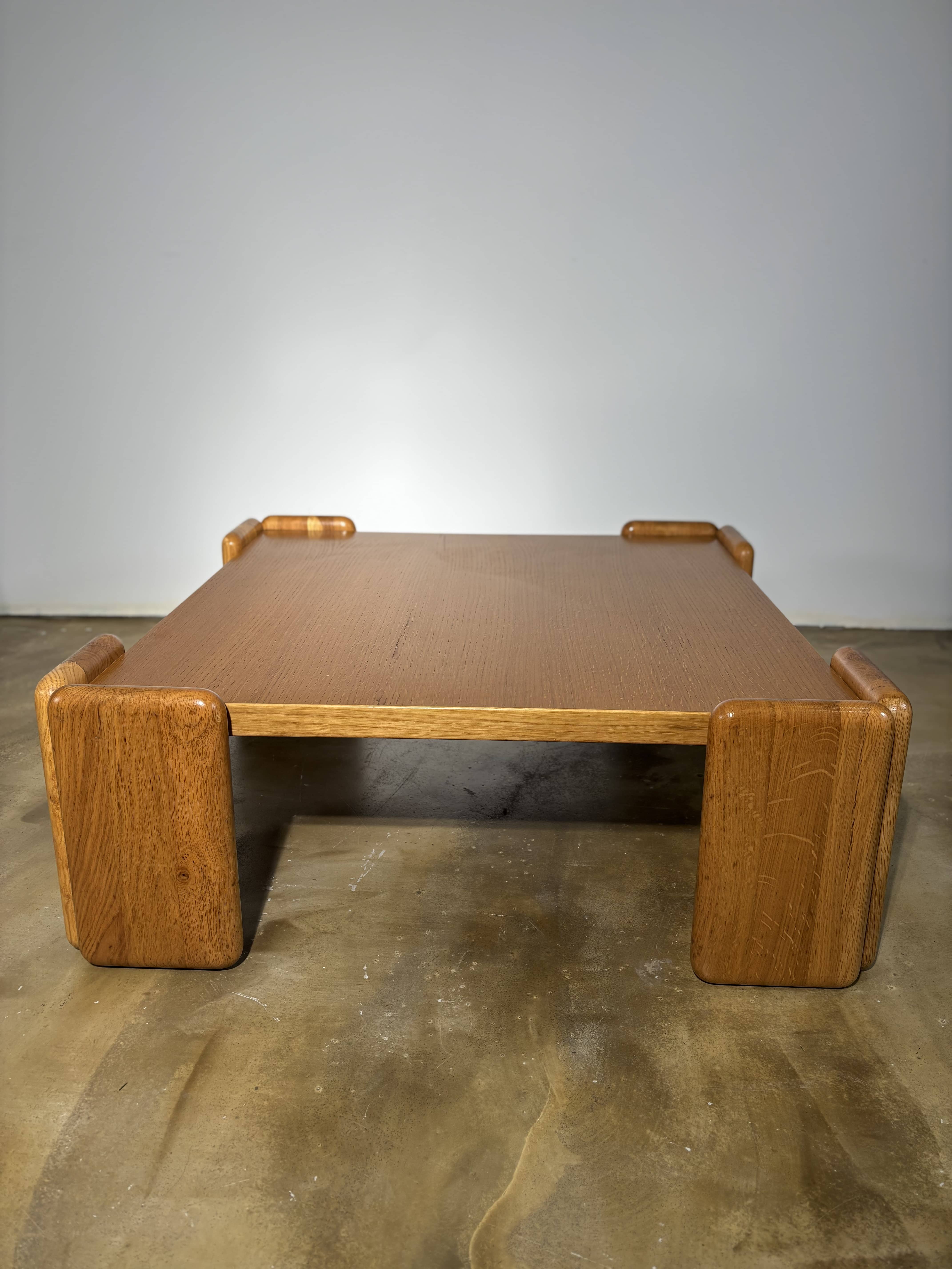 Réalisée en chêne massif, cette table se distingue par ses quatre pieds caractéristiques composés de lames arrondies qui dépassent au-dessus du plateau — signature immédiatement reconnaissable du design de Mario Marenco.