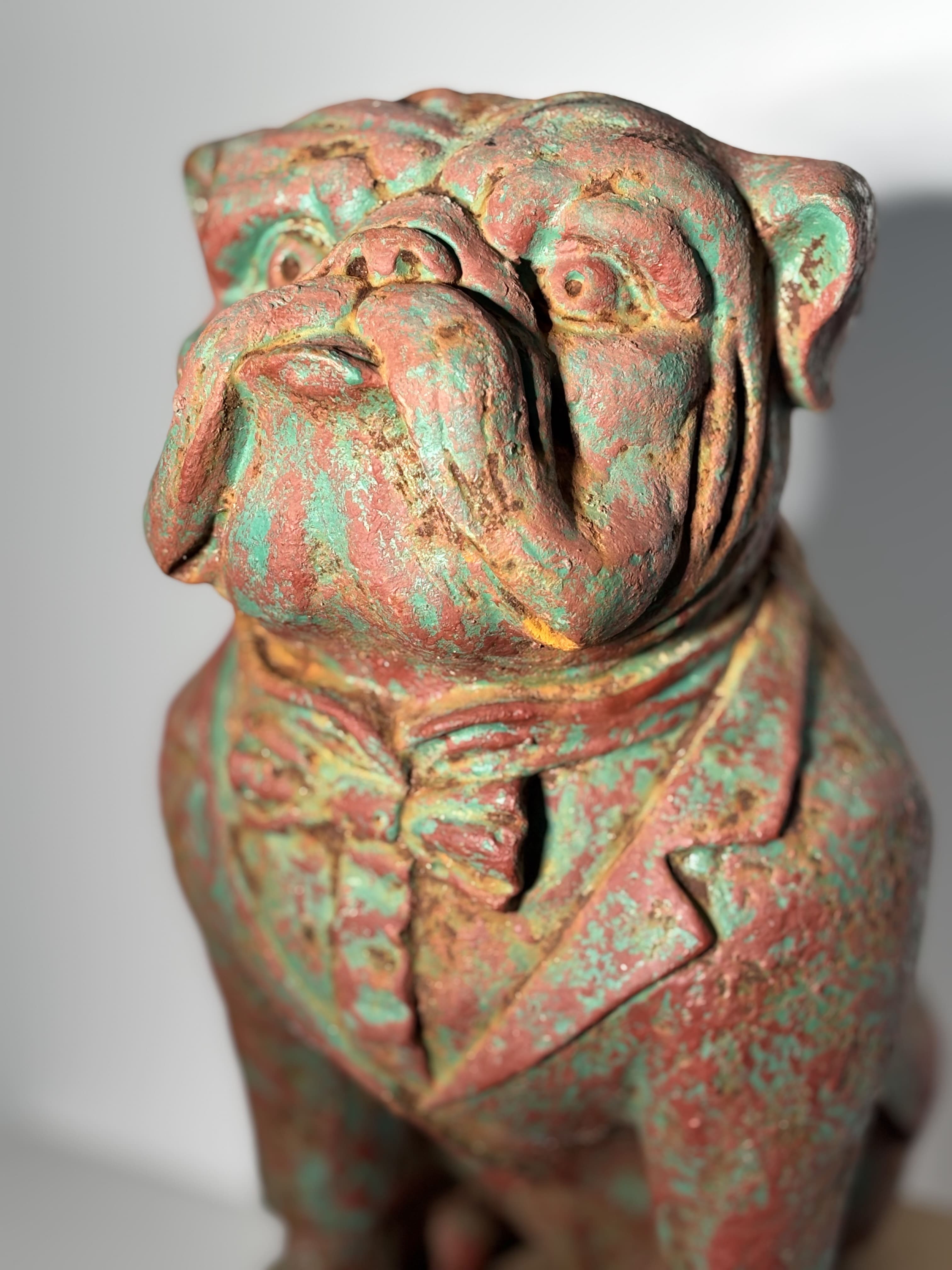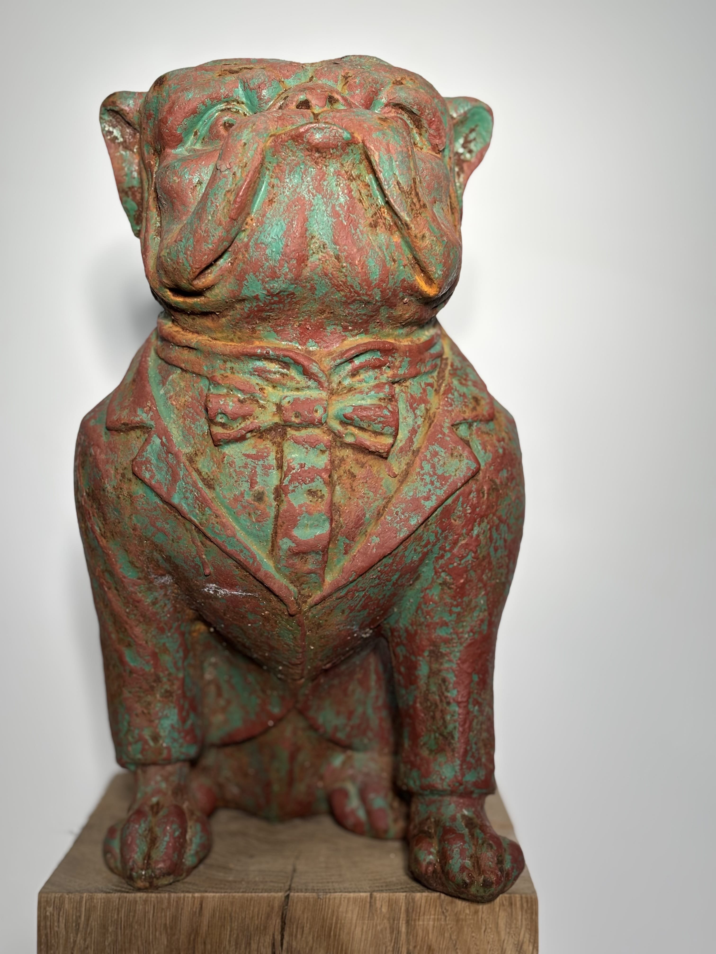Sculpture décorative représentant un bulldog assis, figuré de manière anthropomorphe, vêtu d'un smoking avec noeud papillon. Cette pièce en fonte moulée se distingue par la qualité de son modelé, la force de son expression et son caractère résolument décoratif. Datable de la fin du XIXe - début XXe siècle, ce type de sujet humoristique et élégant était particulièrement apprécié pour l'ornement des entrées de maison, jardins d'hiver, halls ou intérieurs bourgeois. La surface présente une belle patine ancienne, aux nuances de rouge brun et de vert, résultant d'une oxydation naturelle et probablement d'anciennes couches de finition aujourd'hui altérées. Cette patine ancienne non restaurée confère à la sculpture un aspect très vivant. Poids: 8kg Le socle en bois visible su rles photographies est un élément de présentation et n'est pas inclus dans la vente.