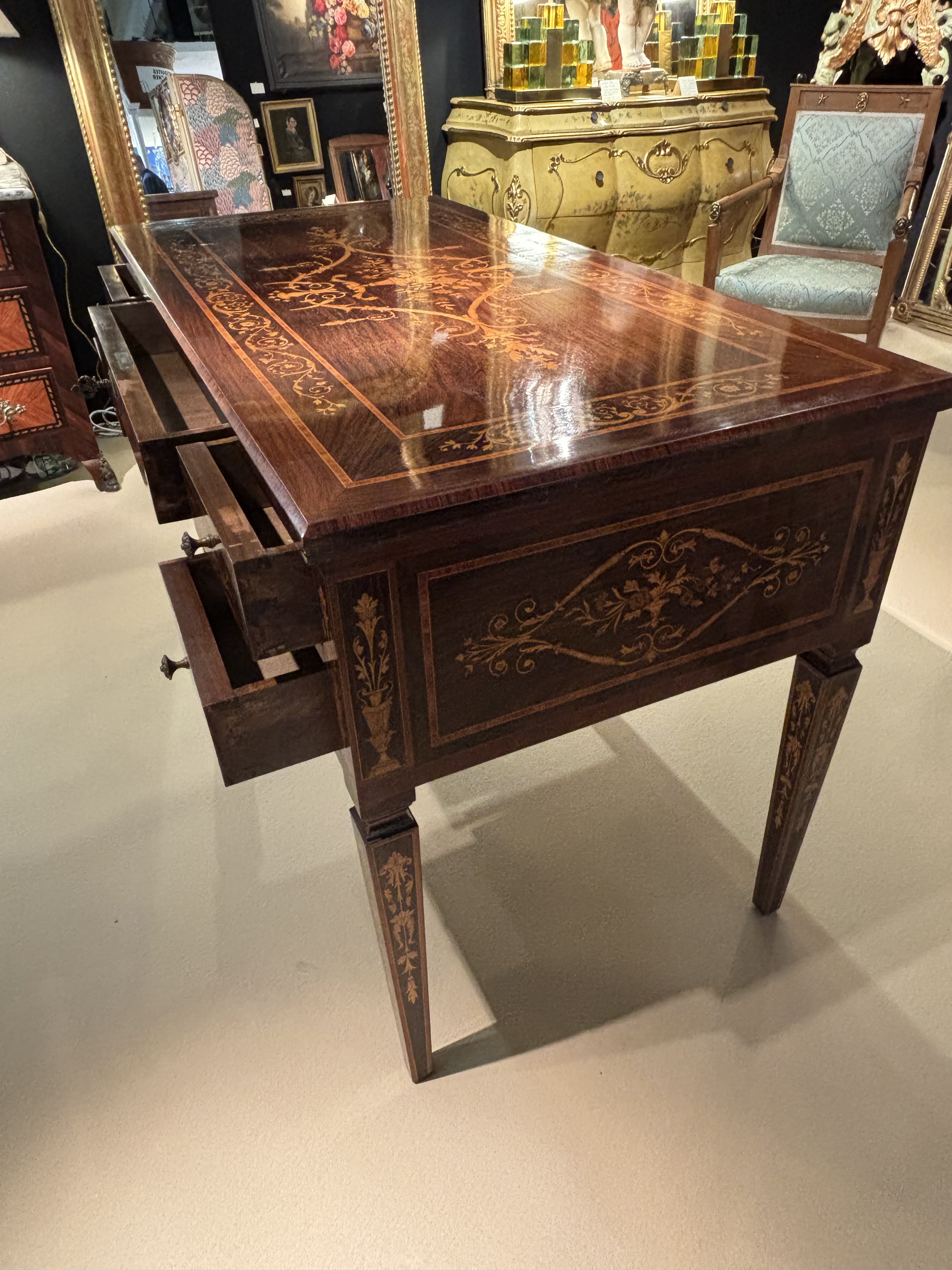 Bureau en bois précieux et marqueterie finement exécutée, inspiré du travail de Giuseppe Maggiolini (1738-1814) ébéniste renommé pour ses marqueteries détaillées de style néoclassique. Bureau en placage de palissandre, acajou et noyer, avec marqueterie en buis et citronnier, représentant rinceaux, guirlandes florales et vase central sur le plateau, tiroirs et pieds. Structure rectangulaire, pieds fuselés ornés d'inscrustations Trois tiroirs en façade, poignées et serrures en laiton Travail Italien, probablement Lombardie, XXe siècle