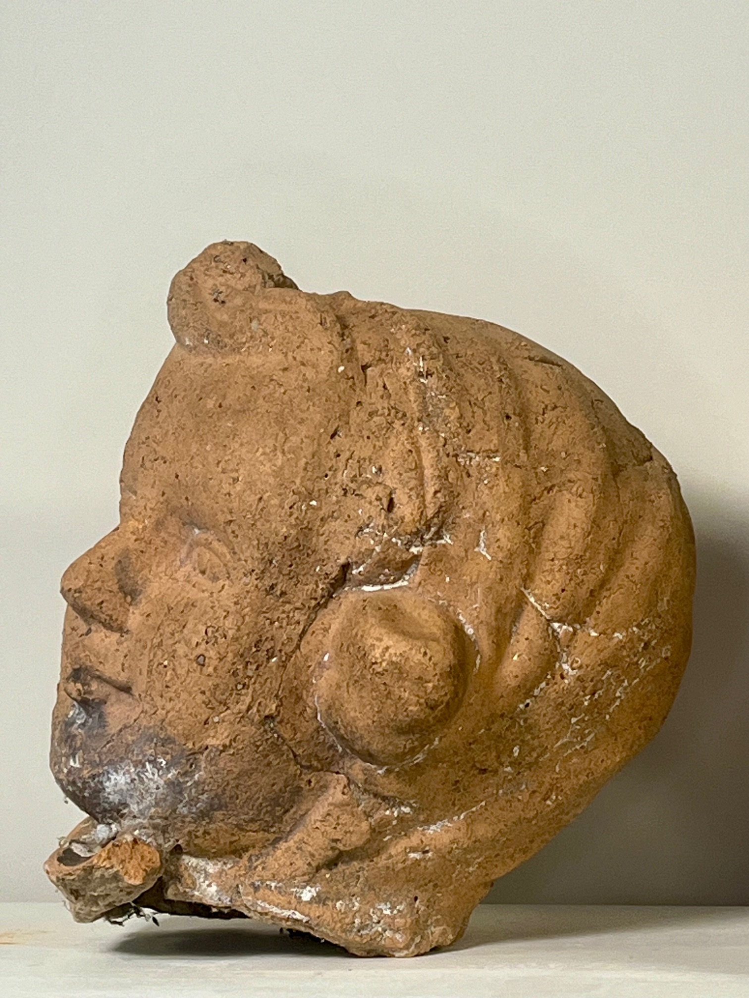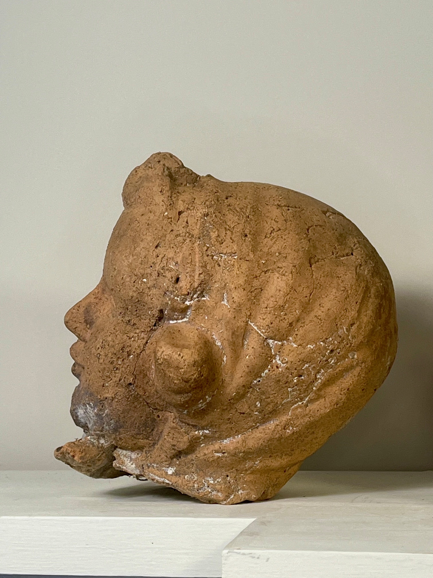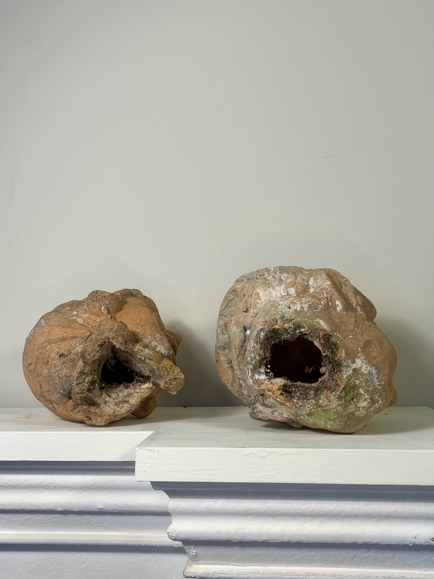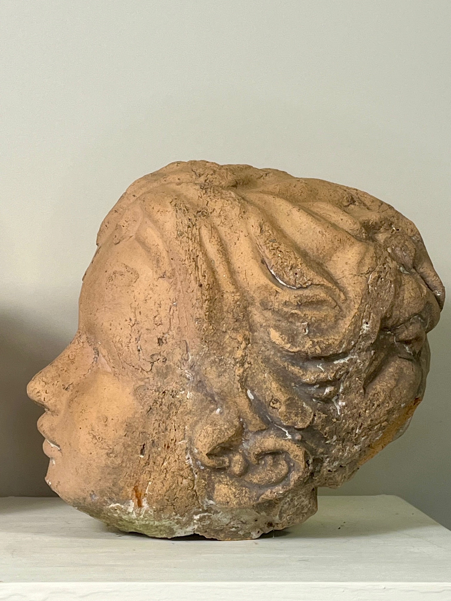 Deux ravissantes terres cuites de têtes d’enfants, un garçon et une fille. Probablement début XXe siècle et peut-être plus anciennes. Charmants objets poétiques uniques, ornements de la maison ou du jardin.