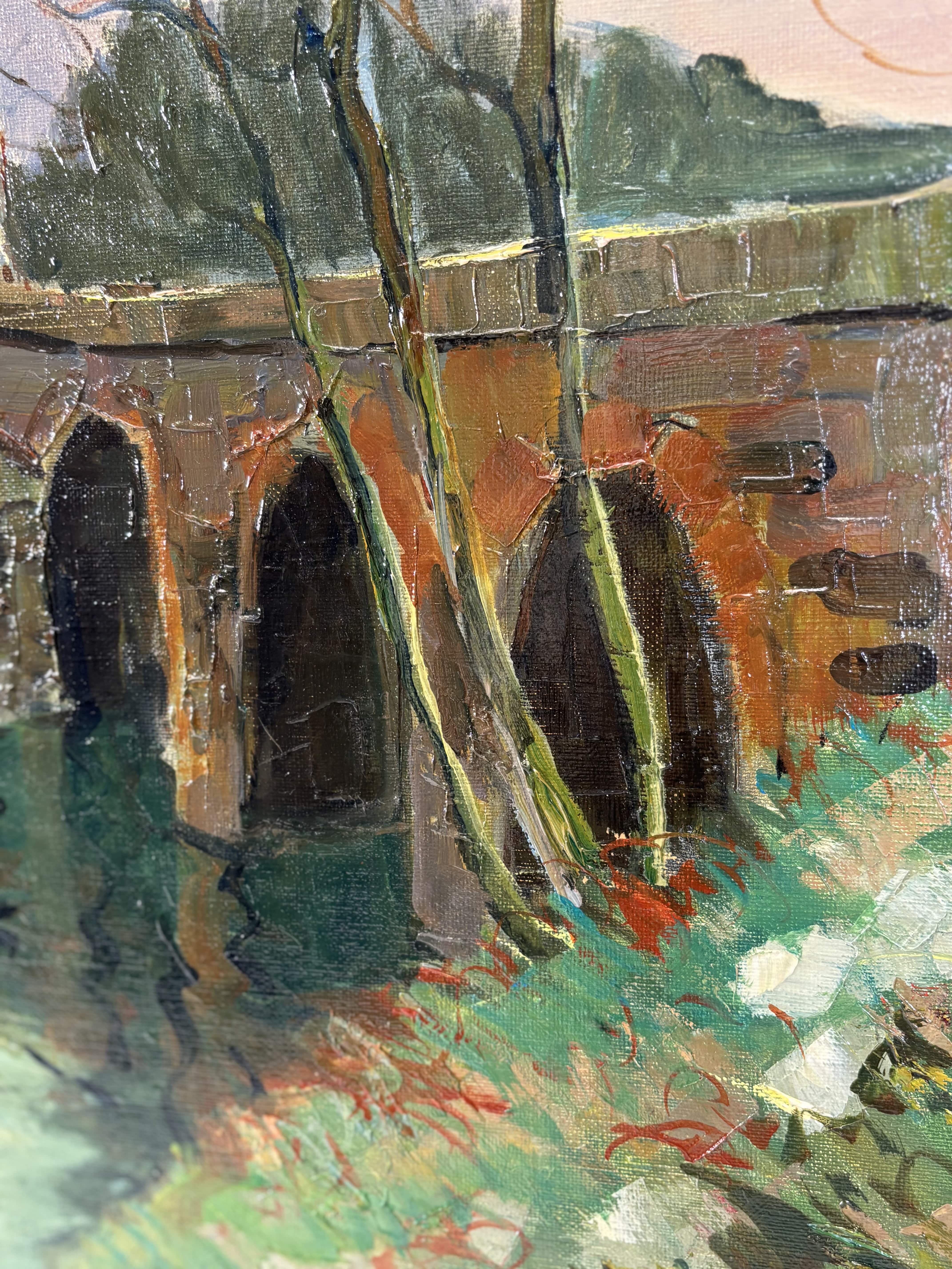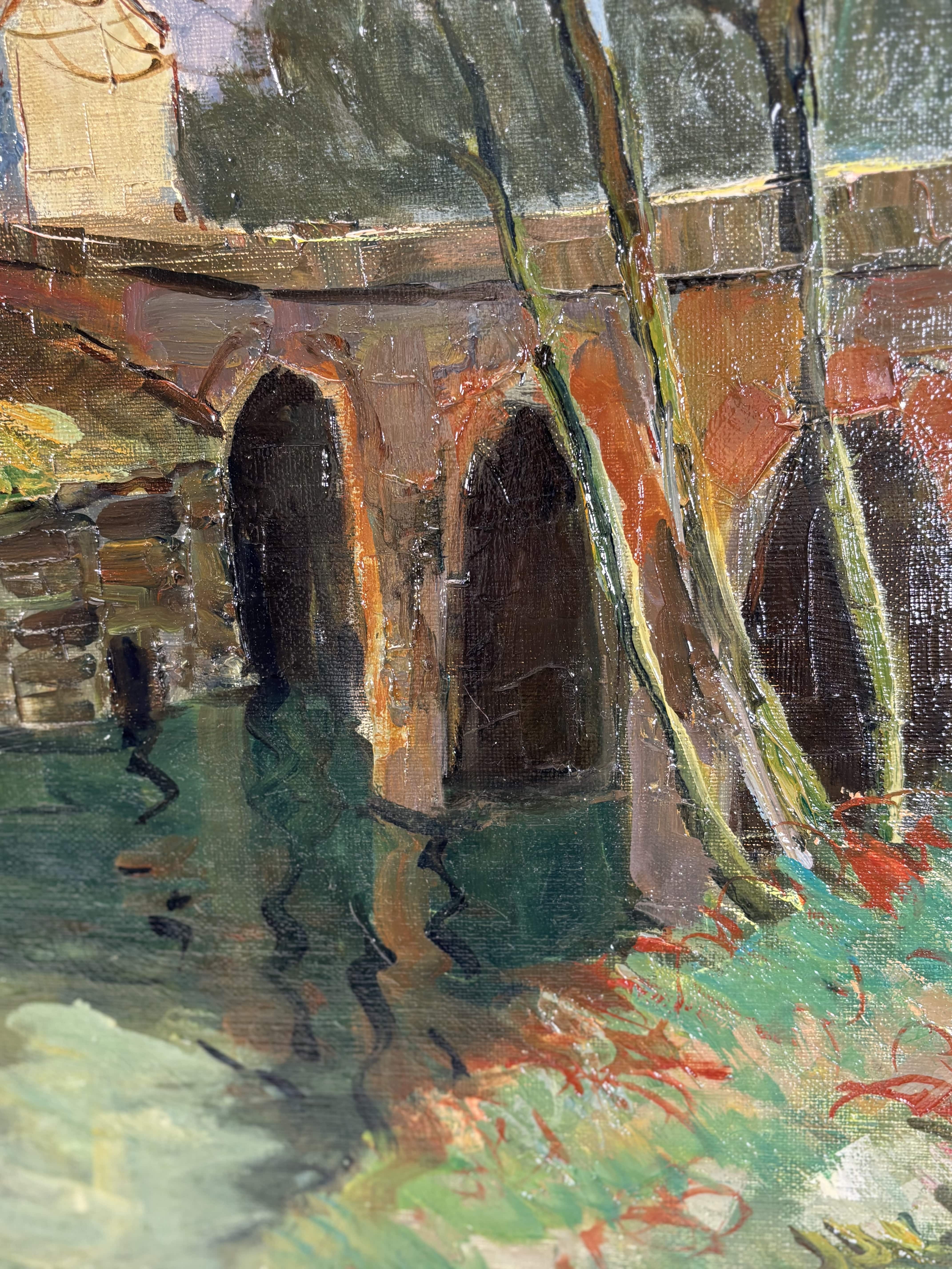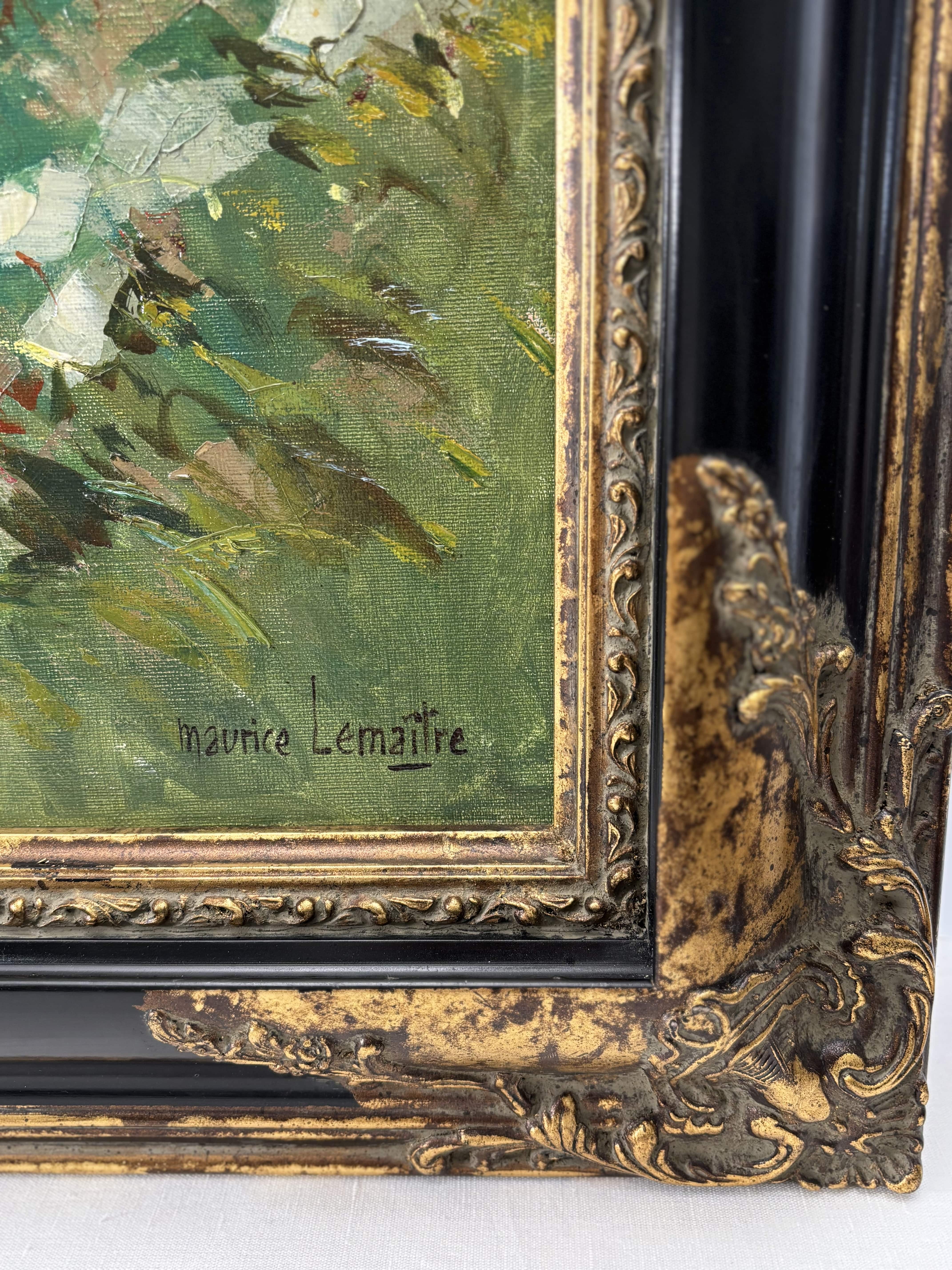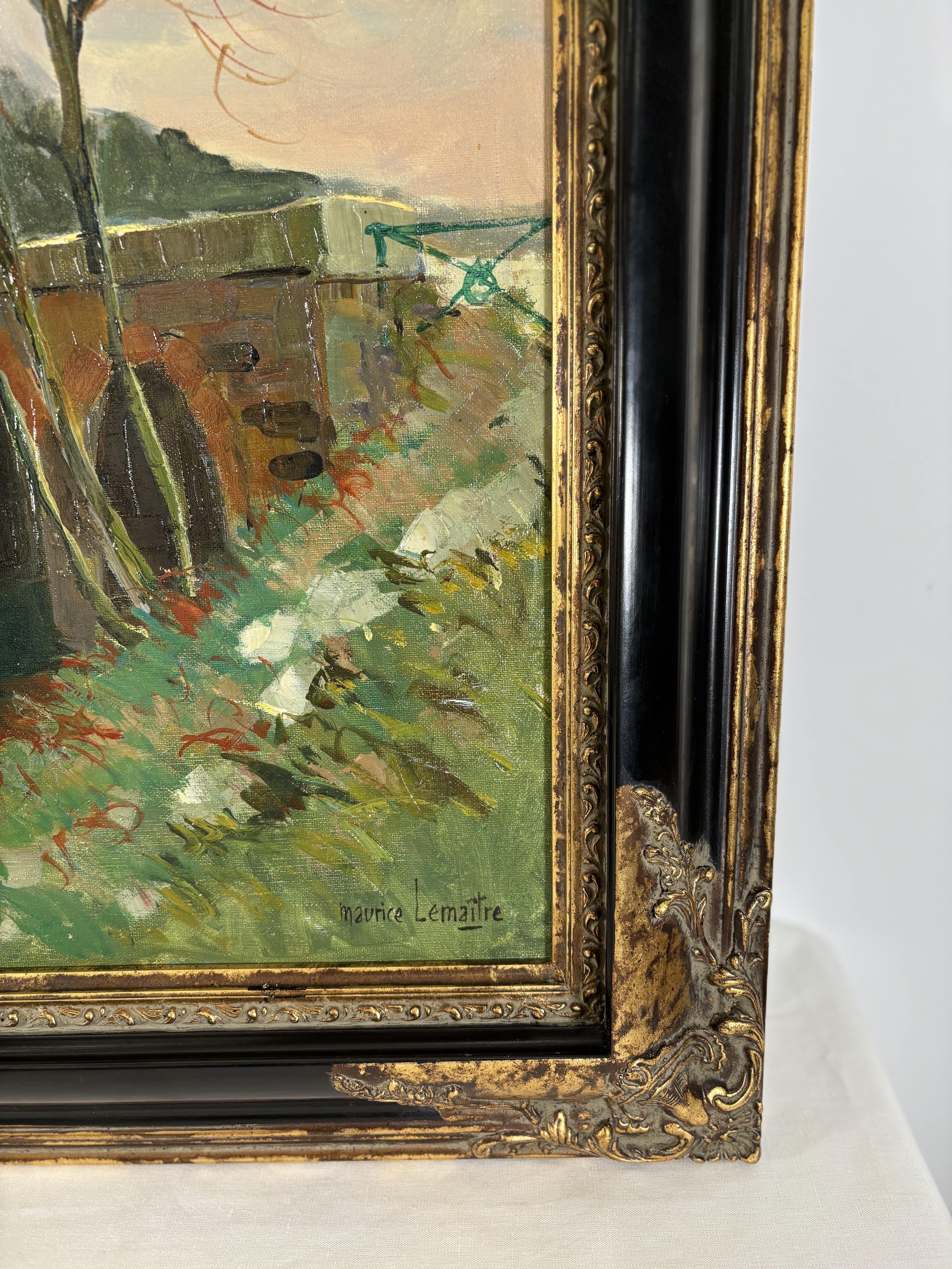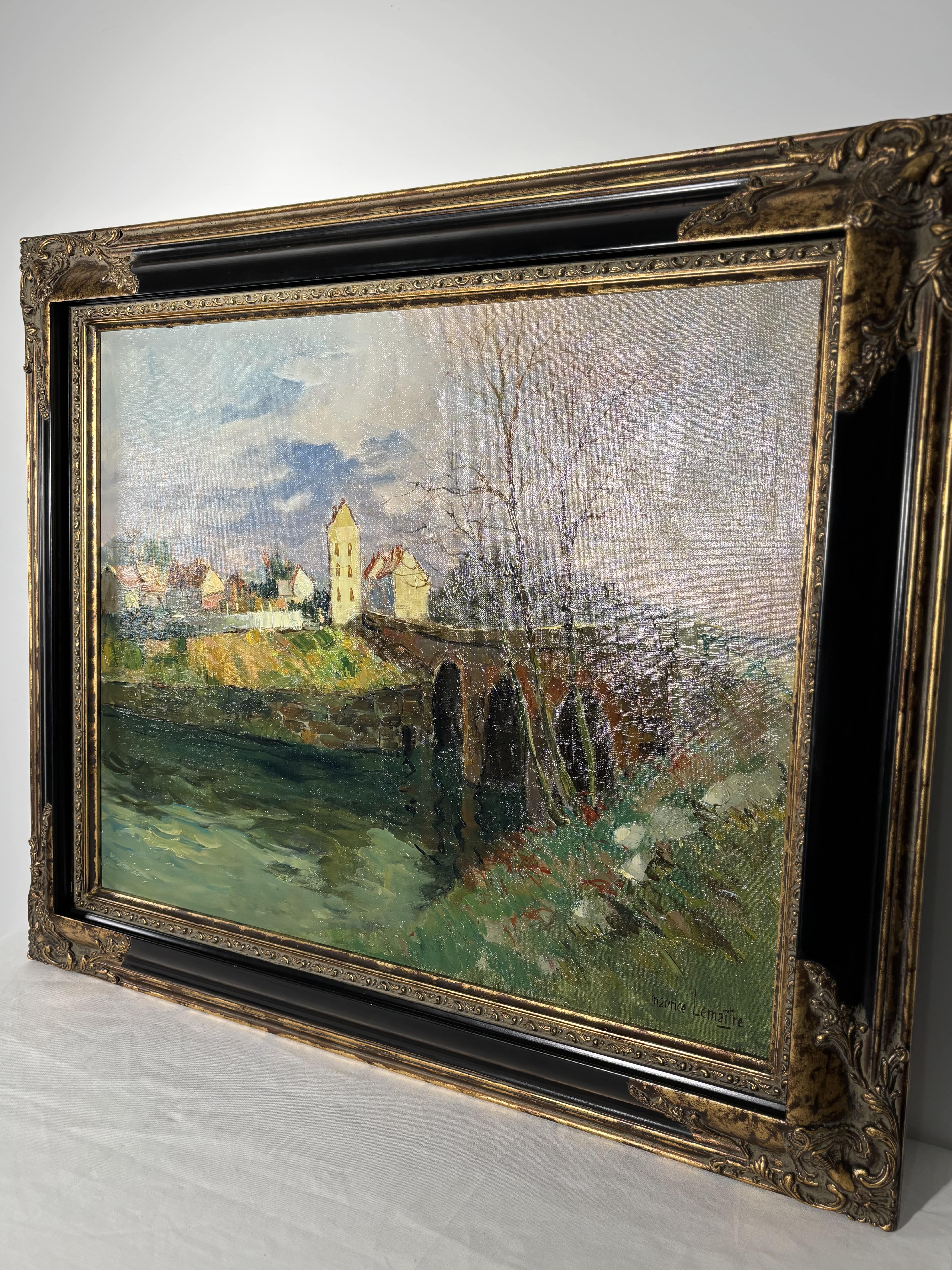 Huile sur toile représentant un paysage animé par un pont de pierre enjambant une rivière, attribuable à la veine post-impressioniste française du XXe siècle. La touche est libre, épaisse et très expressive, travaillée au couteau et au pinceau, avec une matière généreuse particulièrement visible dans les zones végétales et les maçonneries. La palette, dominée par des verts profonds, des ocres chauds et des bleus nuancés, restitue avec justesse une atmosphère lumineuse et vibrante. L'oeuvre est signée en bas à droite "Maurice Lemaire" artiste français du XXe siècle, connu pour ses paysages sensibles et construits, inscrits dans la tradition modernisée de la peinture de plein air. Le tableau est présenté dans un important cadre en bois sculpté peint et doré.