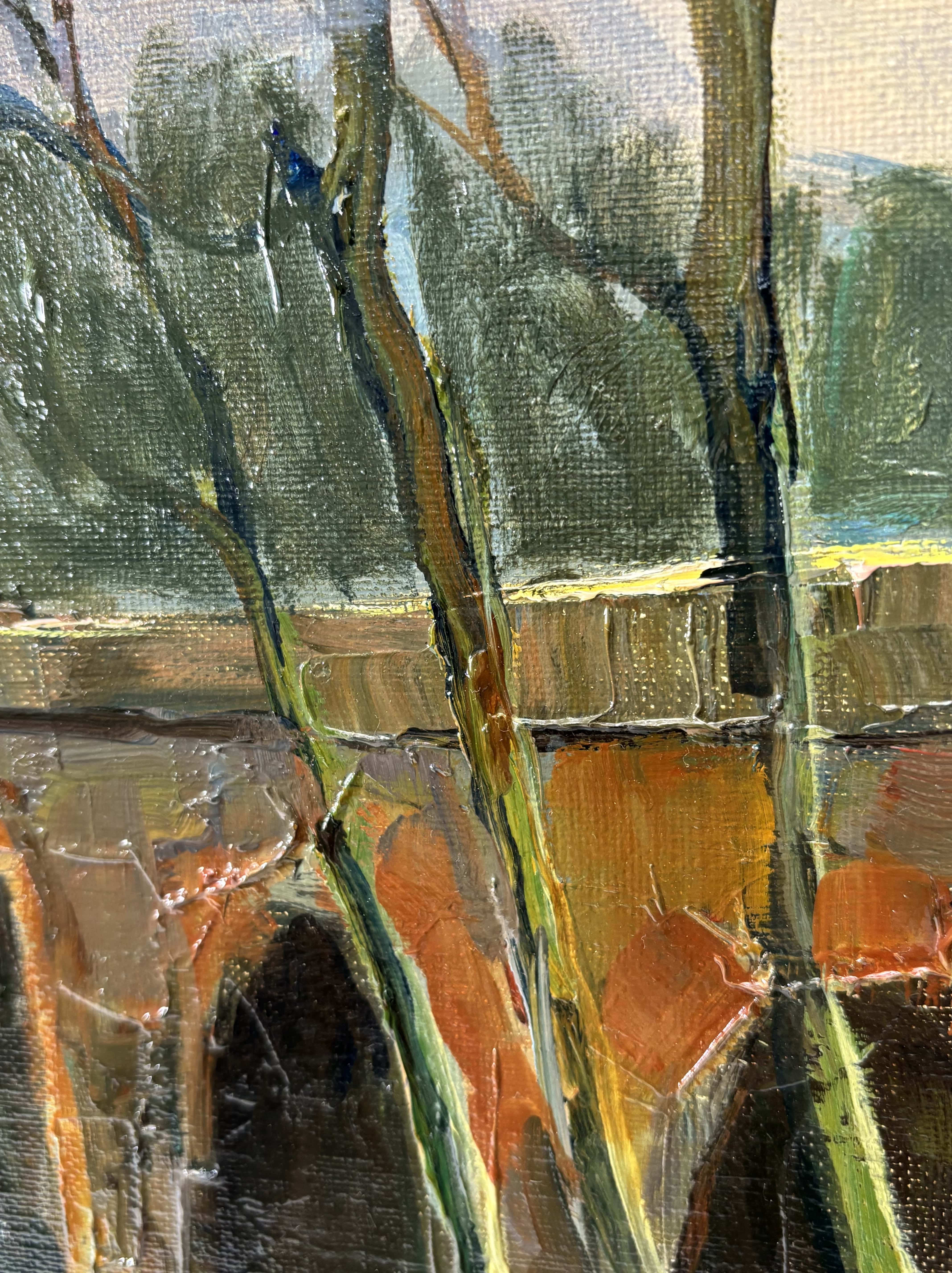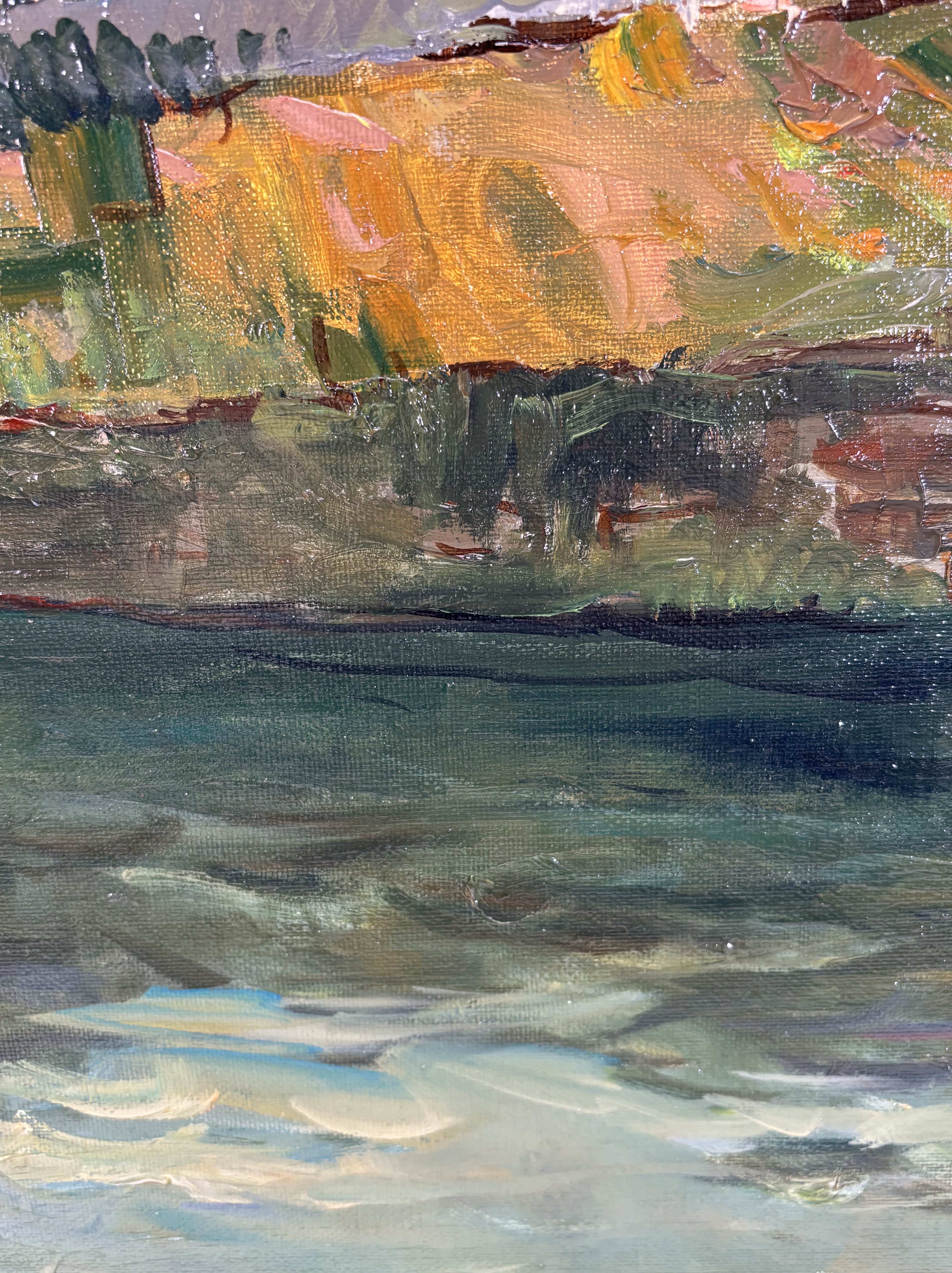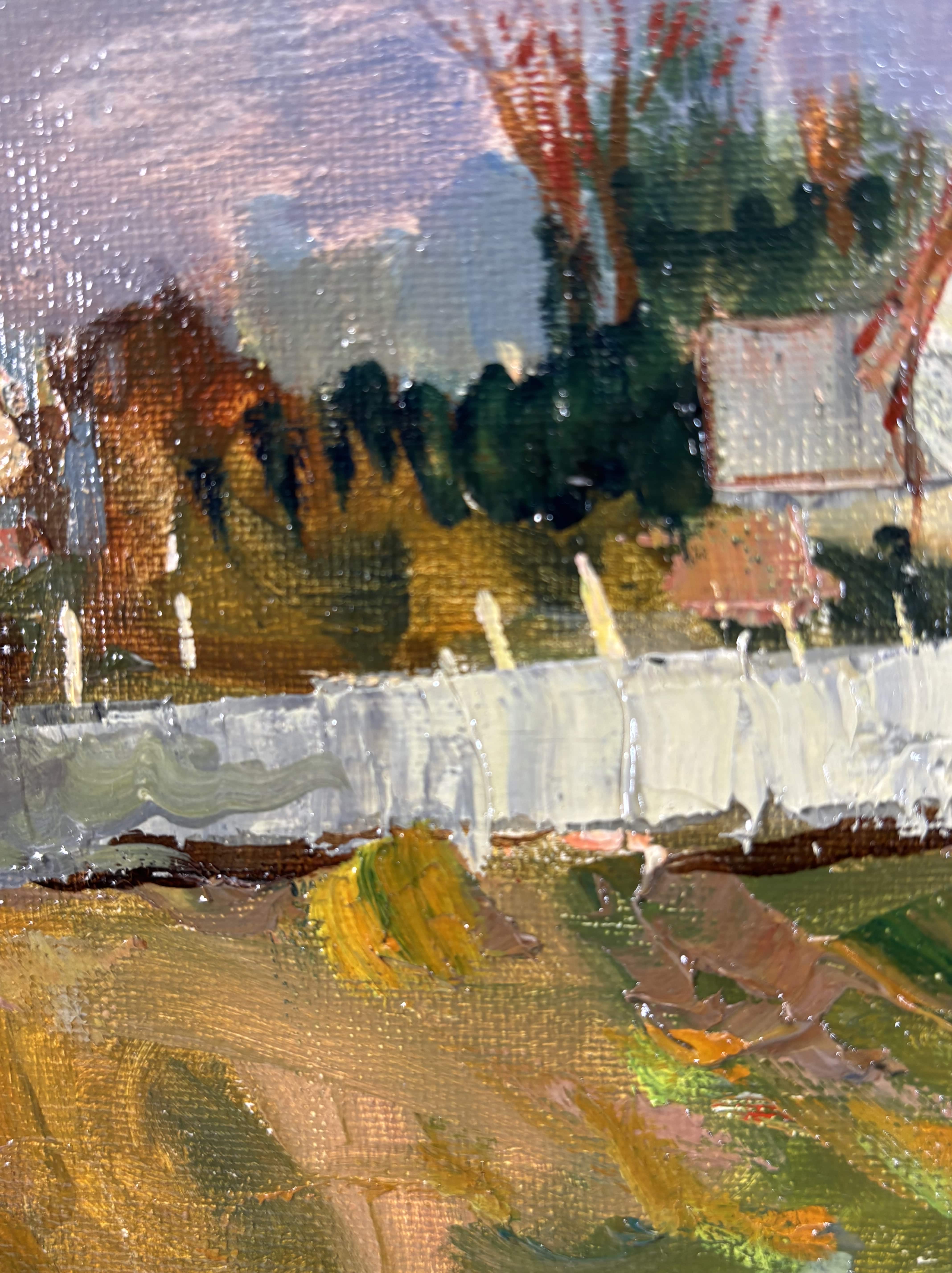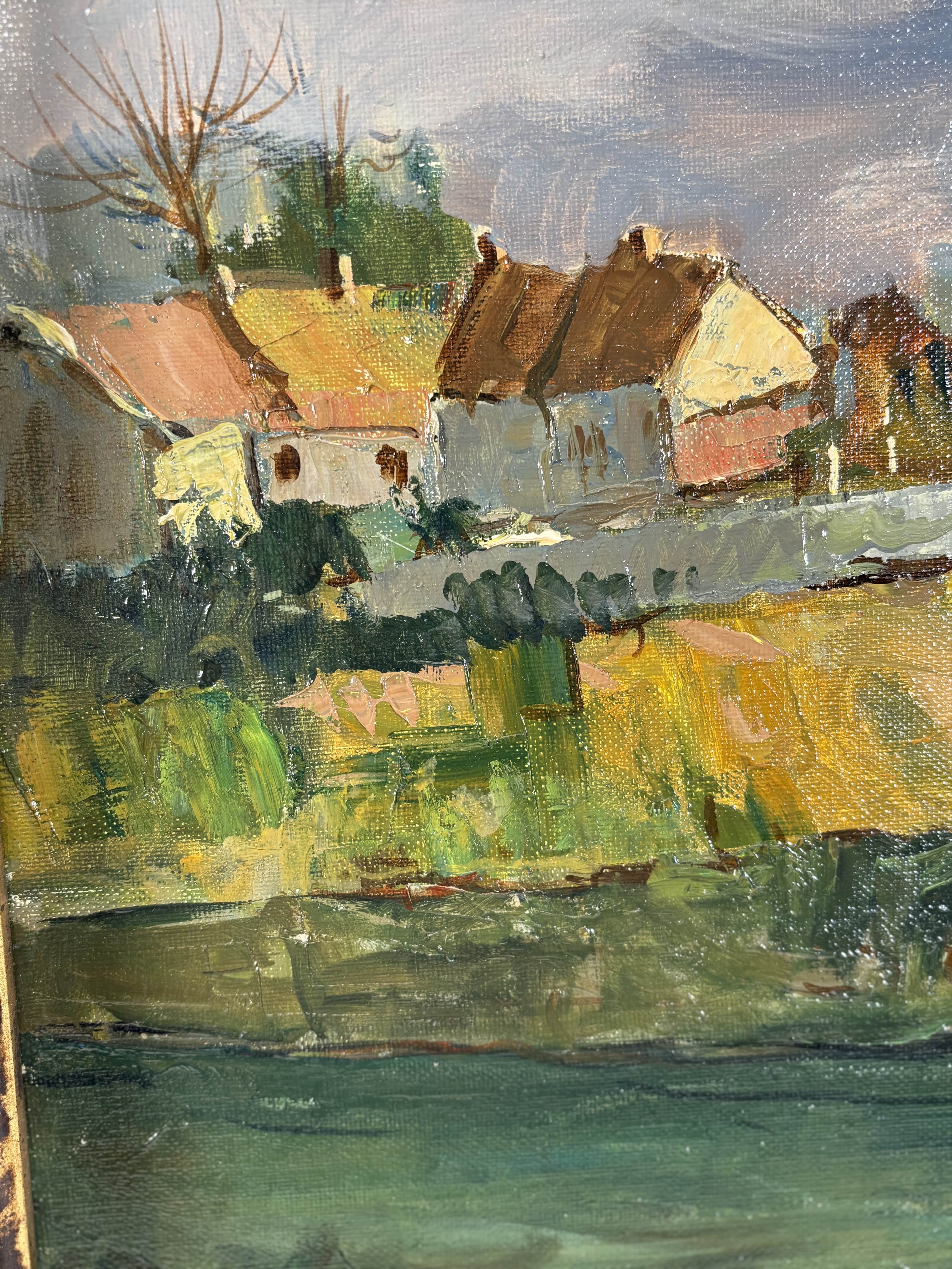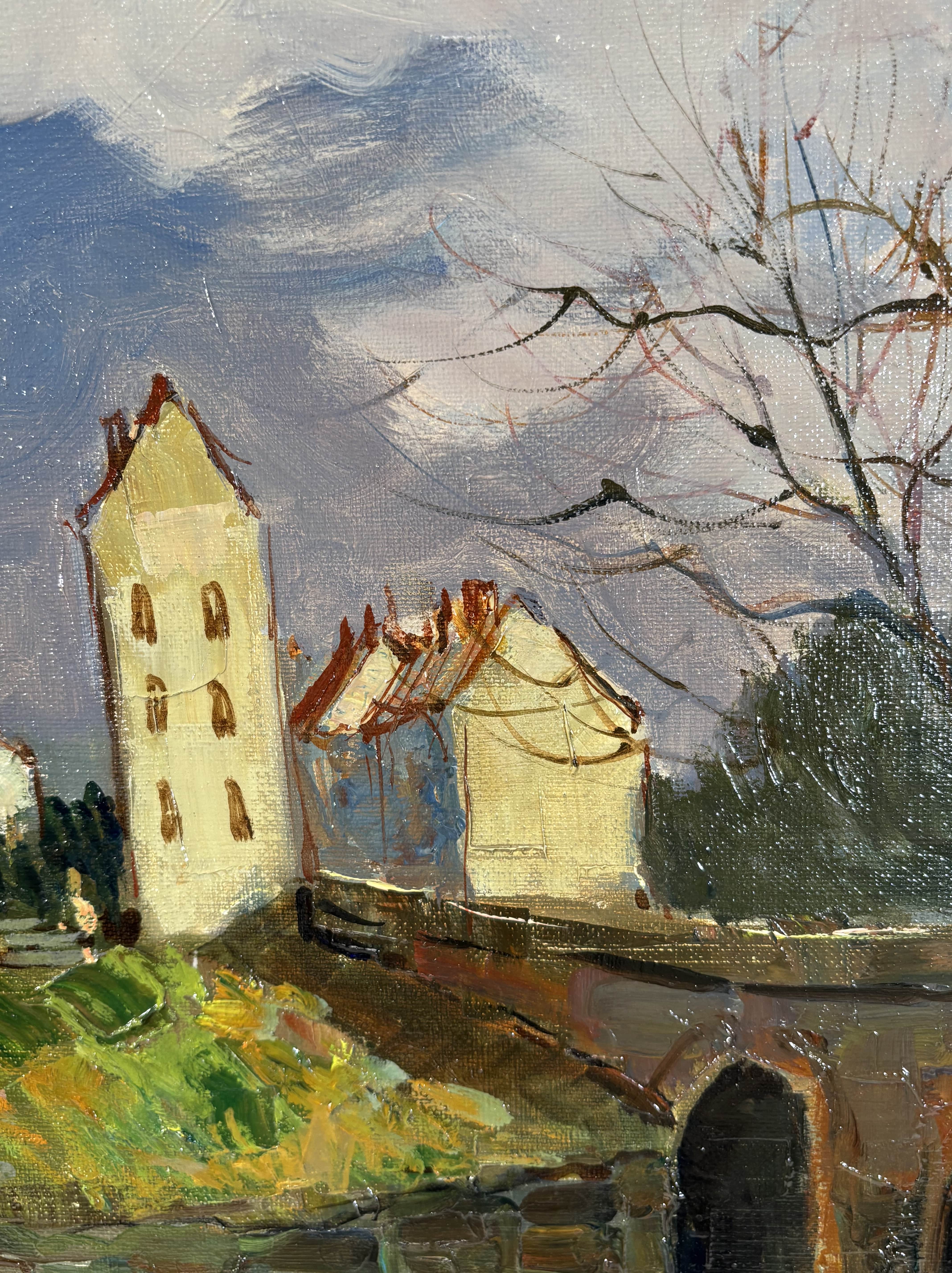 Huile sur toile représentant un paysage animé par un pont de pierre enjambant une rivière, attribuable à la veine post-impressioniste française du XXe siècle. La touche est libre, épaisse et très expressive, travaillée au couteau et au pinceau, avec une matière généreuse particulièrement visible dans les zones végétales et les maçonneries. La palette, dominée par des verts profonds, des ocres chauds et des bleus nuancés, restitue avec justesse une atmosphère lumineuse et vibrante. L'oeuvre est signée en bas à droite "Maurice Lemaire" artiste français du XXe siècle, connu pour ses paysages sensibles et construits, inscrits dans la tradition modernisée de la peinture de plein air. Le tableau est présenté dans un important cadre en bois sculpté peint et doré.