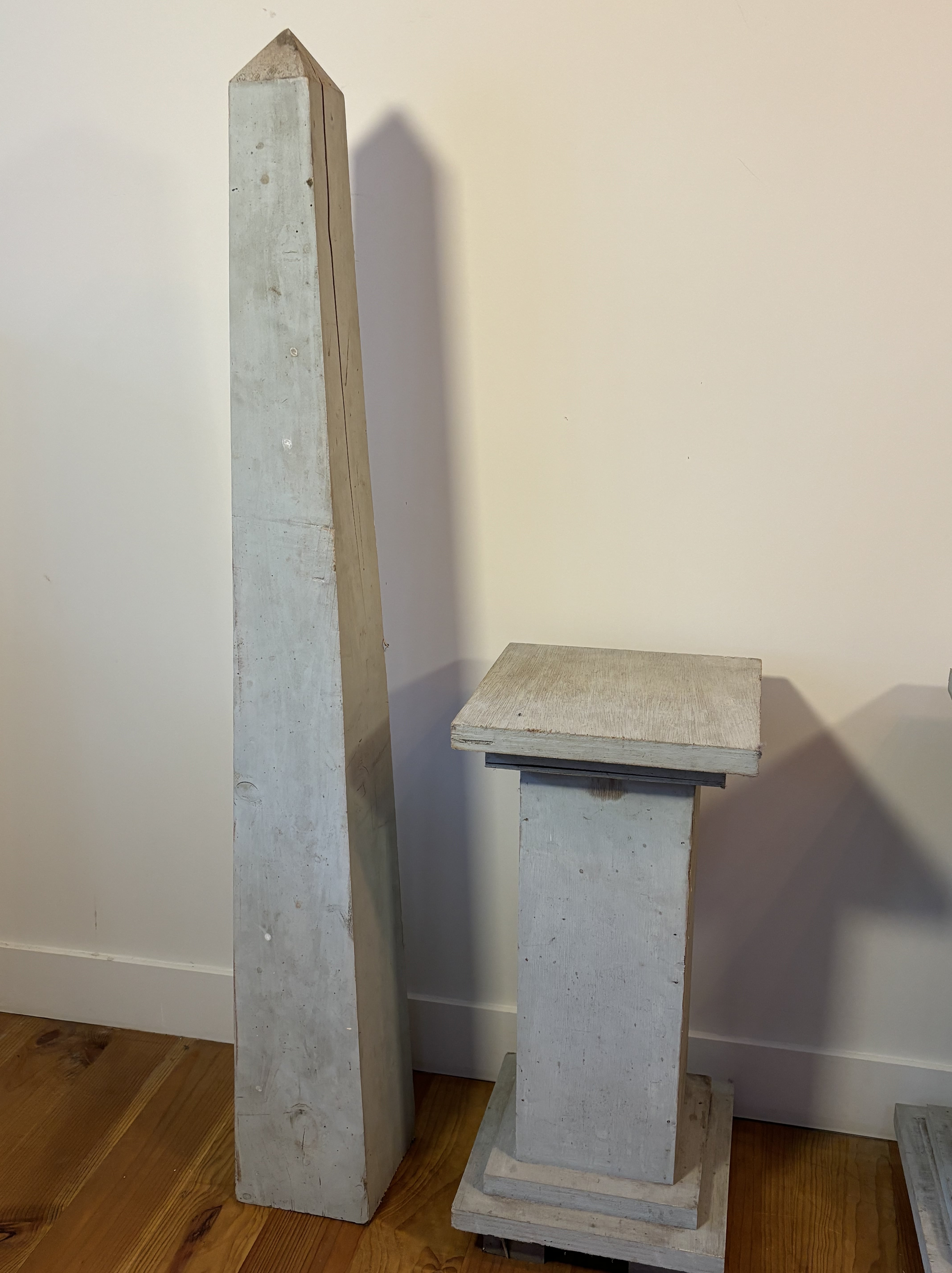 Elégante paire d'Obélisques Sur Socles, En Bois Peint Patiné, 20e siècle