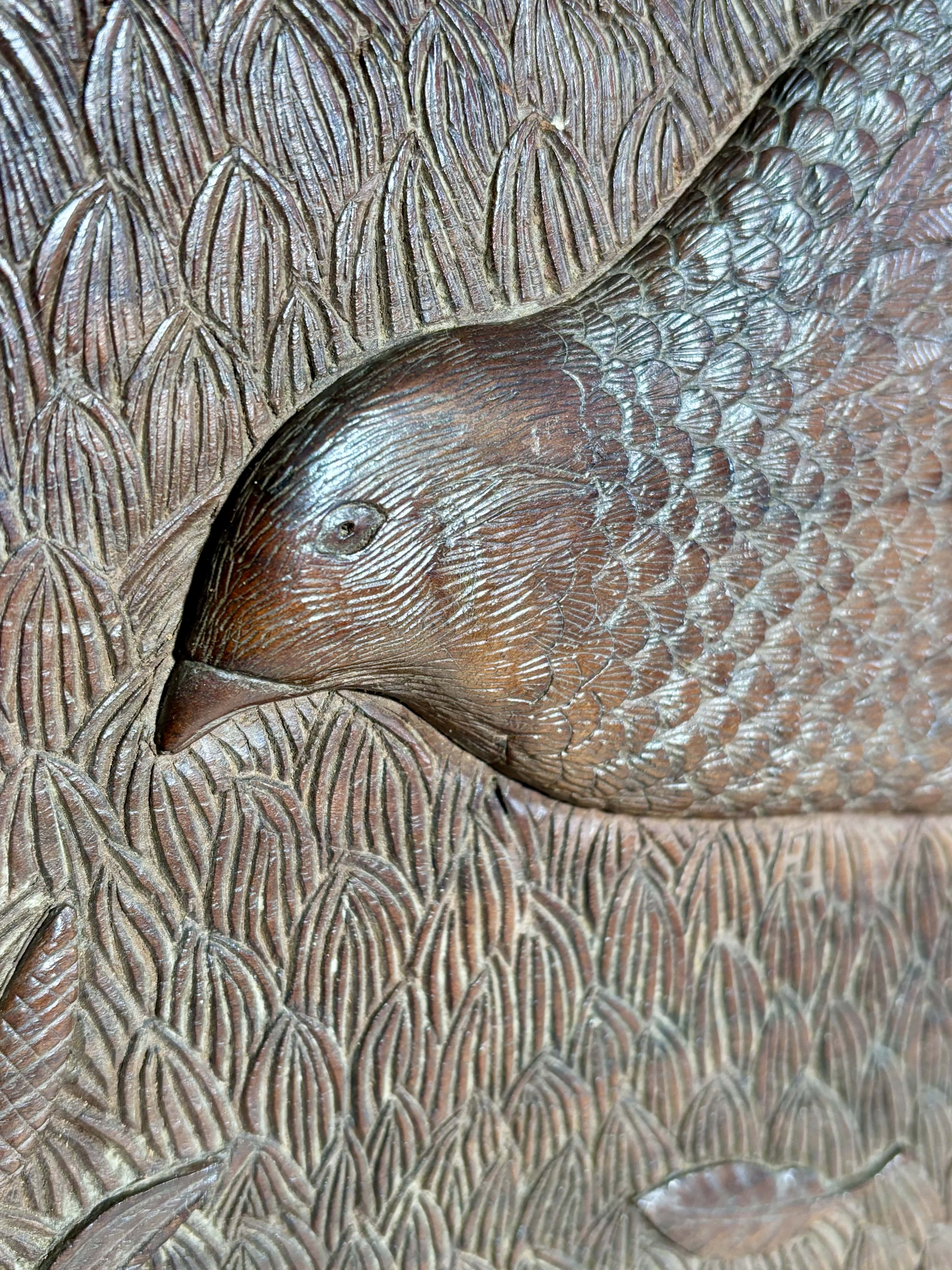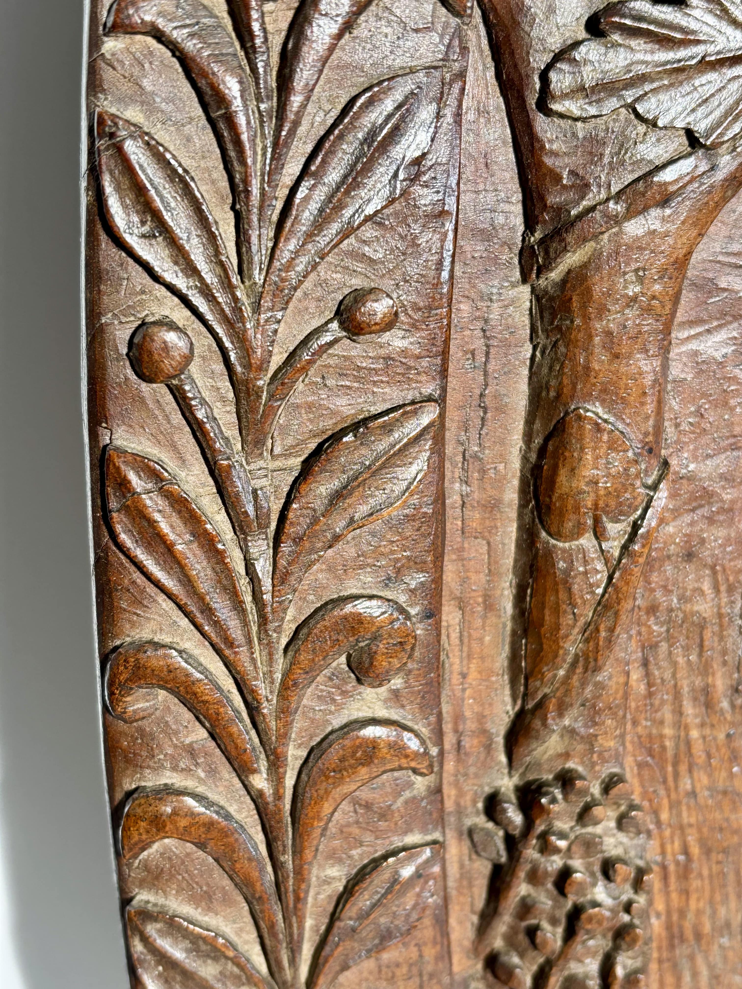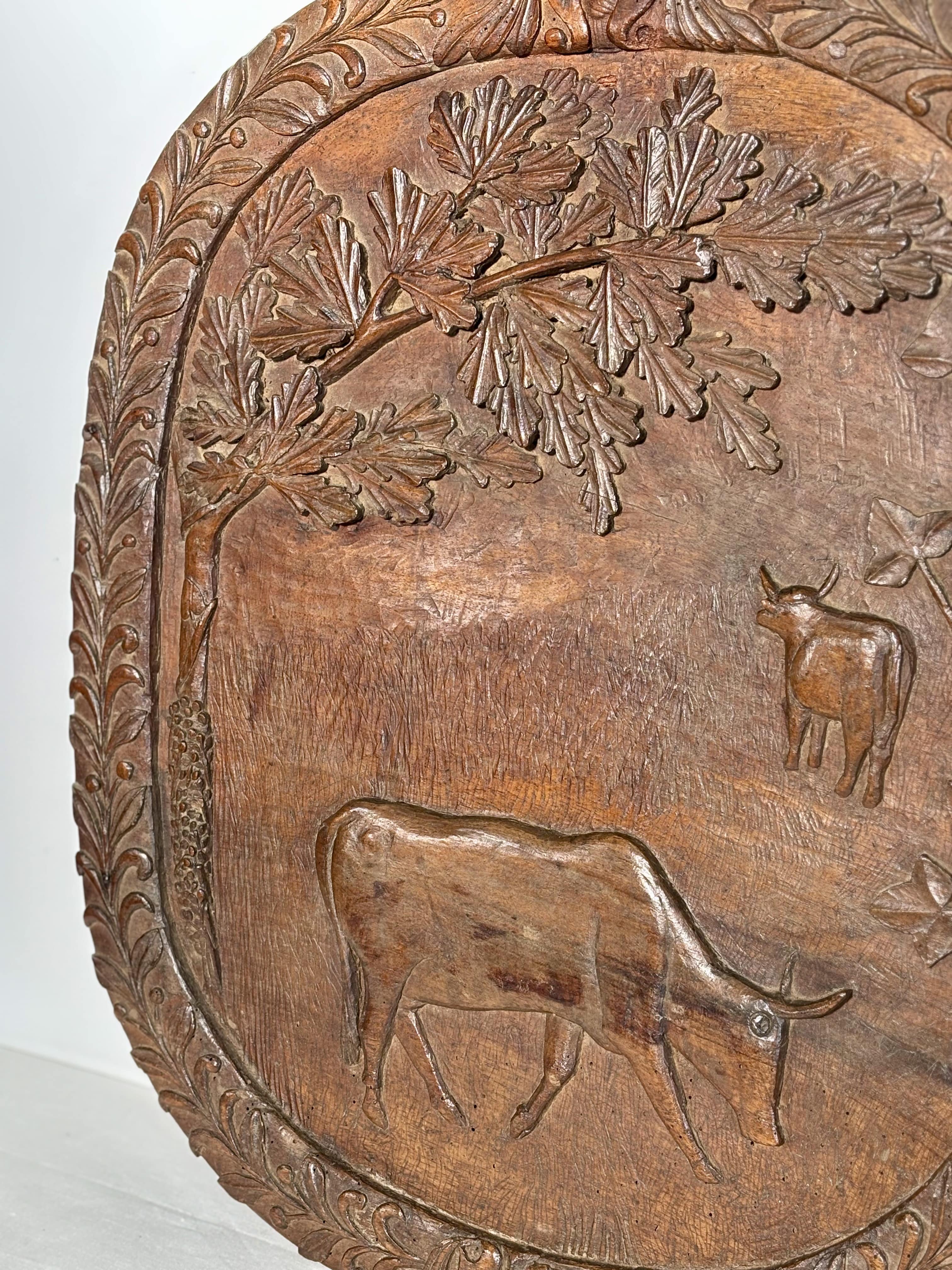 Ensemble de trois panneaux en bois sculpté, réalisés en monoxyle, représentant des scènes animalières. Chaque panneau est taillé dans un seul bloc de bois et présente un relief profond, un trait franc, ainsi qu'un bel ensemble de motifs végétaux, feuillages et encadrements entièrement sculptés à la main. Les scènes représentent une jument et son poulain, un bovin au pâturage et une perdrix dans un décor rural, typiques du répertoire pastoral de la fin du XIXe et début XXe siècle. Le revers laissé brut montre des traces d'outils et confirme un travail traditionnel et authentique d'artisan. Très belle patine ancienne.