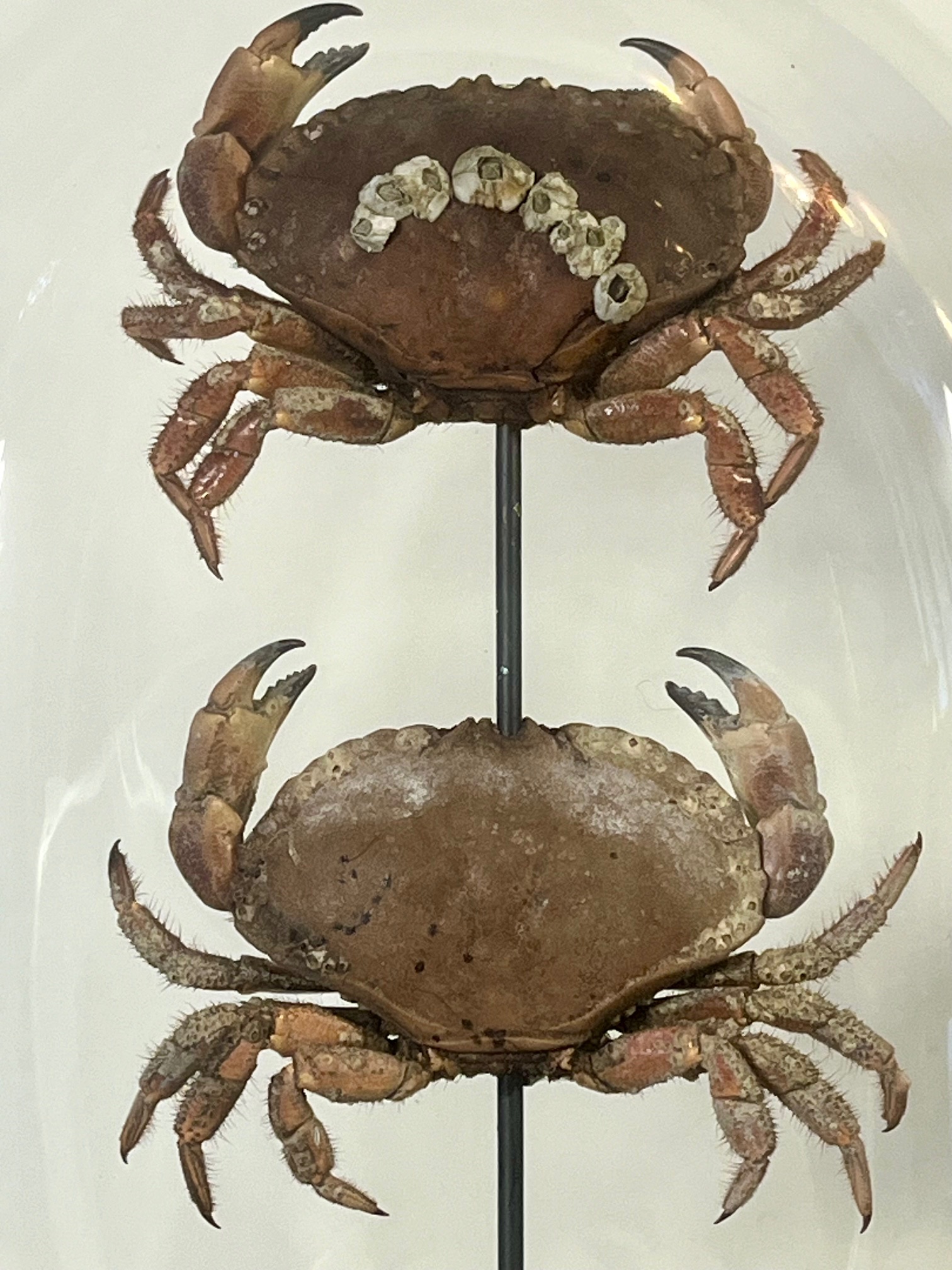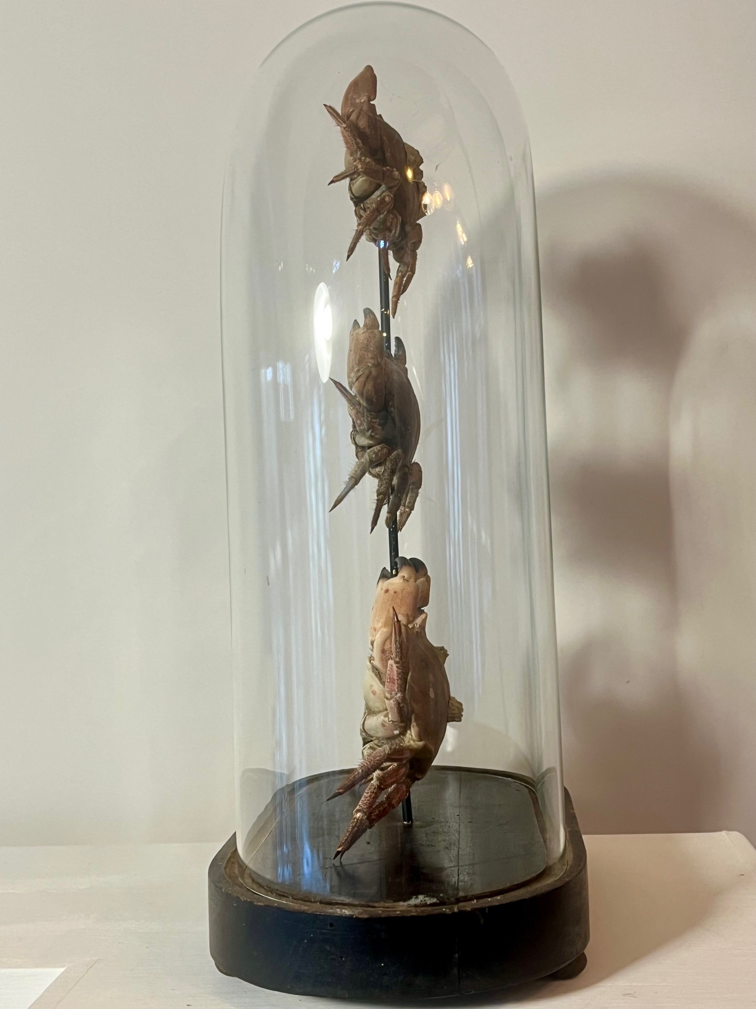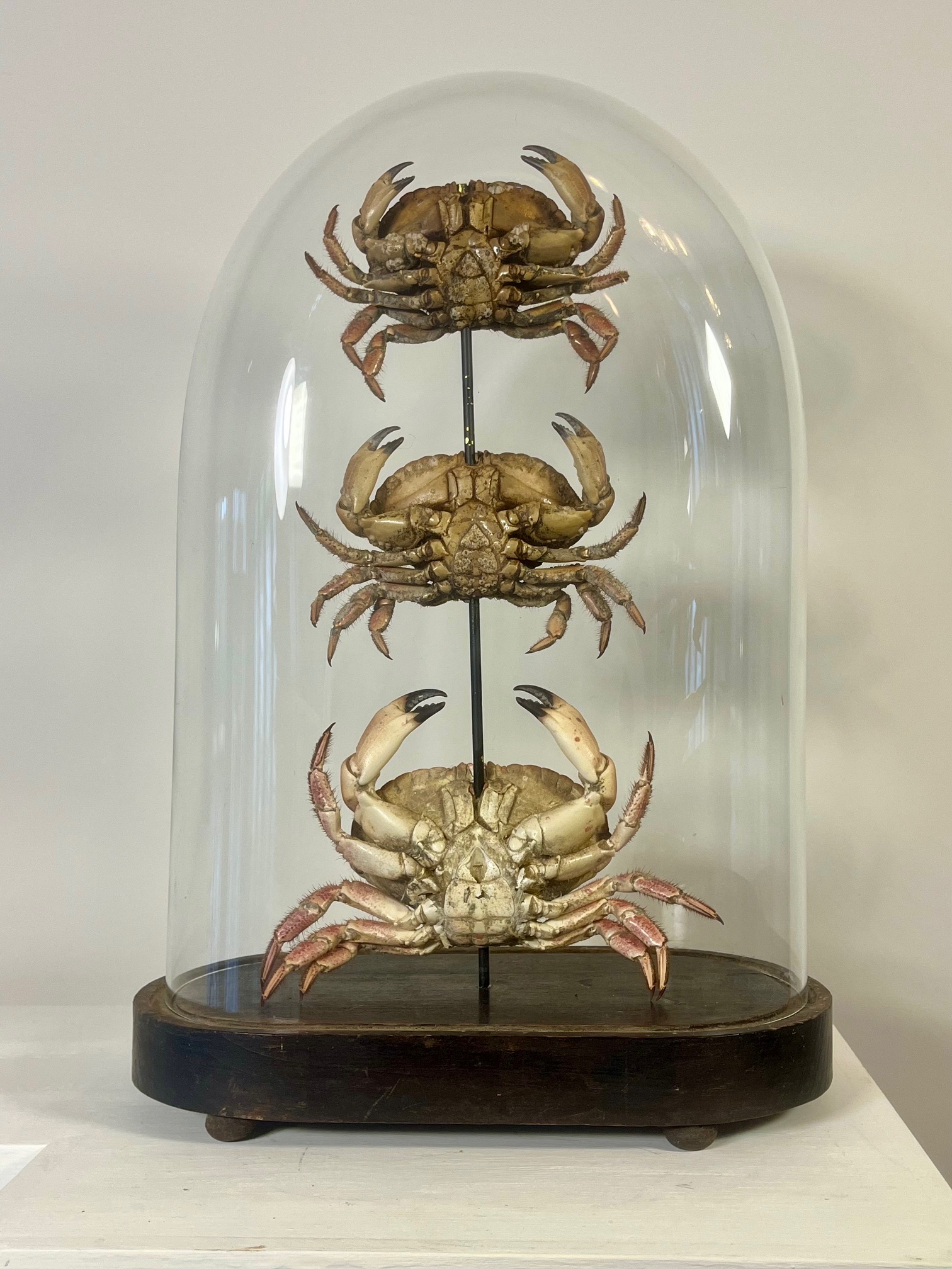Globe de mariée Napoléon III orné d’une pyramide de trois crabes tourteaux naturalisés. Cet objet rare, conçu pour les cabinets de curiosité, est très graphique. Il constitue une pièce unique et exotique mêlant l’esthétique du 19e siècle à des éléments naturalistes.