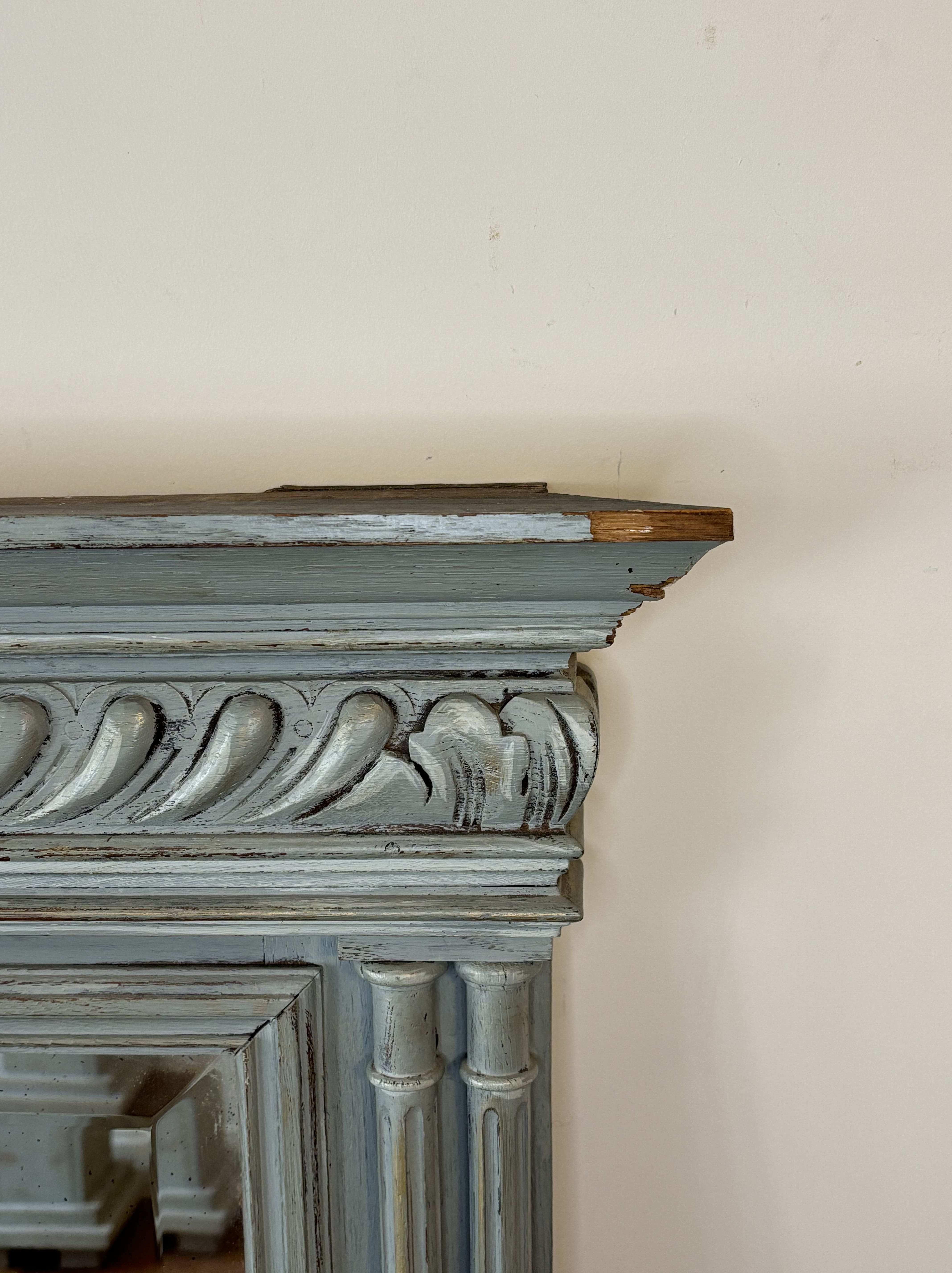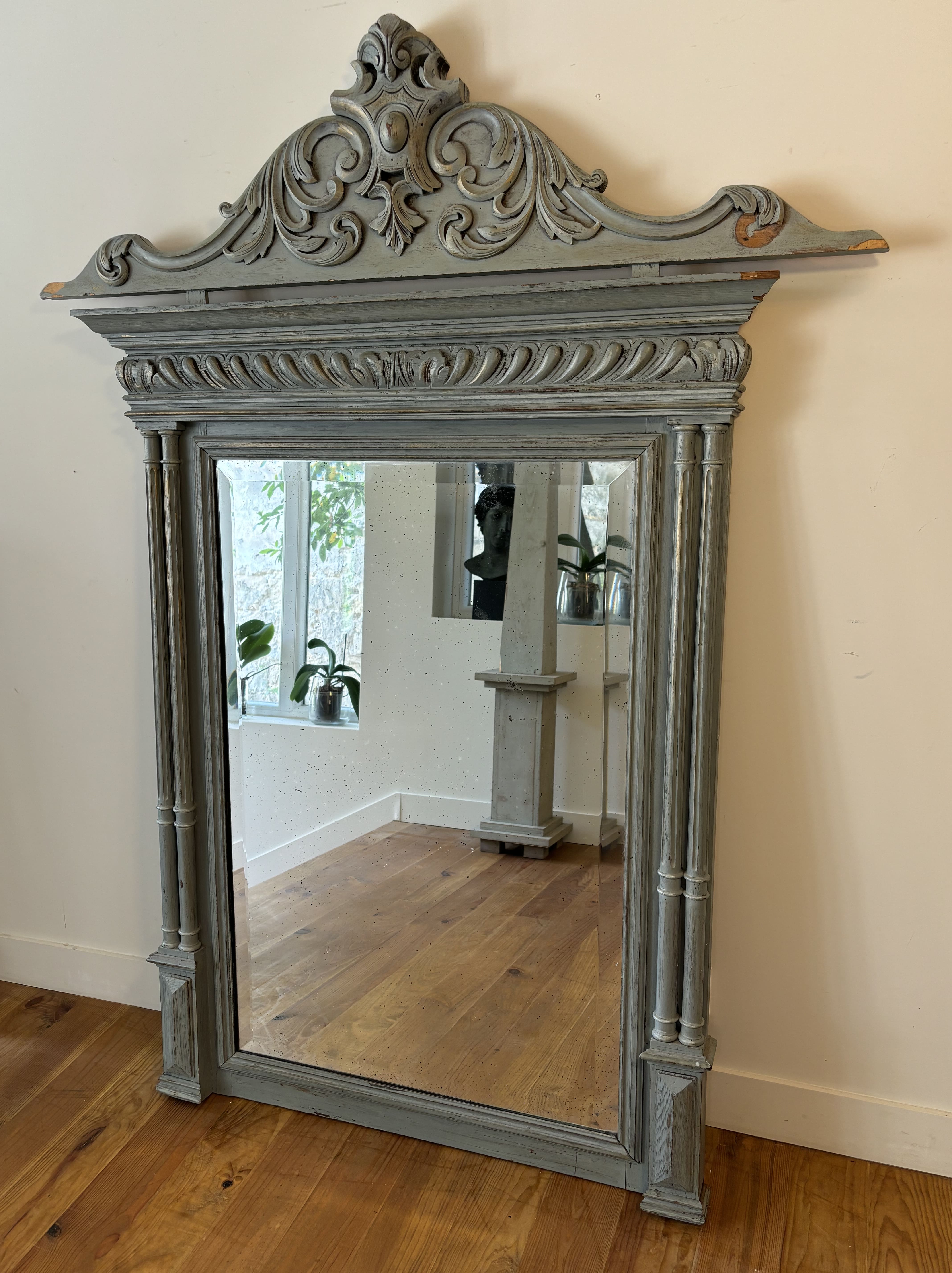 Grand miroir ornemental à corniche en bois patiné gris. Fronton rapporté et amovible. Miroir à double colonnes de chaque côté avec piédestal. Miroir au mercure d'origine. Jolie patine.