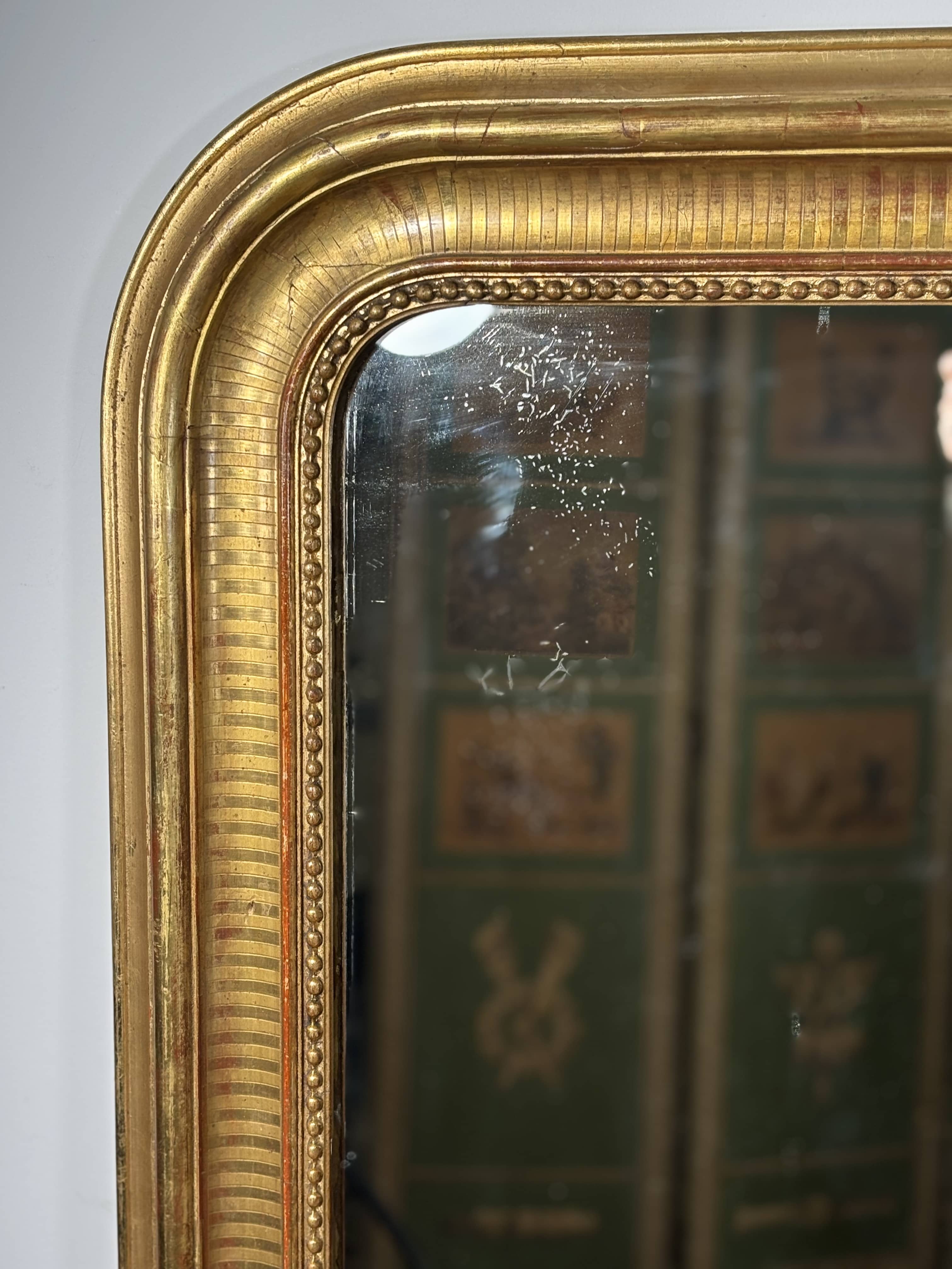 Grand miroir de cheminée d'époque Louis-Philippe en bois mouluré et stuqué, doré à la feuille d'or sur assiette rouge. Angles supérieurs arrondis et base droite, la signature caractéristique de cette production française du troisième quart du XIXe siècle.