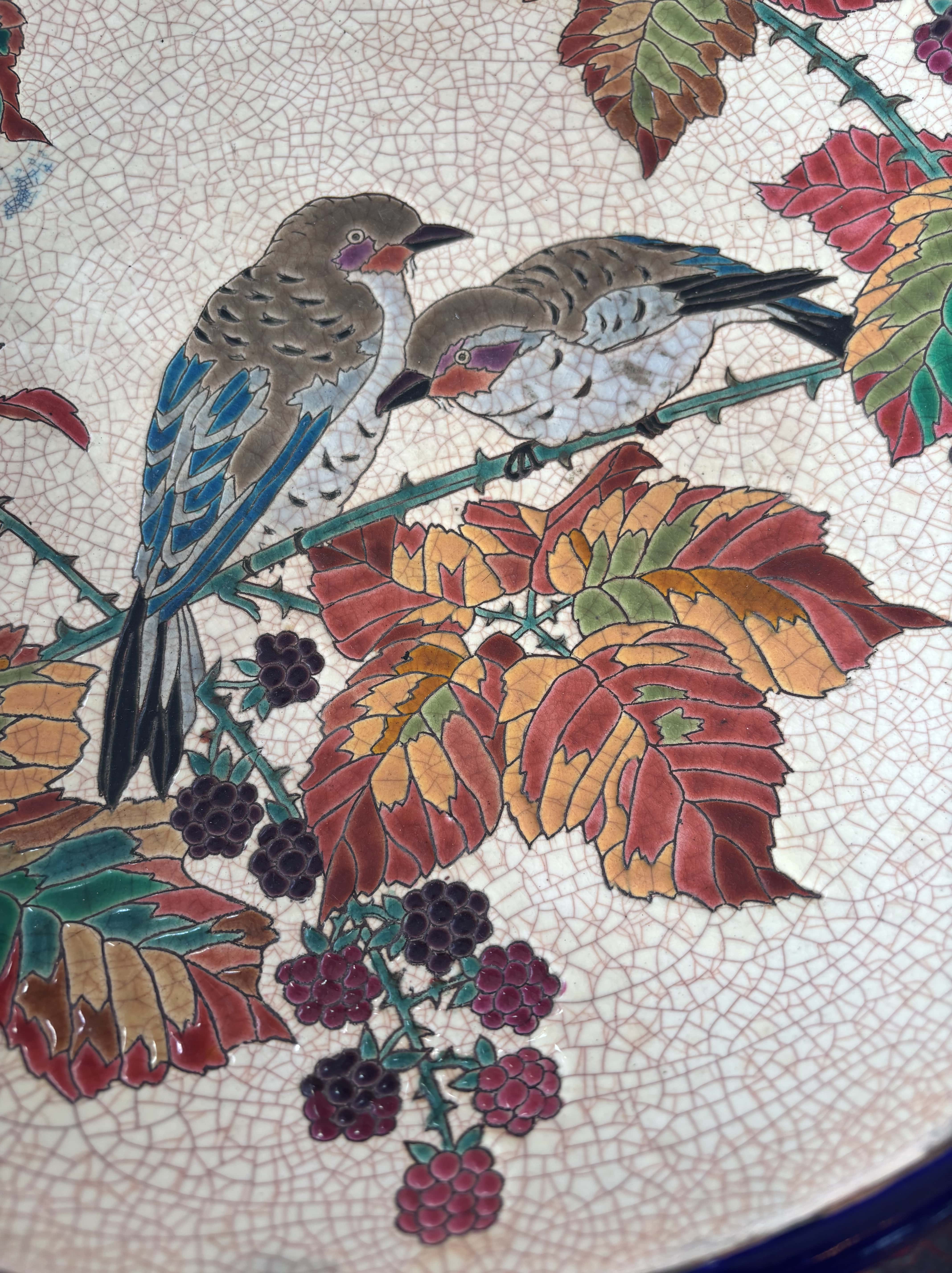 Grand plat circulaire en émaux cloisonnés de Longwy, décoré à la main. La composition polychrome représente deux oiseaux perchés sur une branche de ronce chargée de mûres, entourée de larges feuillages aux couleurs automnales. Le fond ivoire à réseau de craquelures caractéristiques met en valeur la vivacité des émaux, soulignés par un filet bleu profond sur le marli. Au revers, cachet "Emaux de Longwy - Décoré à la main - France", utilisé entre 1950 et 1955. Numéroté.