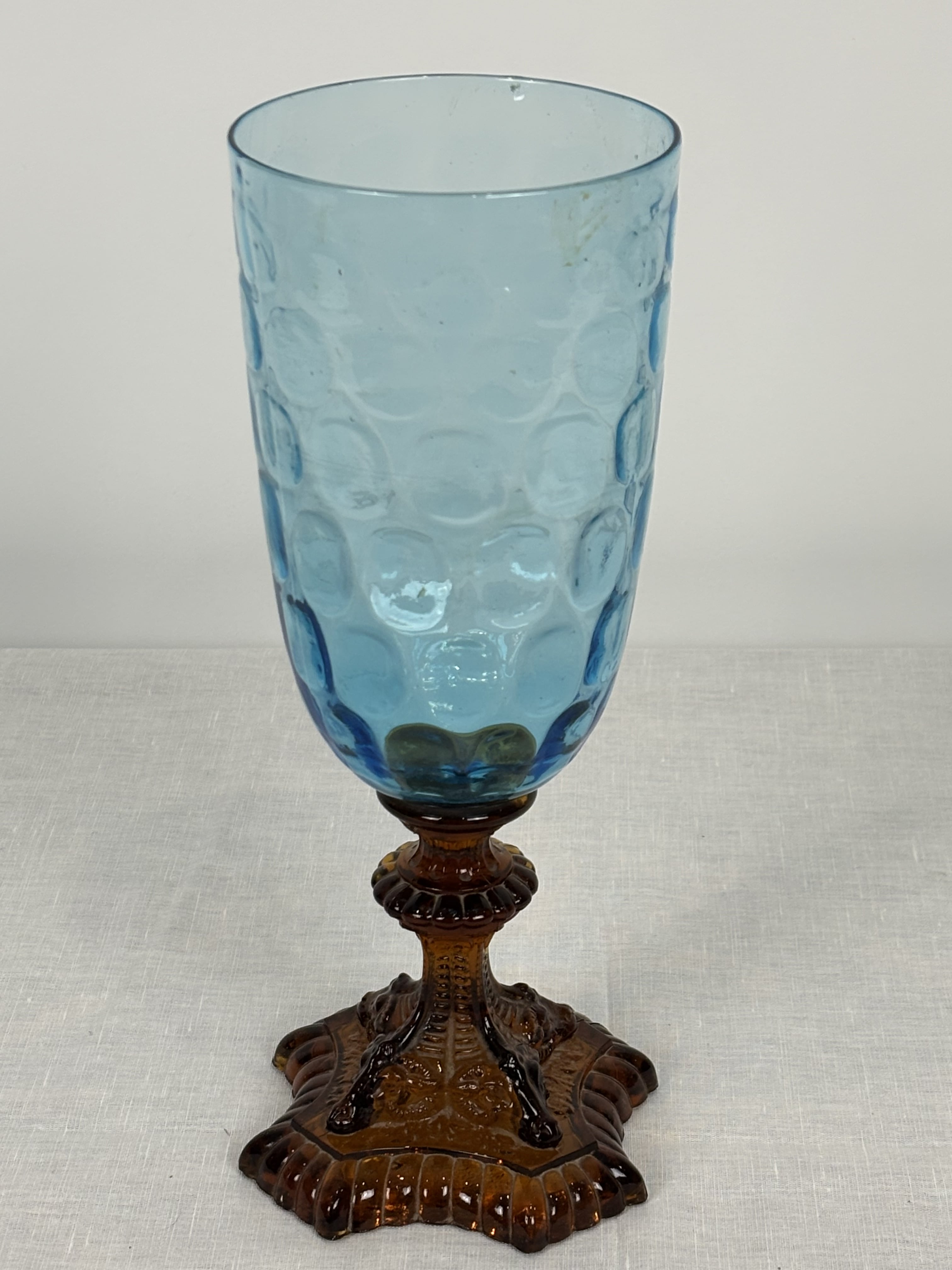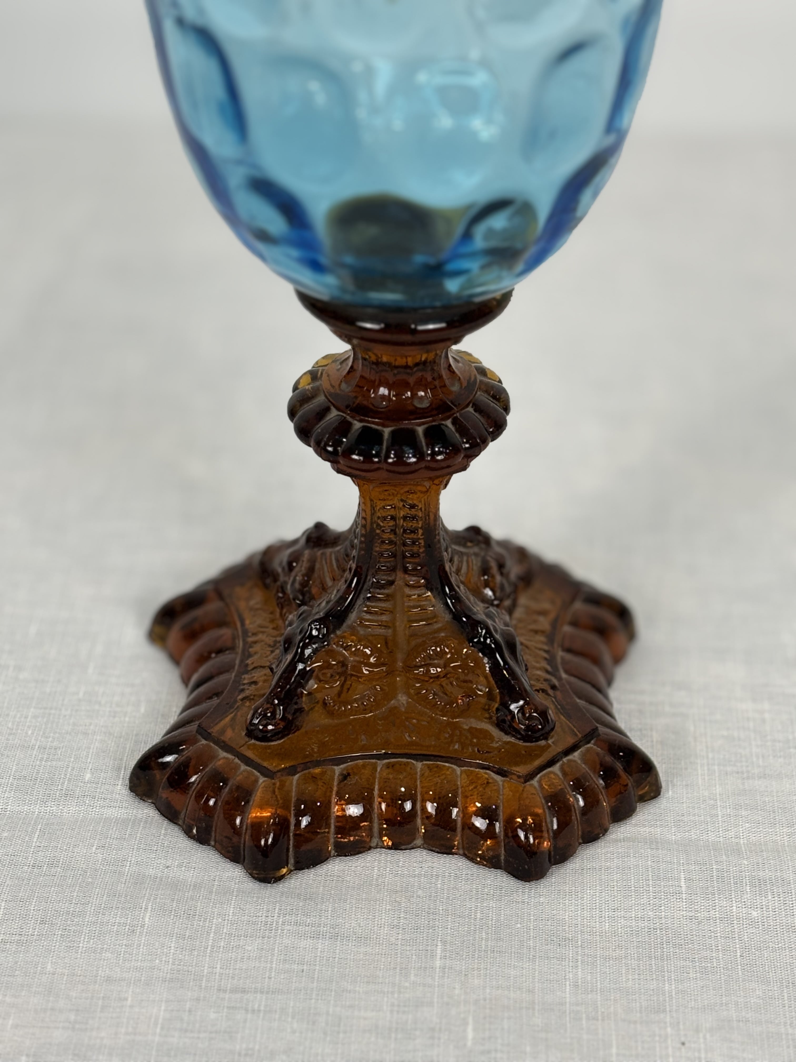 Elégant et grand vase ancien en verre pressé de la cristallerie de Portieux (1705-2012), modèle George Sand, coupe bleu turquoise et piètement ambre à tête de bélier. Le modèle George Sand signé Portieux a été pressé vers 1900. Fondée en 1705, la cristallerie a travaillé au fil des siècles pour les tables les plus prestigieuses, pour le tsar Nicolas II de Russie, l'écrivaine George Sand ou le Ritz.