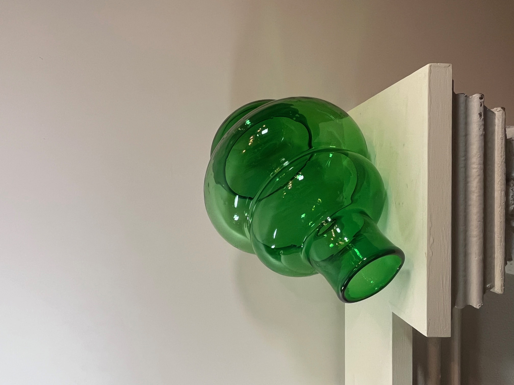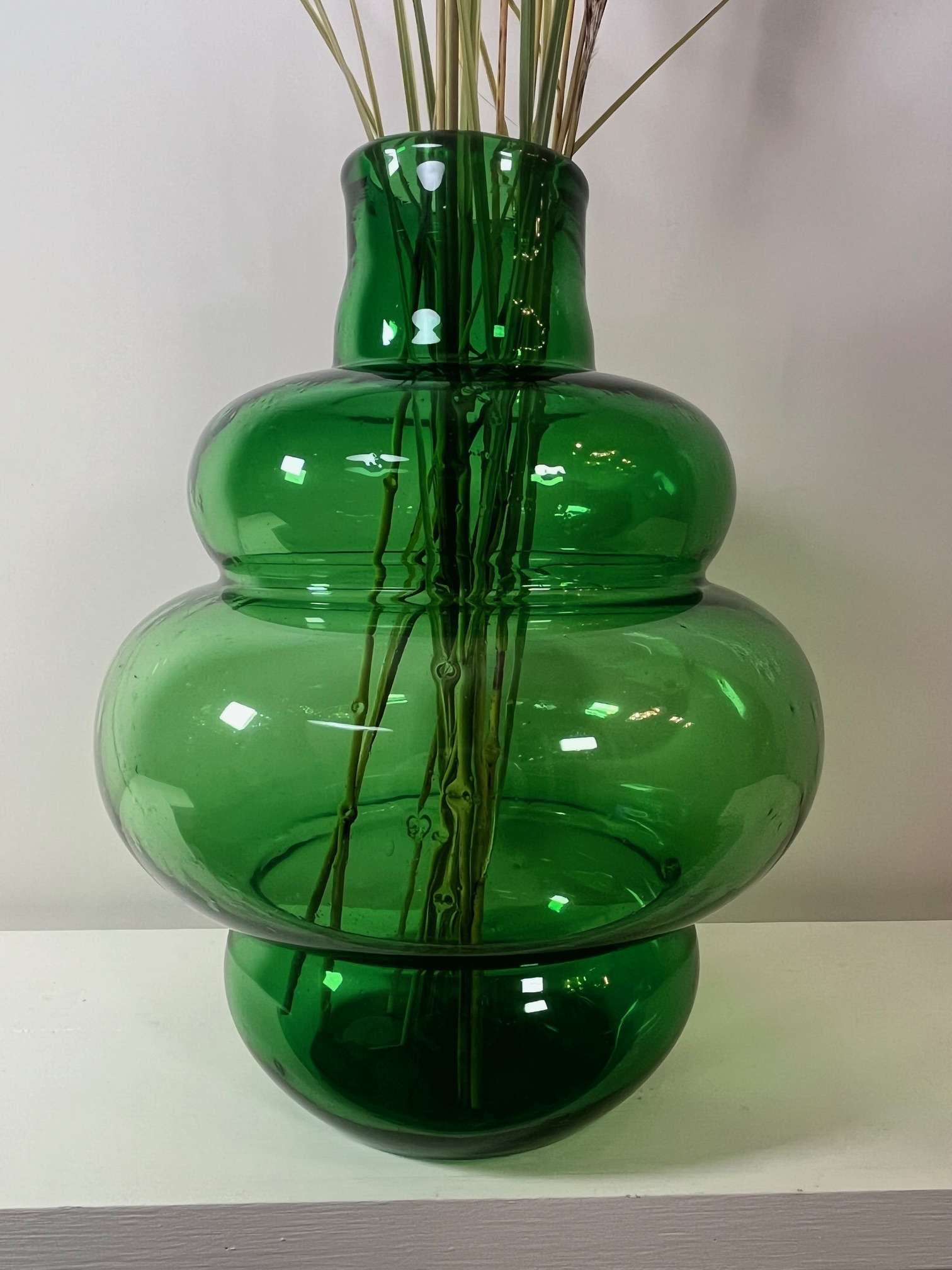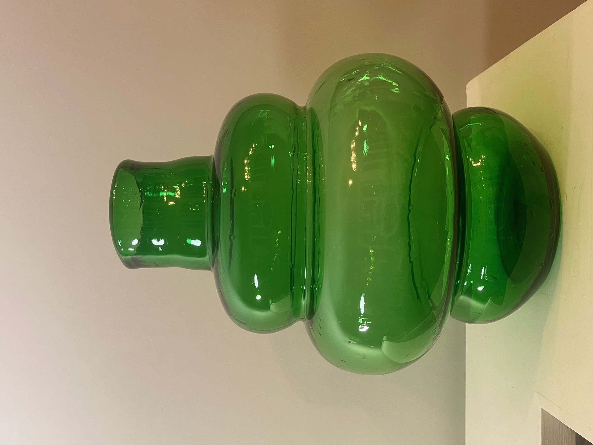 Grand vase vintage à trois lobes en verre soufflé, tout en courbes, belle couleur verte, provenance Transylvanie. Très graphique.