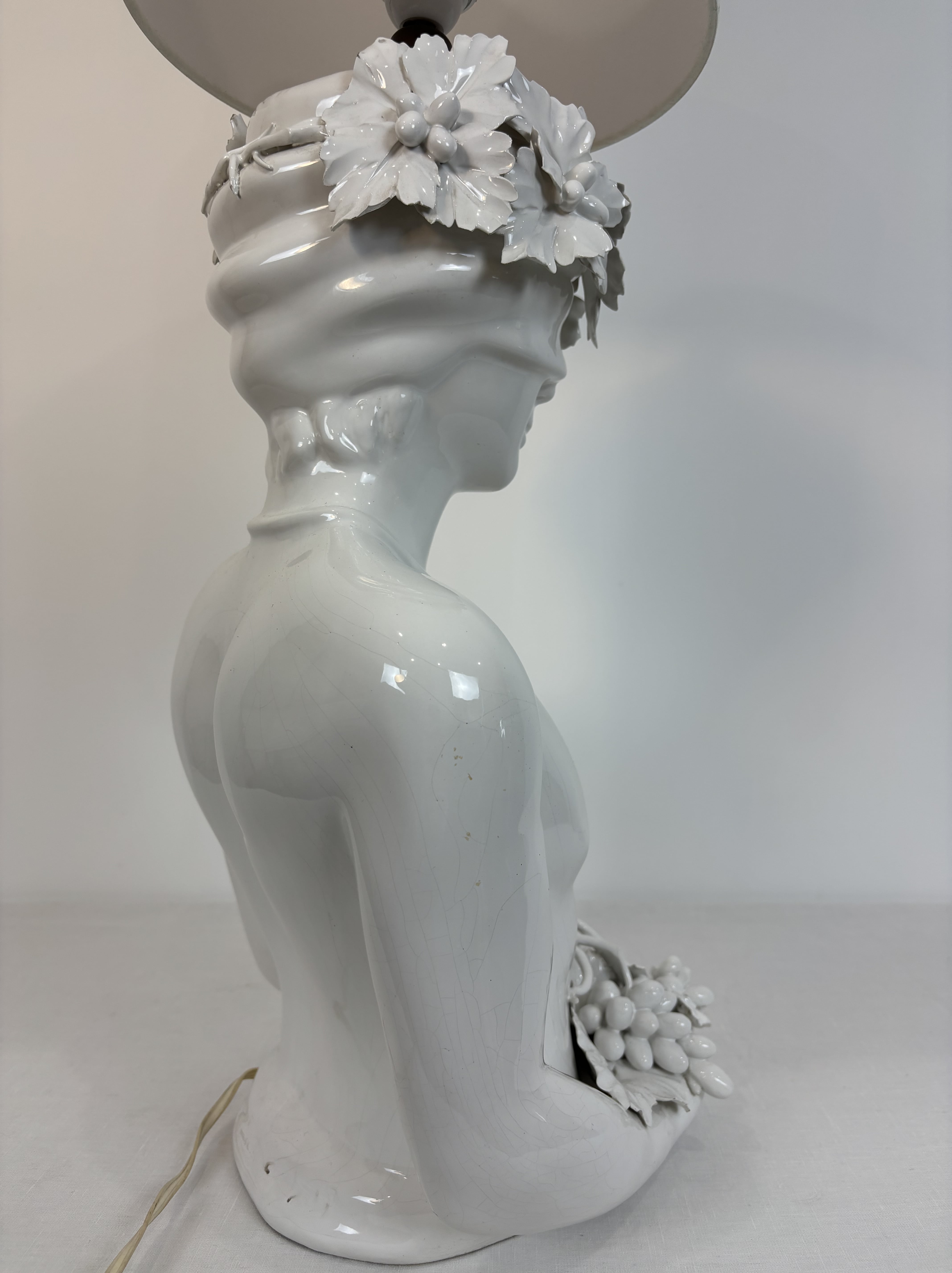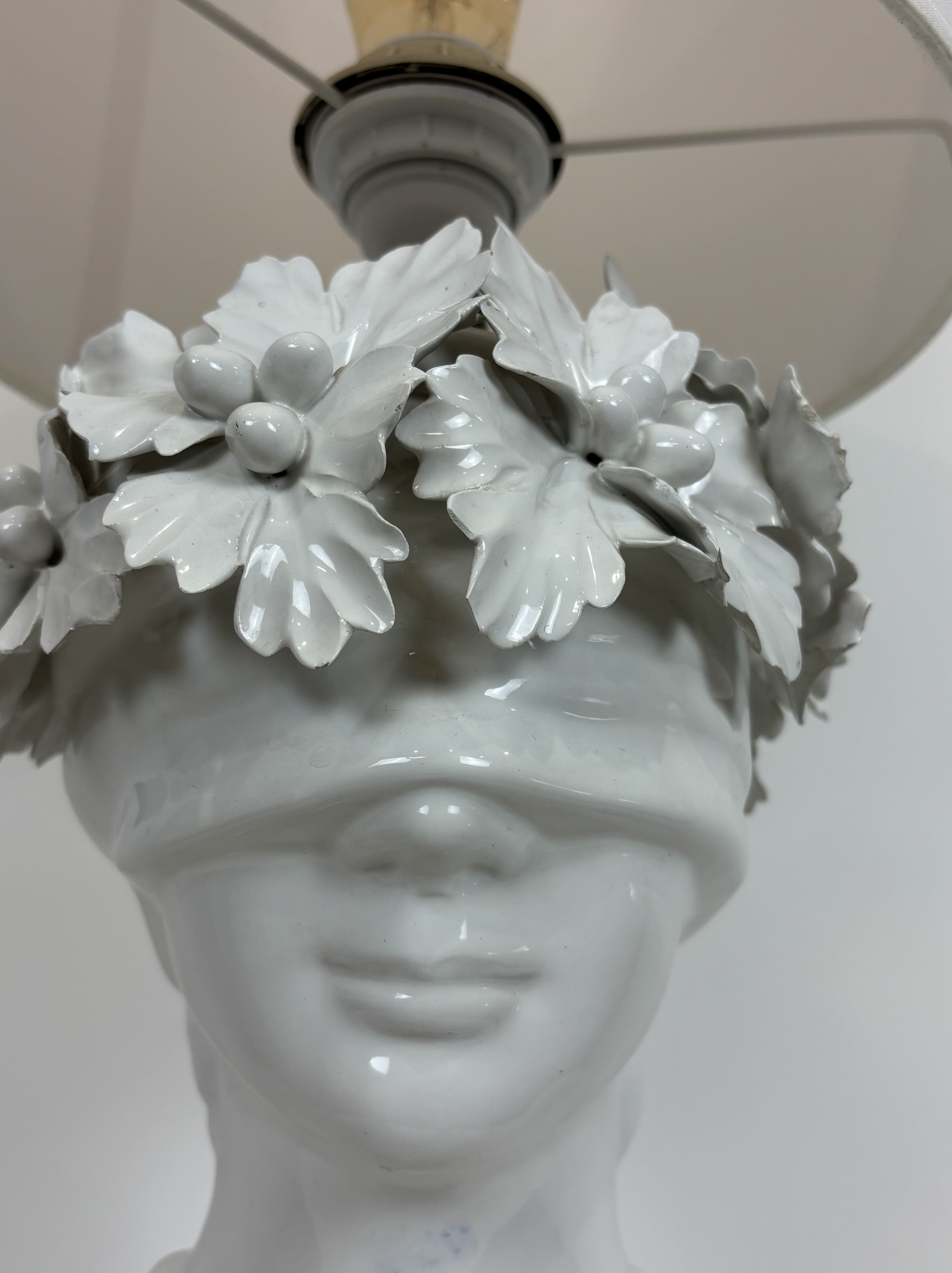 Rare et spectaculaire lampe italienne en céramique émaillée blanche attribuée aux ateliers Capodimonte, représentant un buste masculin allégorique orné d'un riche décor en haut-relief. Le personnage, les yeux bandés, est coiffé d'une vaste couronne de feuilles de vigne et grappes de raisin finement modelées, typiques des productions Capodimonte de la seconde moitié du XXe siècle: feuillages minutieusement appliqués, grappes en relief aux formes pleines, modelé expressif du visage, esthétique théâtrale d'inspiration mythologique. Le buste présente également un motif de pampres dans les mains. Abat-jour cylindrique. Italie, circa 1960-1970