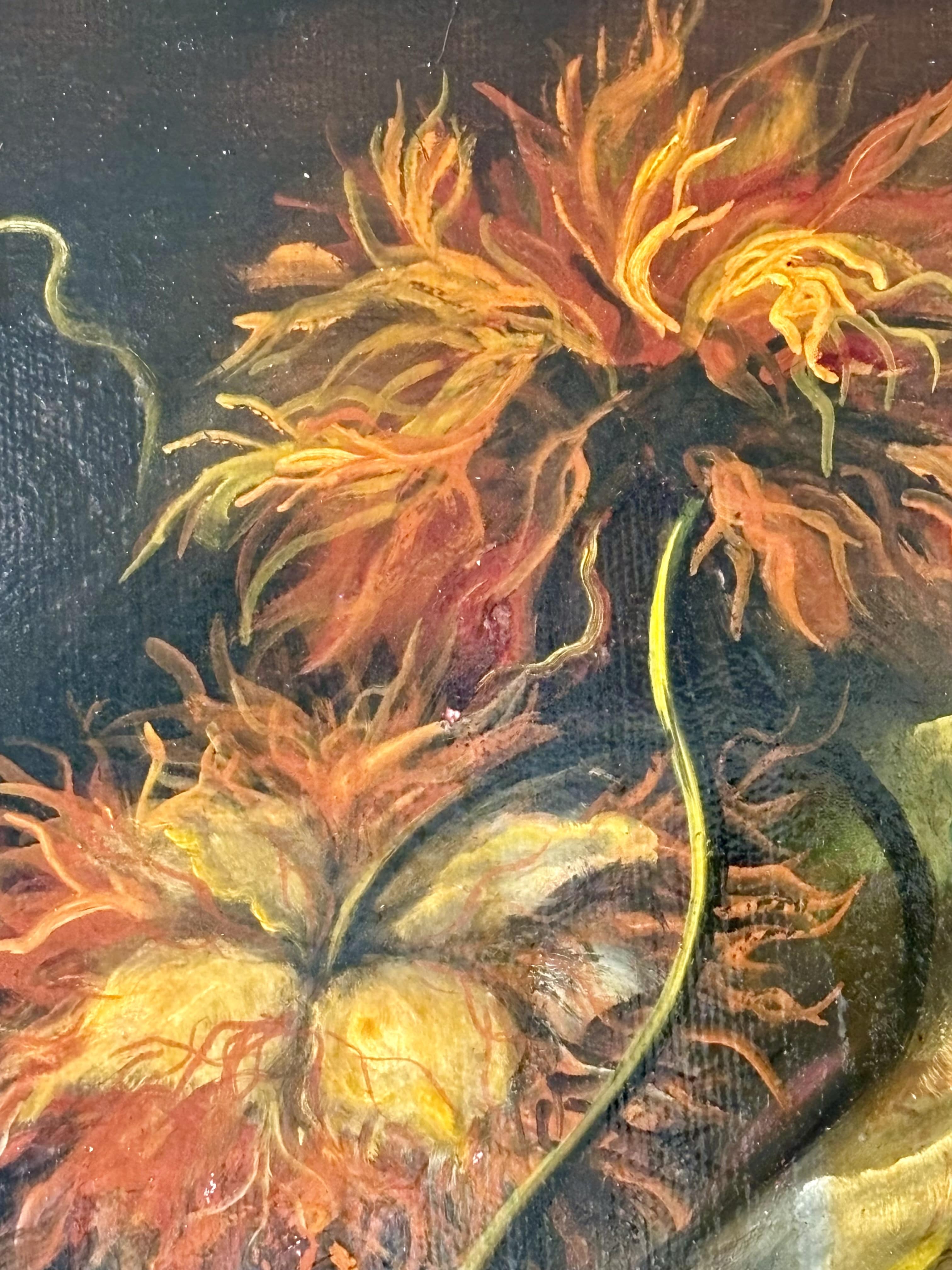 Superbe huile sur panneau de nature morte avec des fleurs, des fruits, un papillon et un citron pelé. Cadre en bois laqué noir et or.