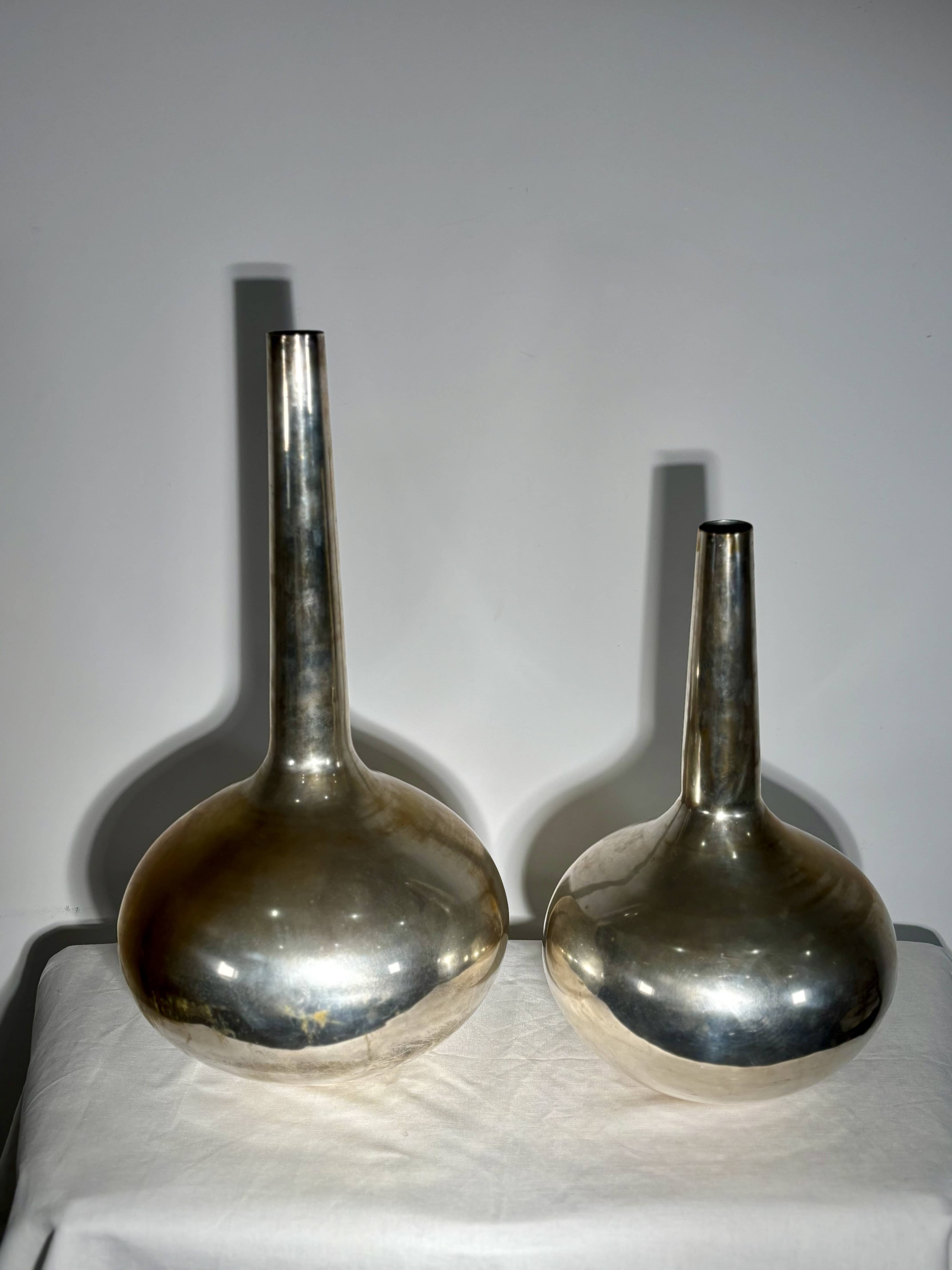 Spectaculaire paire de vases de forme "gourde" ou "bouteille" Mid-Century, en métal argenté, aux lignes épurées et organiques. Ces pièces se distinguent par leurs dimensions généreuses, notamment le plus grand modèle atteignant 58 cm de hauteur, ce qui en fait des objets de décoration de premier plan. Sous la base, chaque vase porte l'estampille de la prestigieuse maison italienne "Jordan Sheffield Collection" - maison Jordan-Silverado, basée près de Rome. Le nom Jordan fait référence à la famille de créateurs italiens Antonio Jordan. La mention Sheffield n'indique pas une origine britanique, mais garantit une technique d'argenture de haute qualité, héritée du savoir-faire traditionnel. Ces pièces sont le reflet du design italien des années 70-80, alliant l'élégance classique de l'argenterie à des formes minimalistes très modernes. Très bel aspect visuel. Traces d'usage, patine d'usage. Italie, XXe siècle