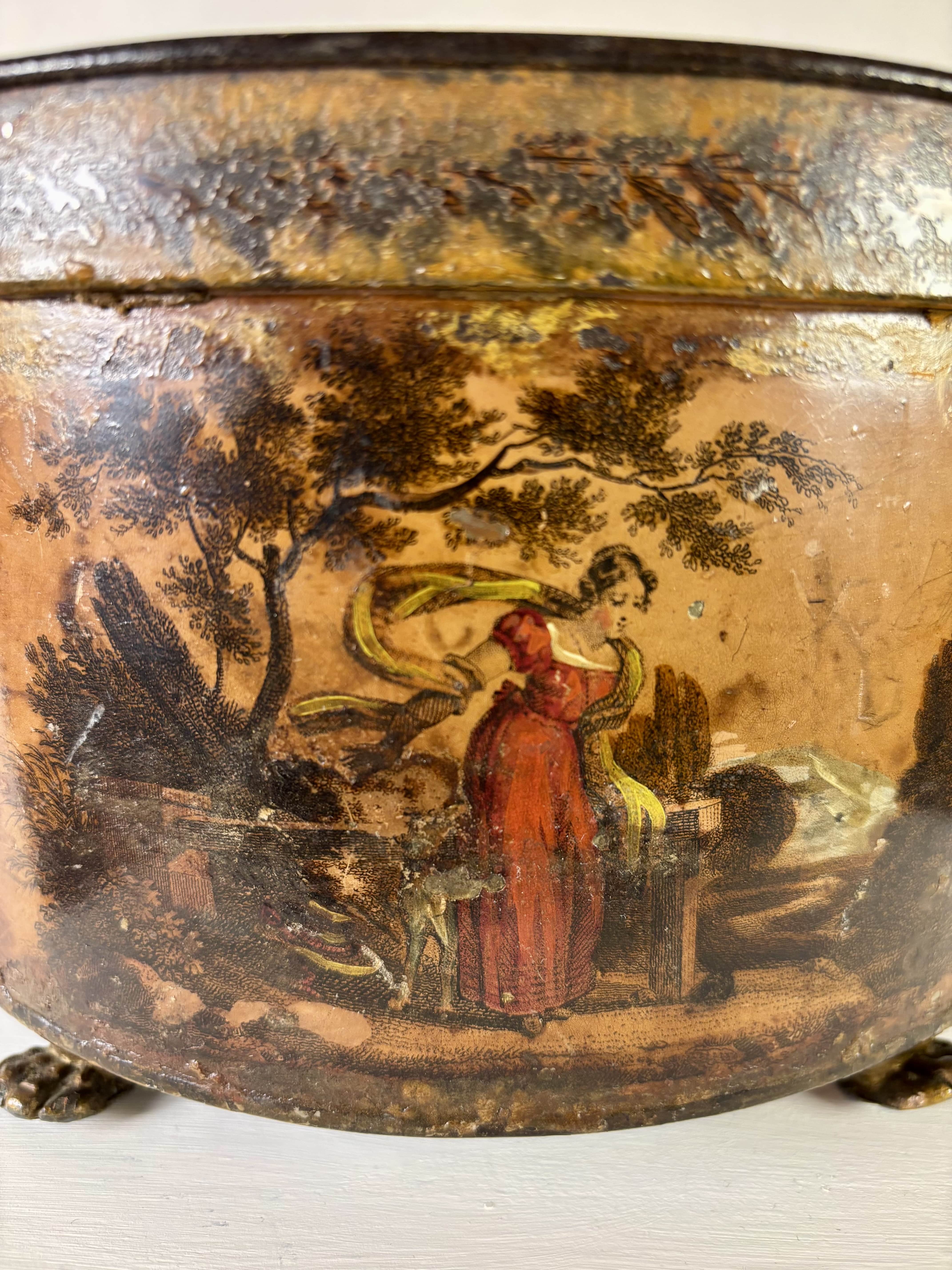 Belle jardinière en tôle peinte datant du XIXe siècle ornée d'une scène romantique peinte à la main représentant une figure féminine dans un paysage bucolique, caractéristique du goût du début du XIXe siècle. L'ensemble enrichi de détails fins, comme des poignées zoomorphes et des pieds en forme de pattes, typiques des influences néoclassiques et romantiques. La jardinière est doublée d'une cuve en zinc fixe. L'objet présente des traces d'usure et de patine, témoignant de son âge. Bon état général.