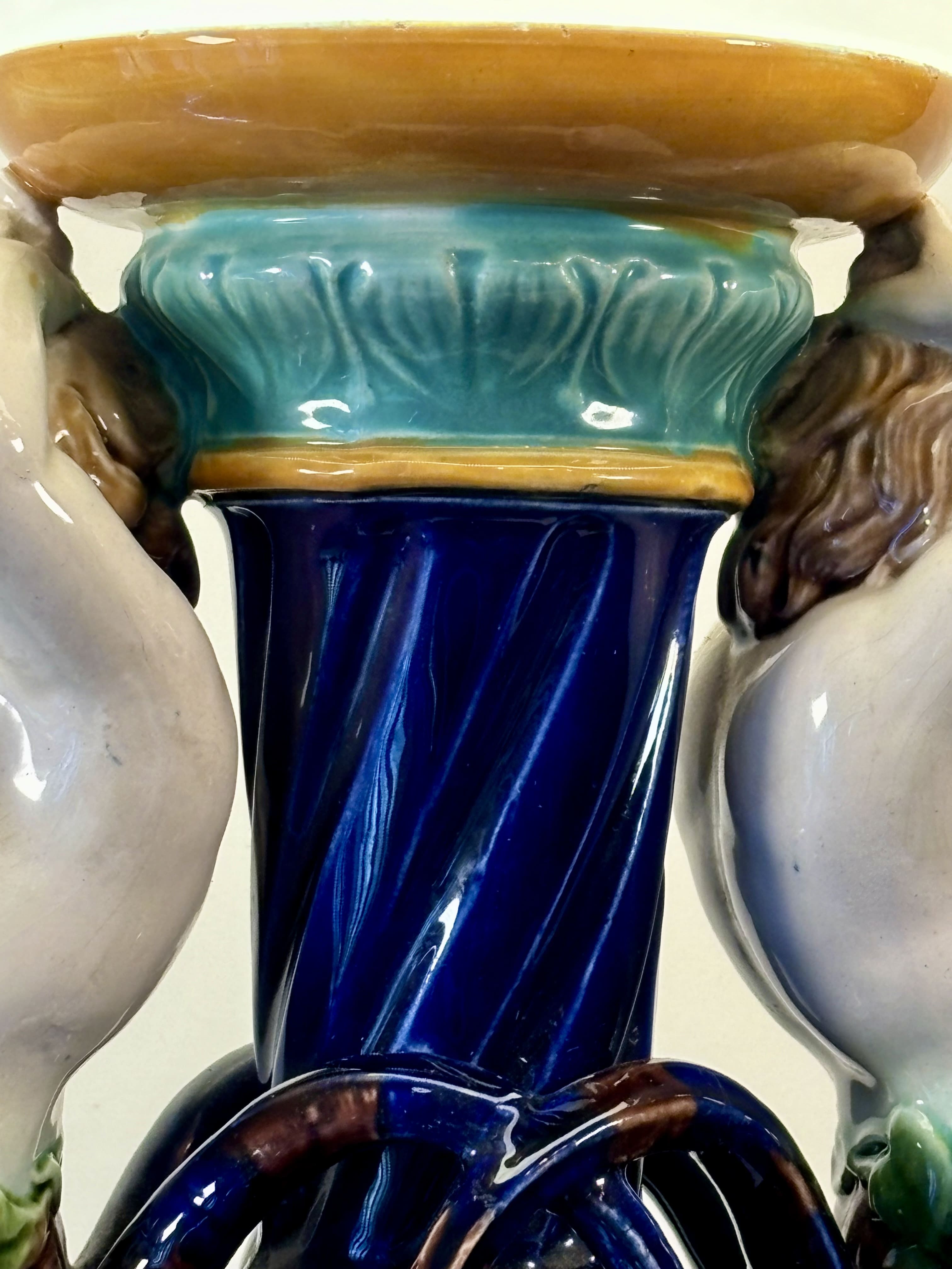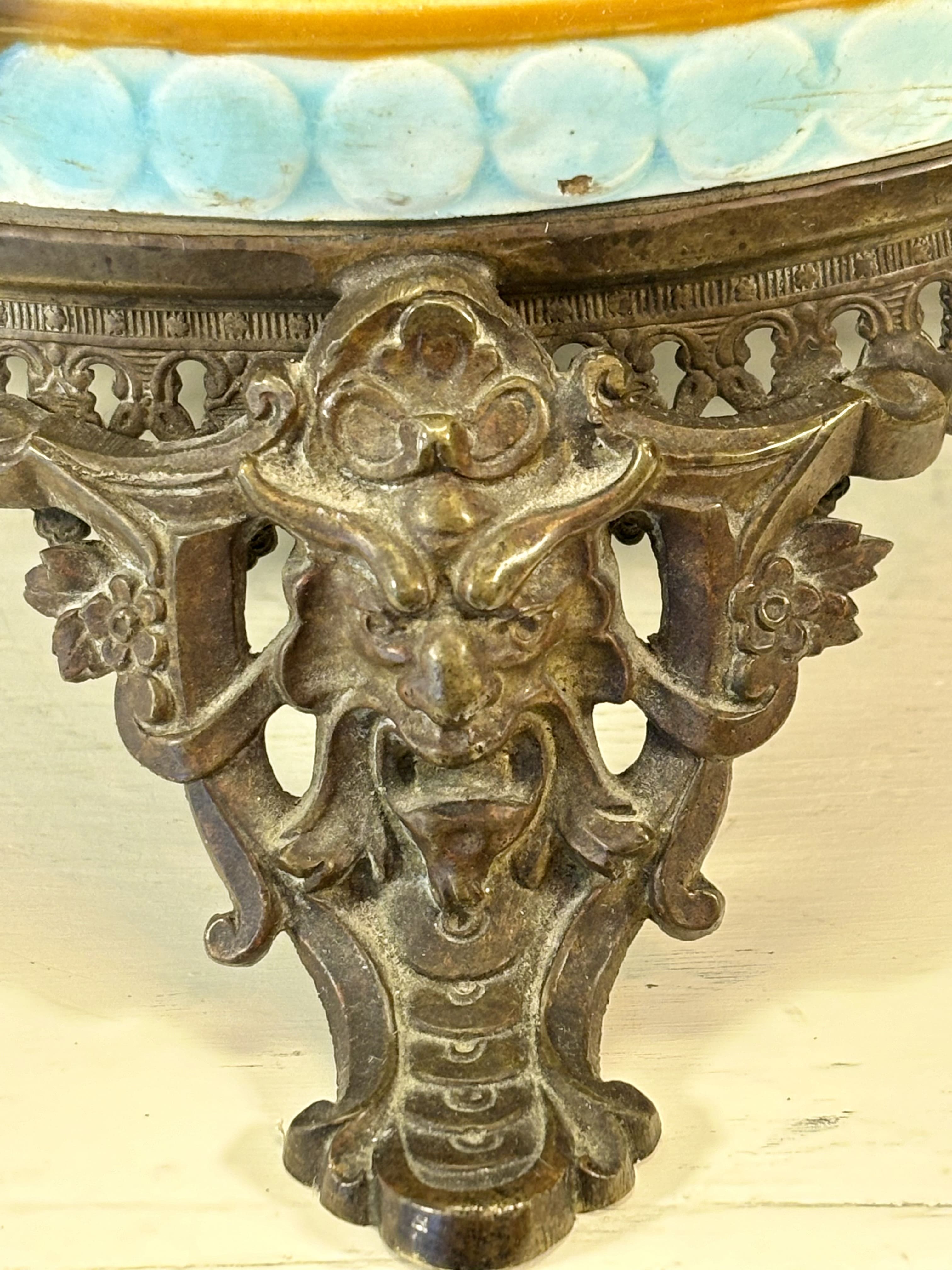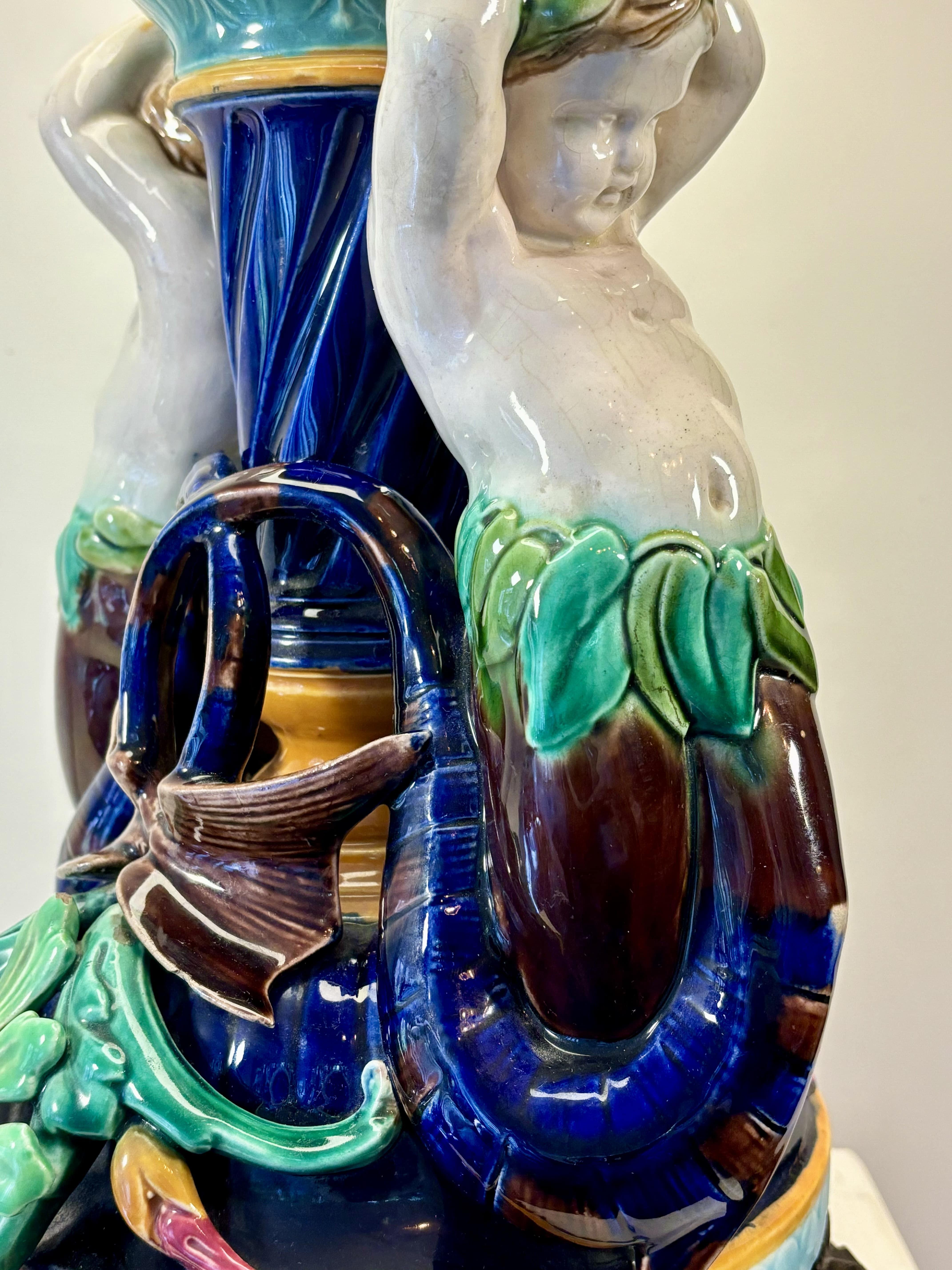 Exceptionnelle lampe à pose en faïence de Sarreguemines, glaçure majolique, à décor de putti marins tenant un globe. Cette glaçure colorée apparait vers 1870 à Sarreguemines et recouvre rapidement une grande partie des objets produits en faïence fine. En très bon état. La base est en bronze à décor de mascarons.
