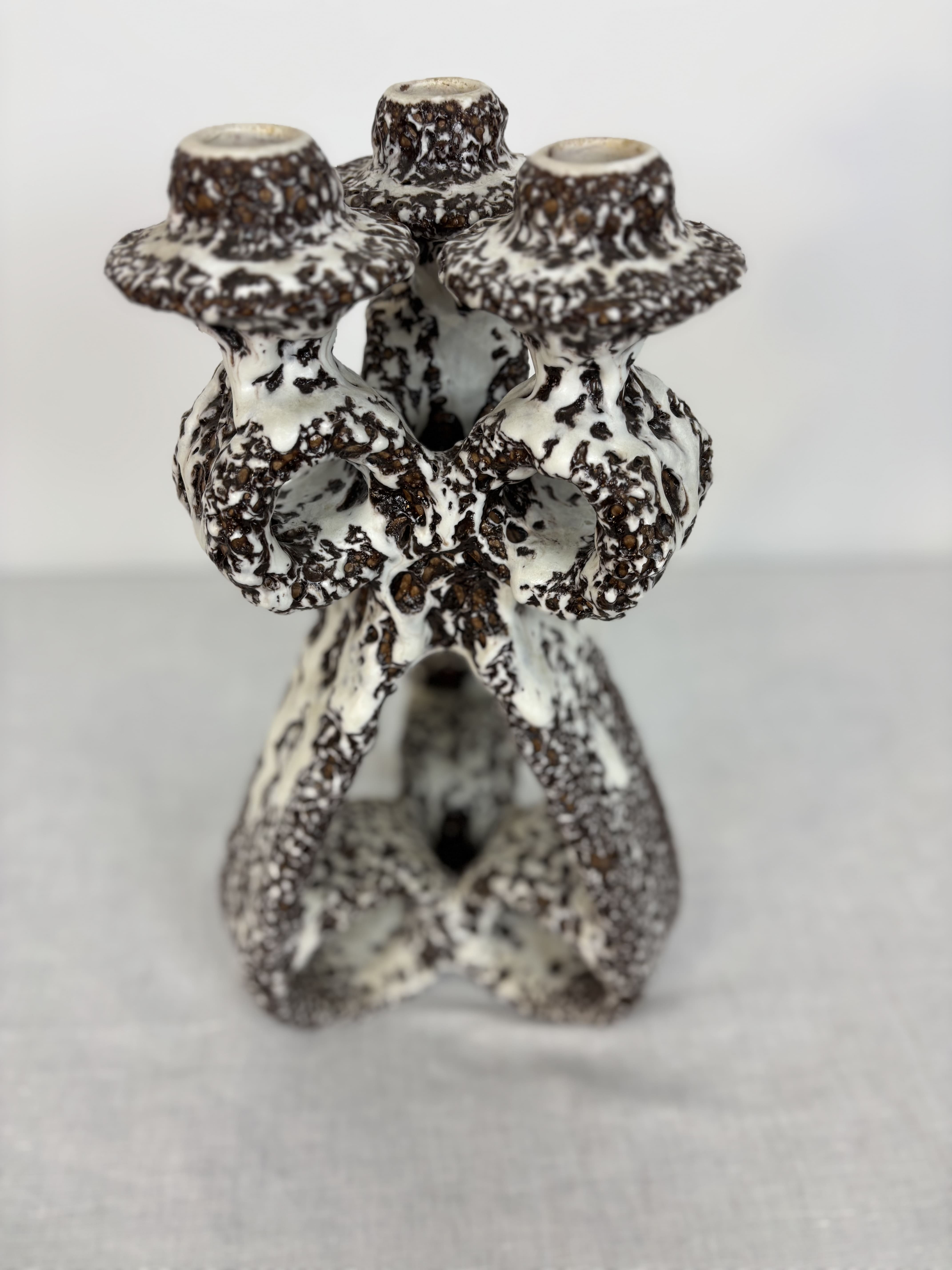 Grand candélabre à trois lumières composé de trois enroulements finissant par des bobèches, en céramique à émaillage blanc alcalin sur brun foncé. L'objet présente un travail de matière remarquable avec une glaçure "écume de mer". Les formes organiques et presque baroques de ses bras évoquent autant l'art brutaliste que l'esprit libre de la céramique méditérranéenne d'après-guère. Circa 1960 Marqué sous la base "Marius Giuge, Artisan Potier, Vallauris"