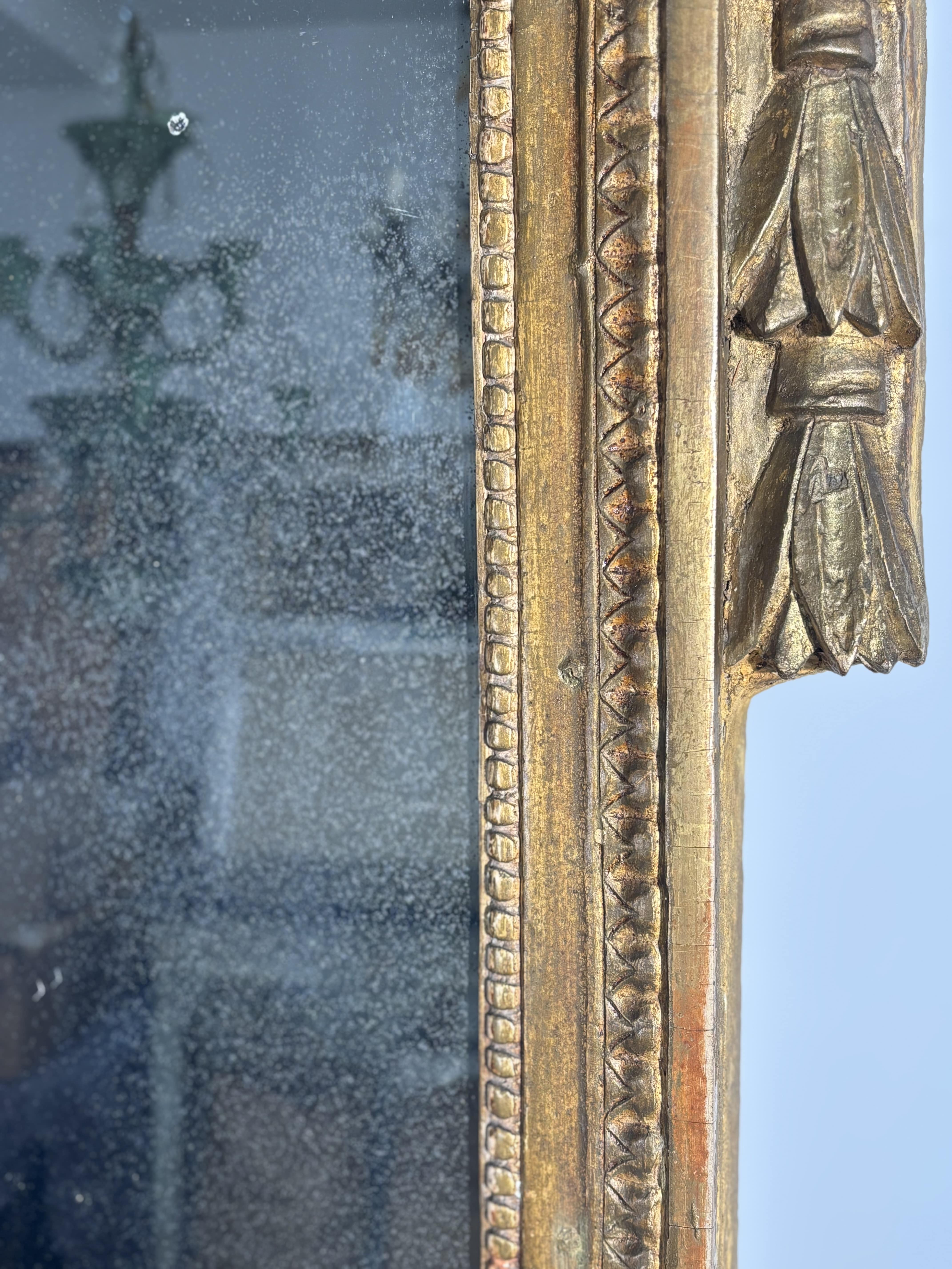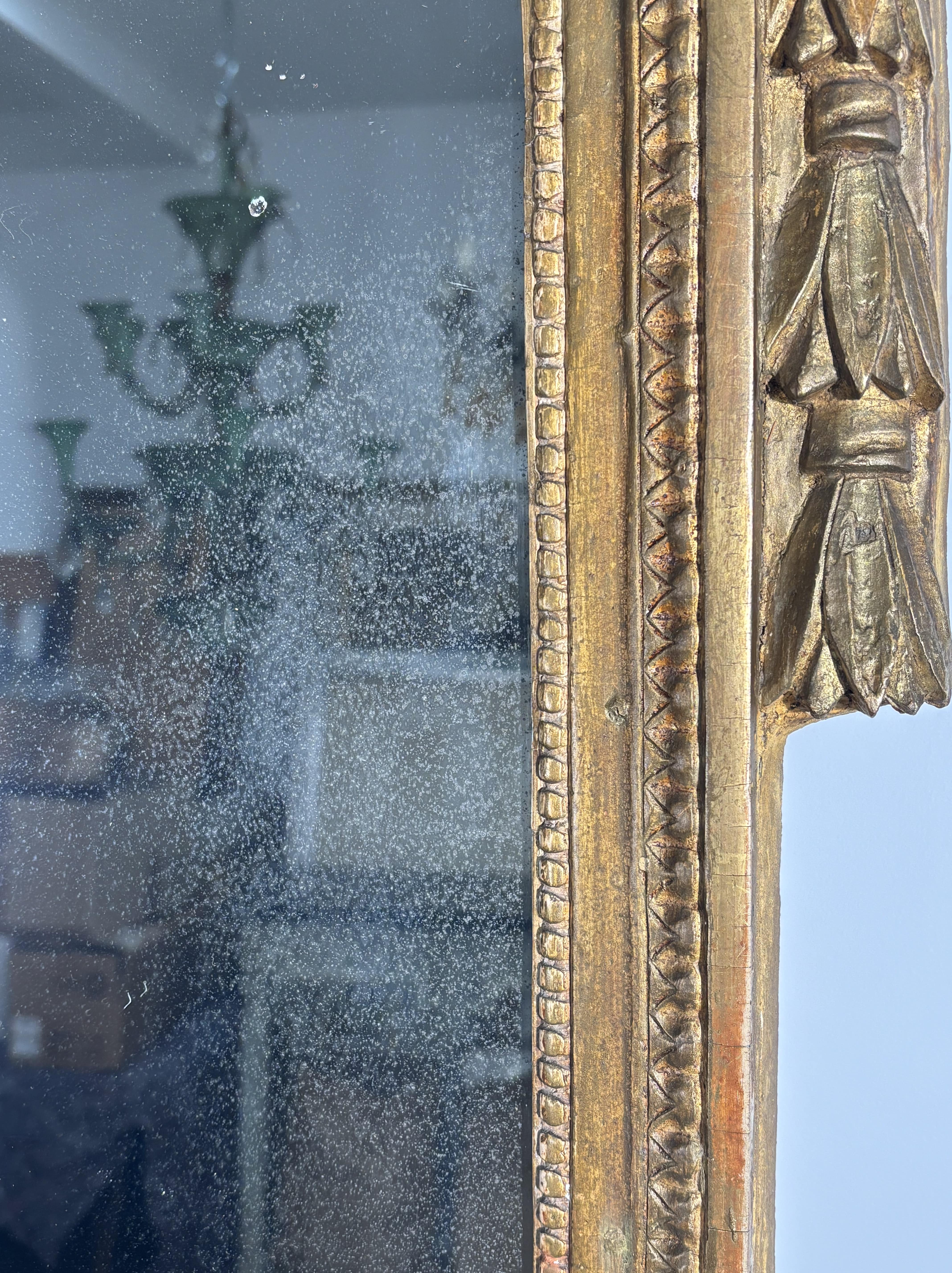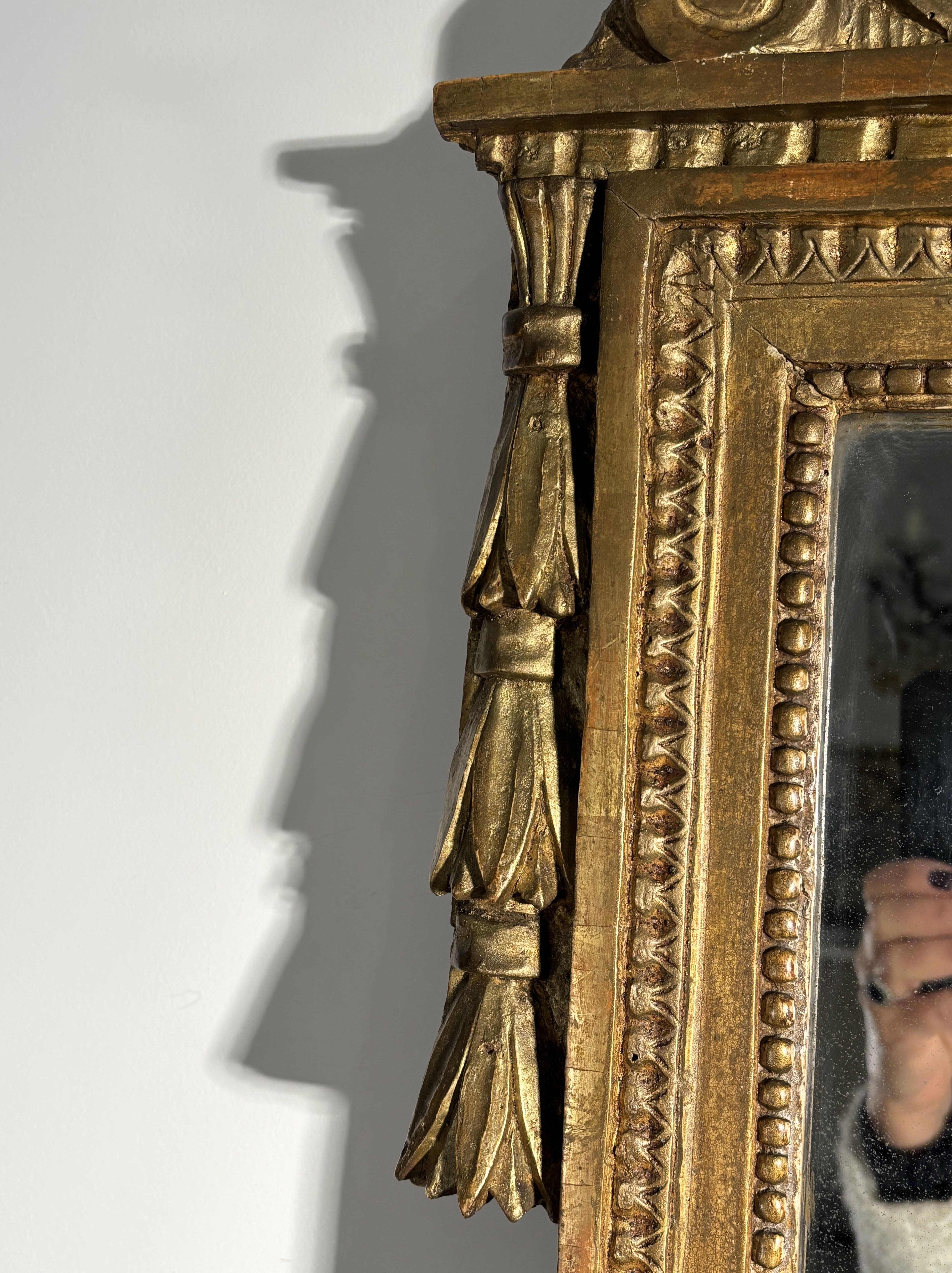 Très beau miroir en bois doré sculpté du début du XIXe siècle dans le style Louis XVI. Il présente un fronton orné de couronne de laurier symbole de succès, de colombes symbole de paix et d'un carquois garni de ses flèches symbole d'amour. Encadrement à frises de perles, chutes latérales à décor de feuilles d'acanthes. Glace d'origine.