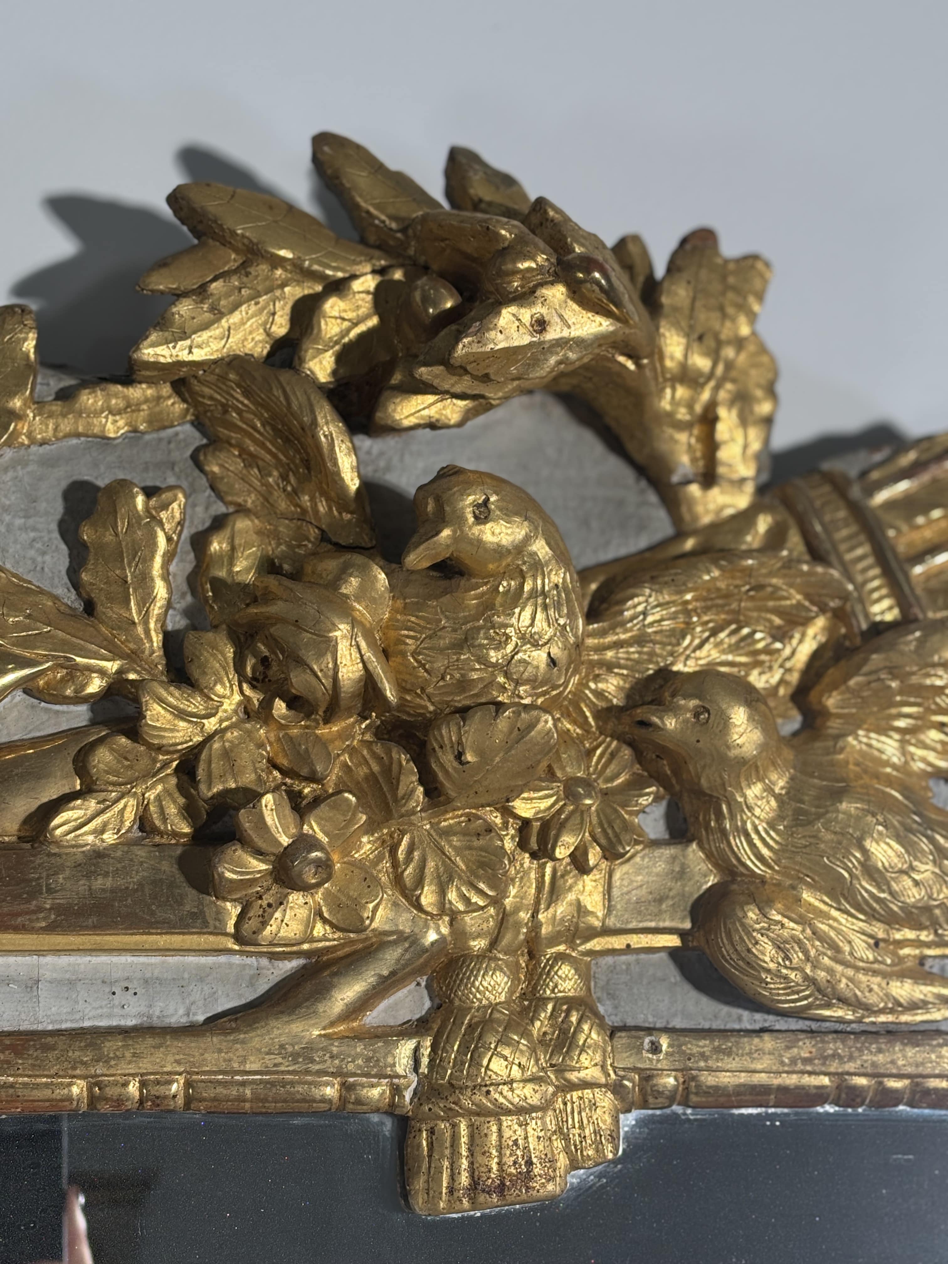 Très beau miroir d'époque Louis XVI en bois sculpté doré et rechampi à fronton orné d'oiseaux, d'un carquois garni de ses flèches et de fleurs. Dorure à la feuille. Les montants sont décorés de feuillage et se terminent par des pommes de pin. Glace d'origine au mercure. Parquet postérieur.