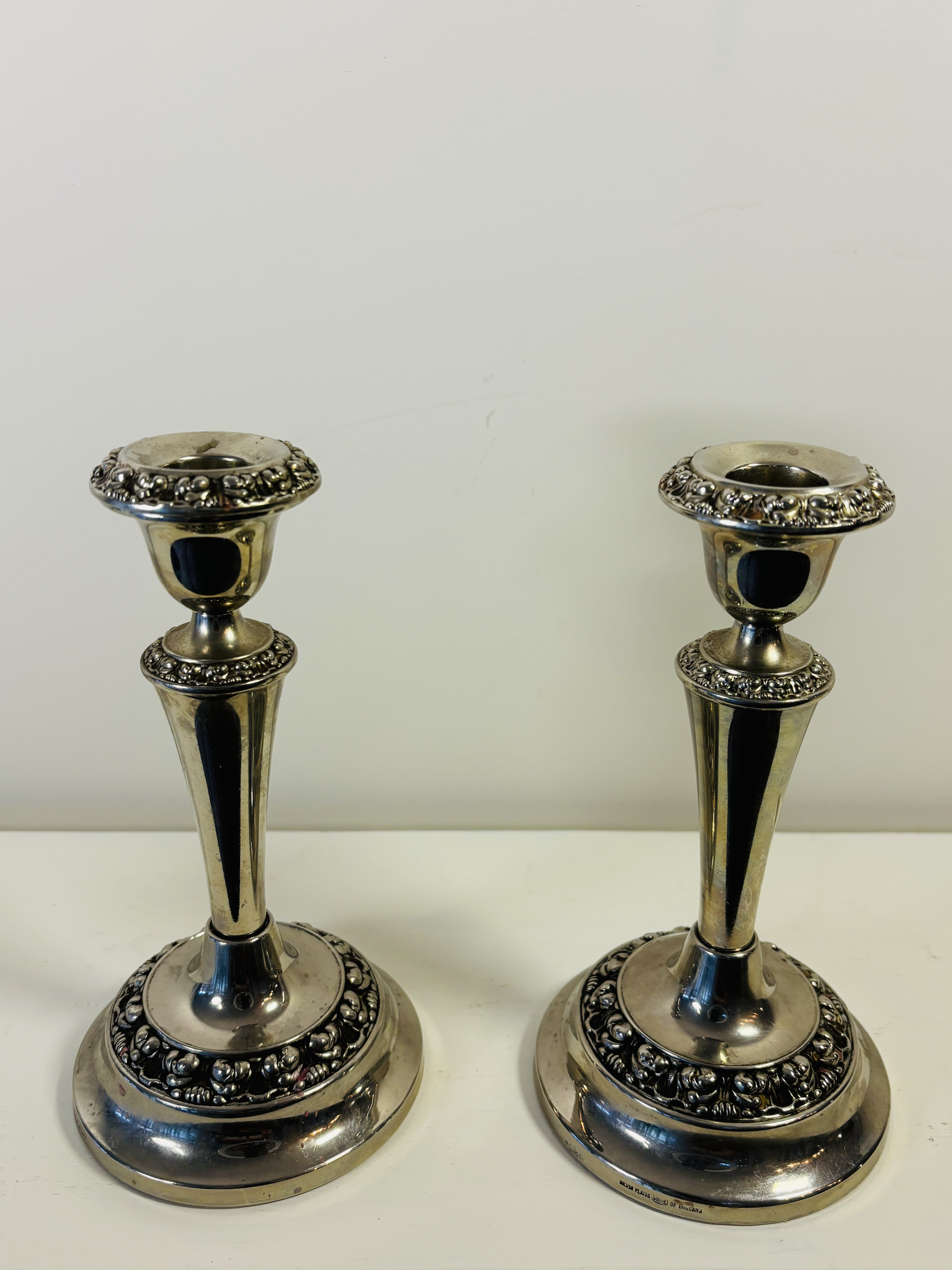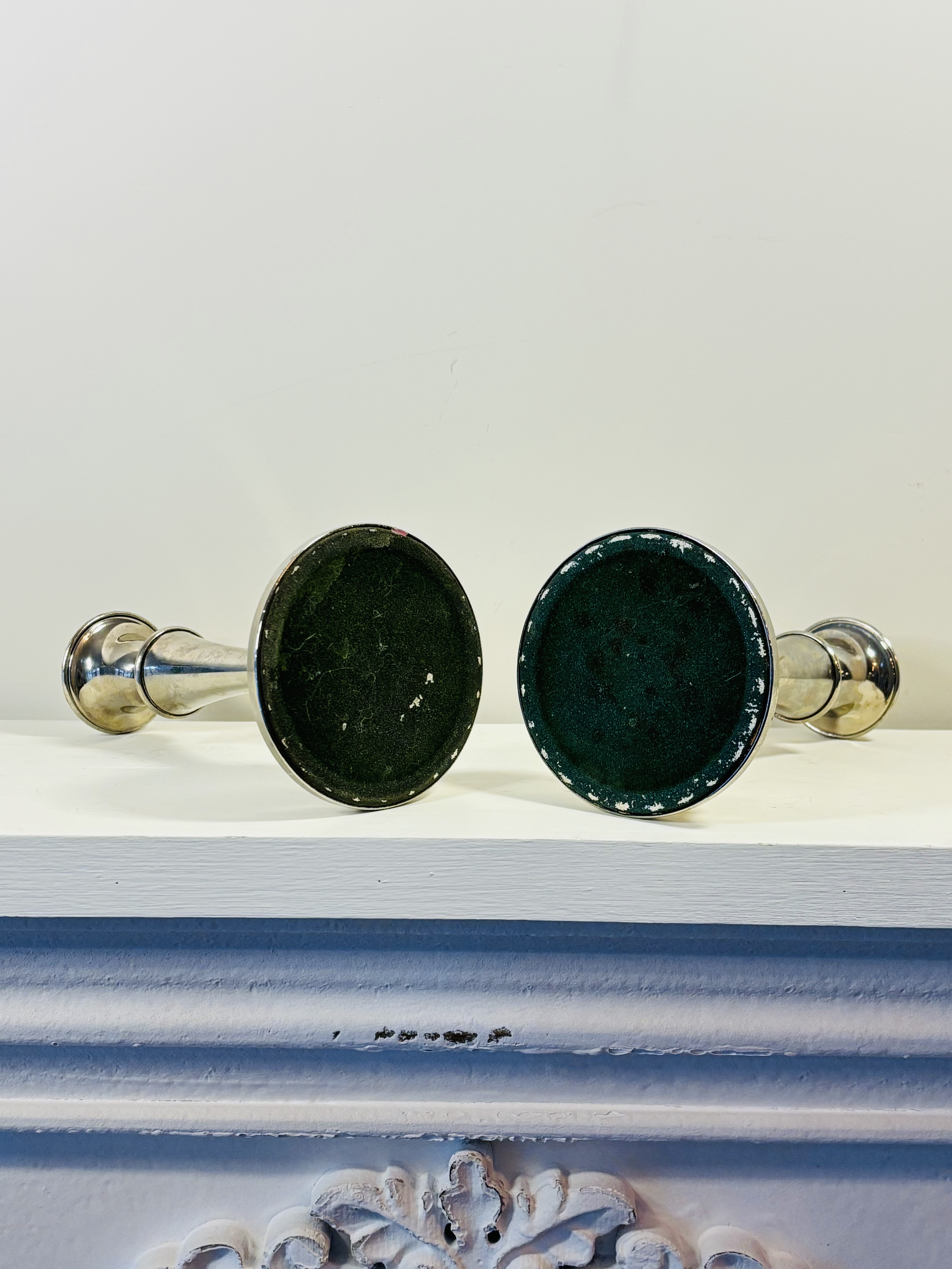 Ces élégants bougeoirs shabby chic en métal argenté ont été fabriqués à la fin des années 1950 par Ianthe England qui était à cette époque un fabricant réputé d'articles pour la table en métal argenté. Cette paire de bougeoirs témoigne de leur qualité. Ils contribueront à planter le décor d'un diner romantique, ou bien posés sur votre manteau de cheminée, leur lueur se reflétera dans un miroir pour une soirée douillette au coin du feu. Leur base est recouverte de feutre velours.