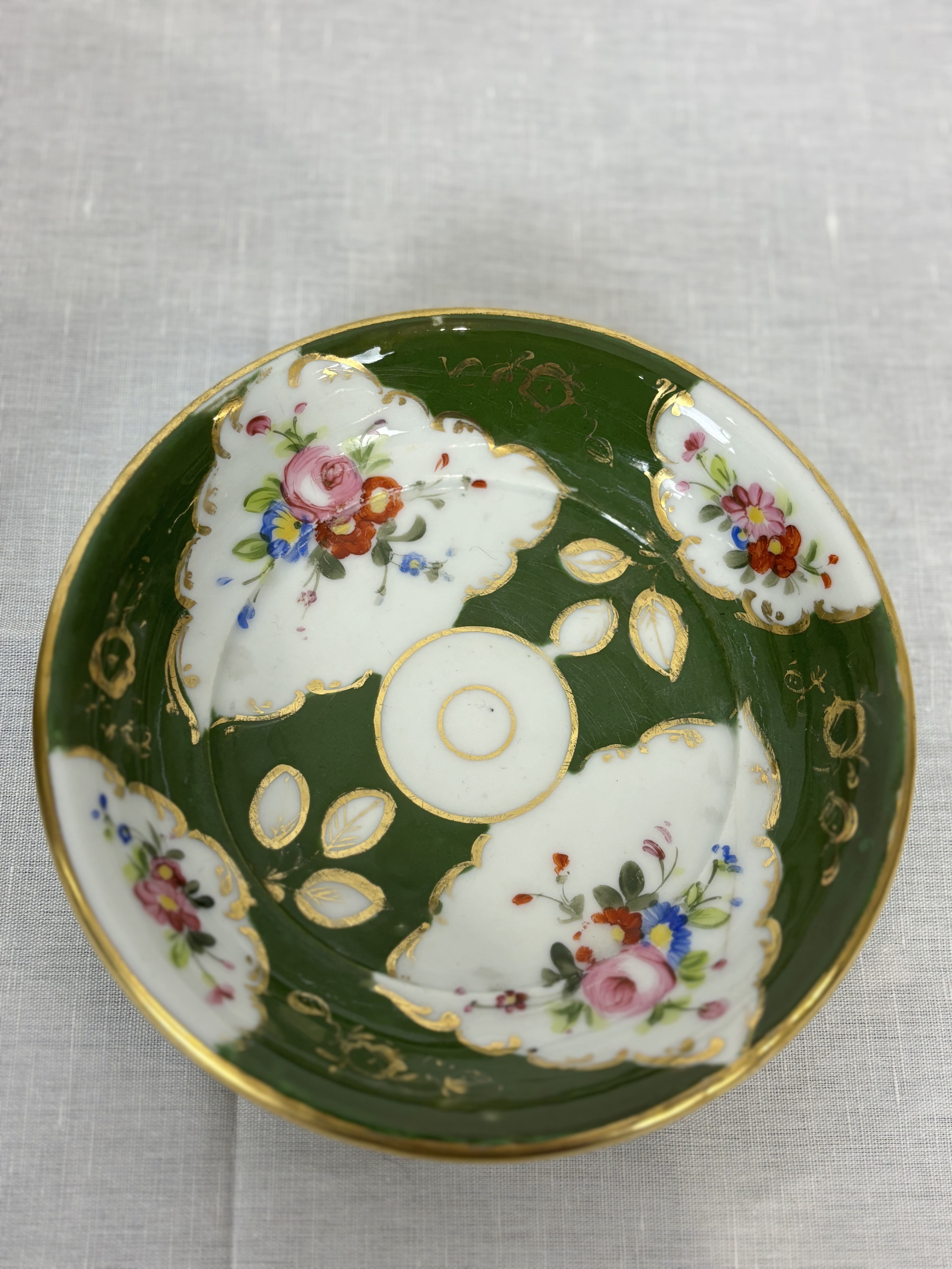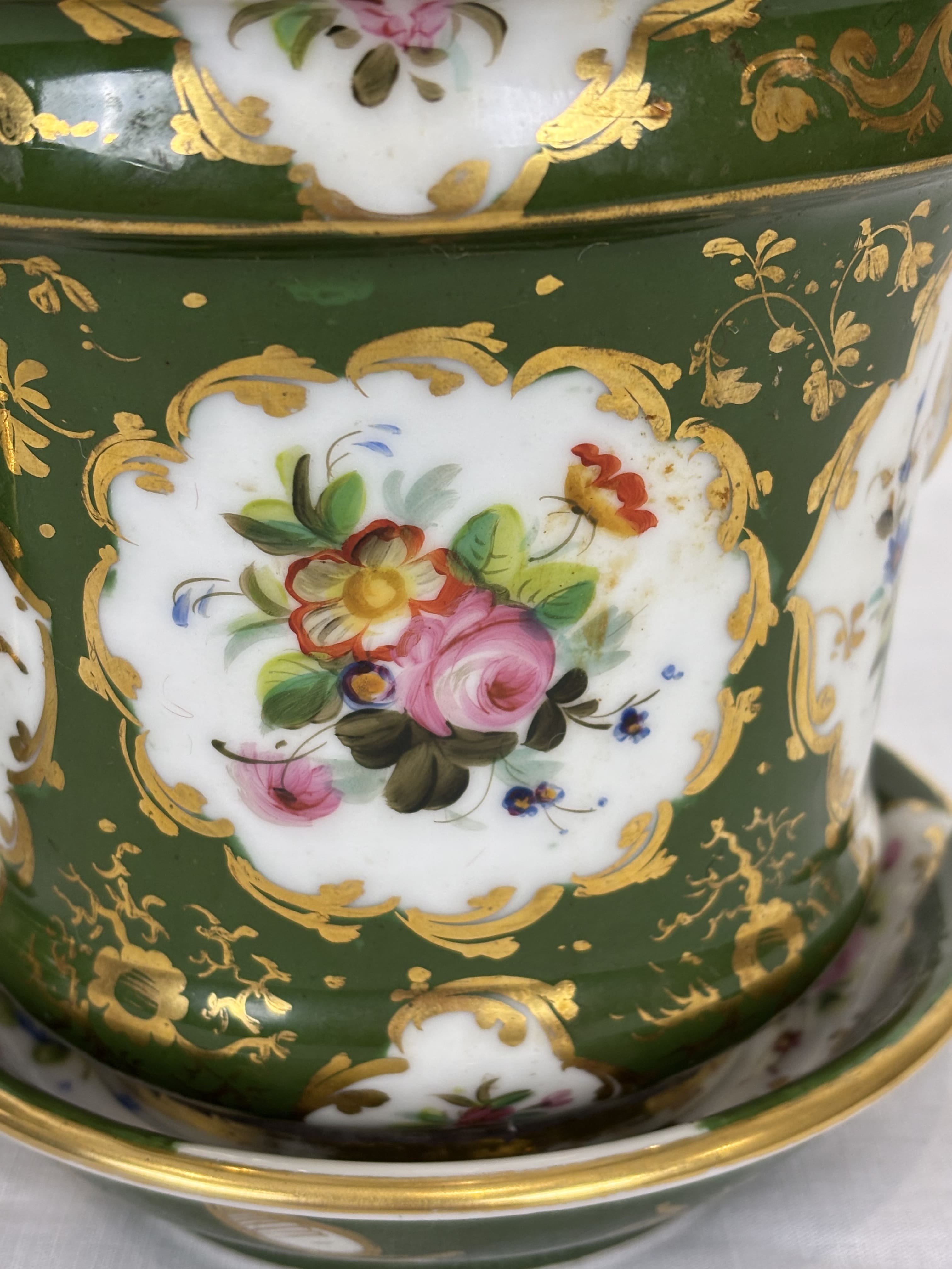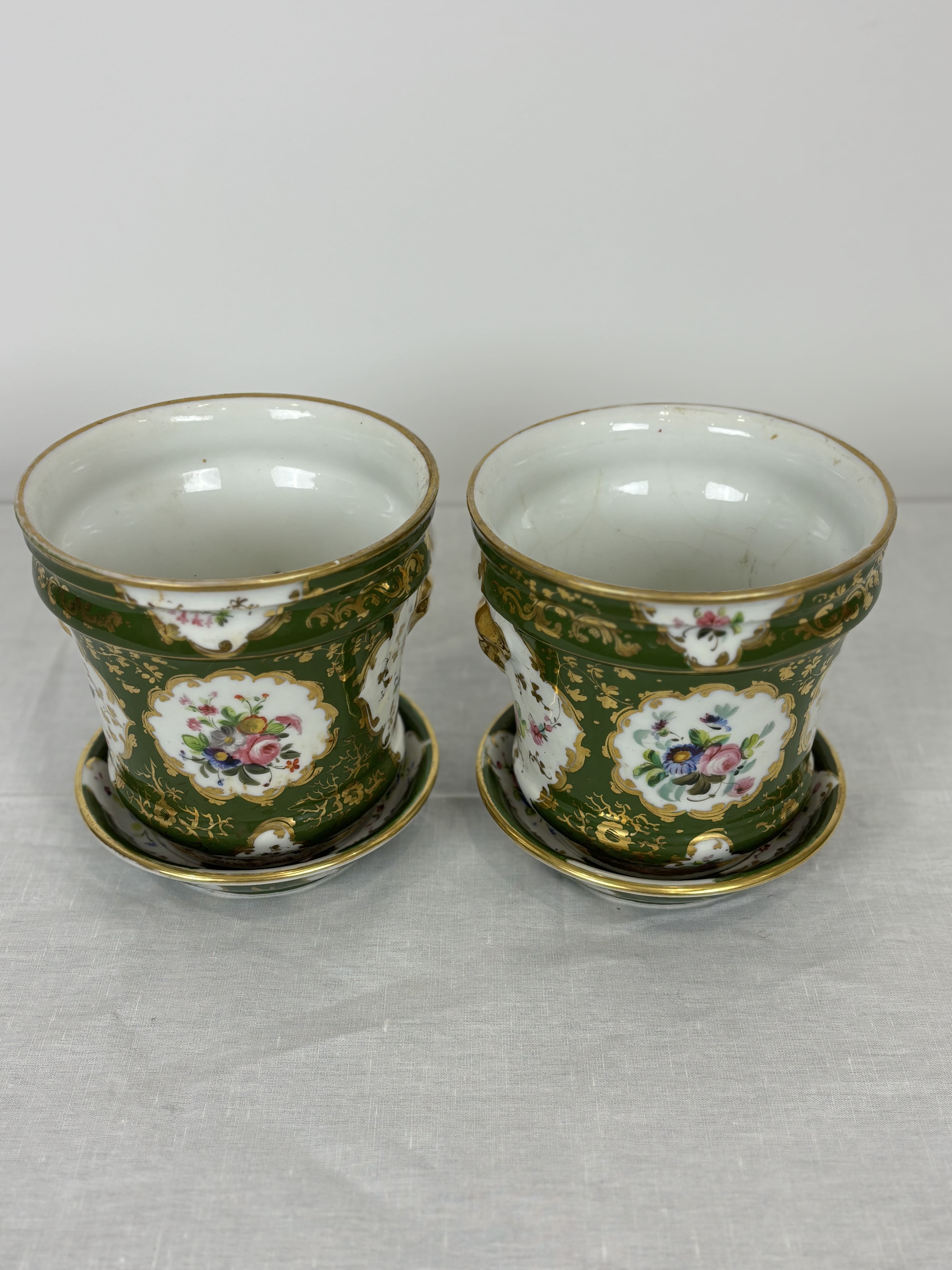 Paire De Cache-pots 19e, Porcelaine De Paris à Fond Vert Et Motifs Floral Et Doré