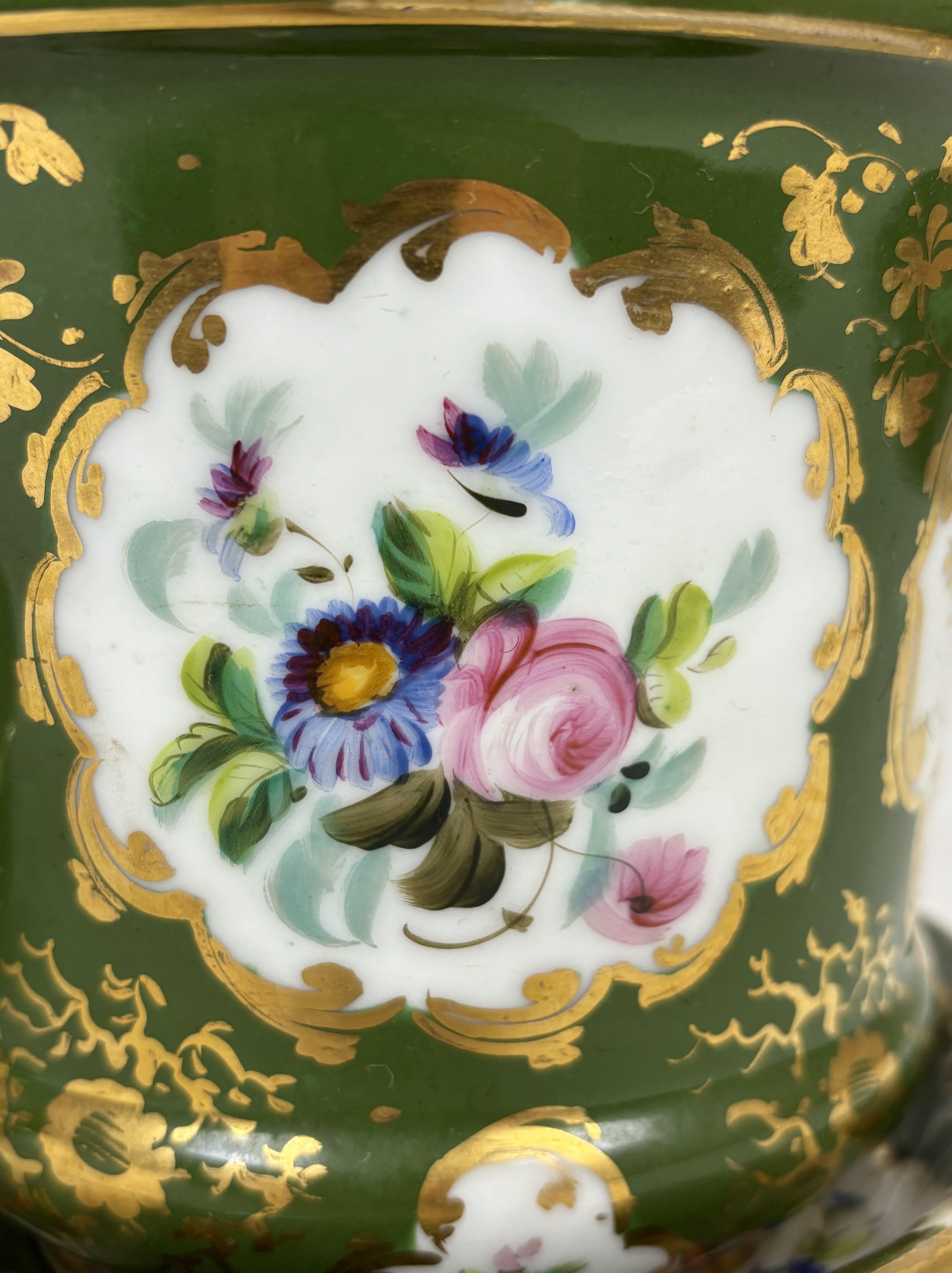 Belle paire de cache-pots 19e siècle, en porcelaine de Paris à fond vert profond richement ornés de dorures et motifs floraux polychrome.