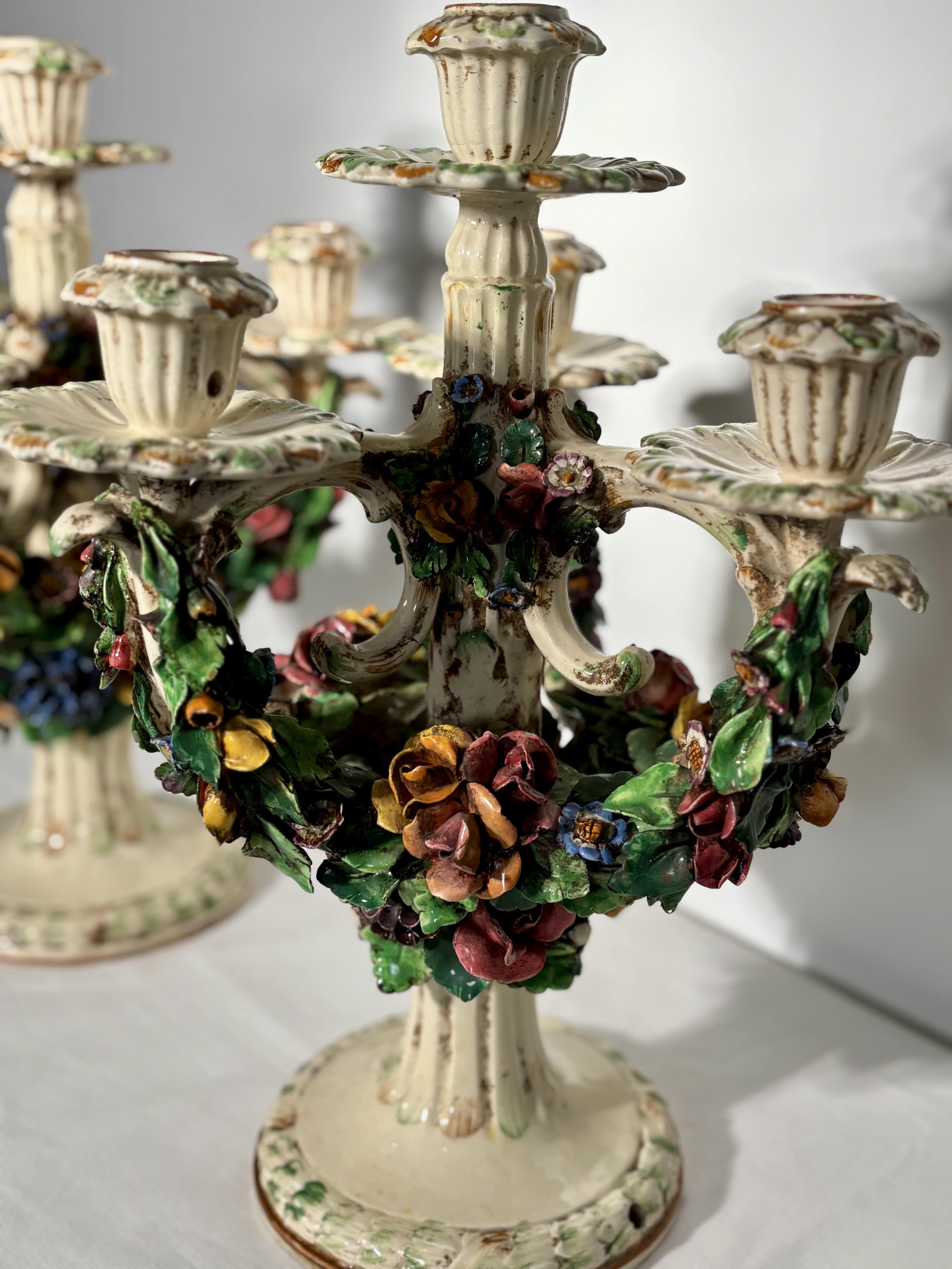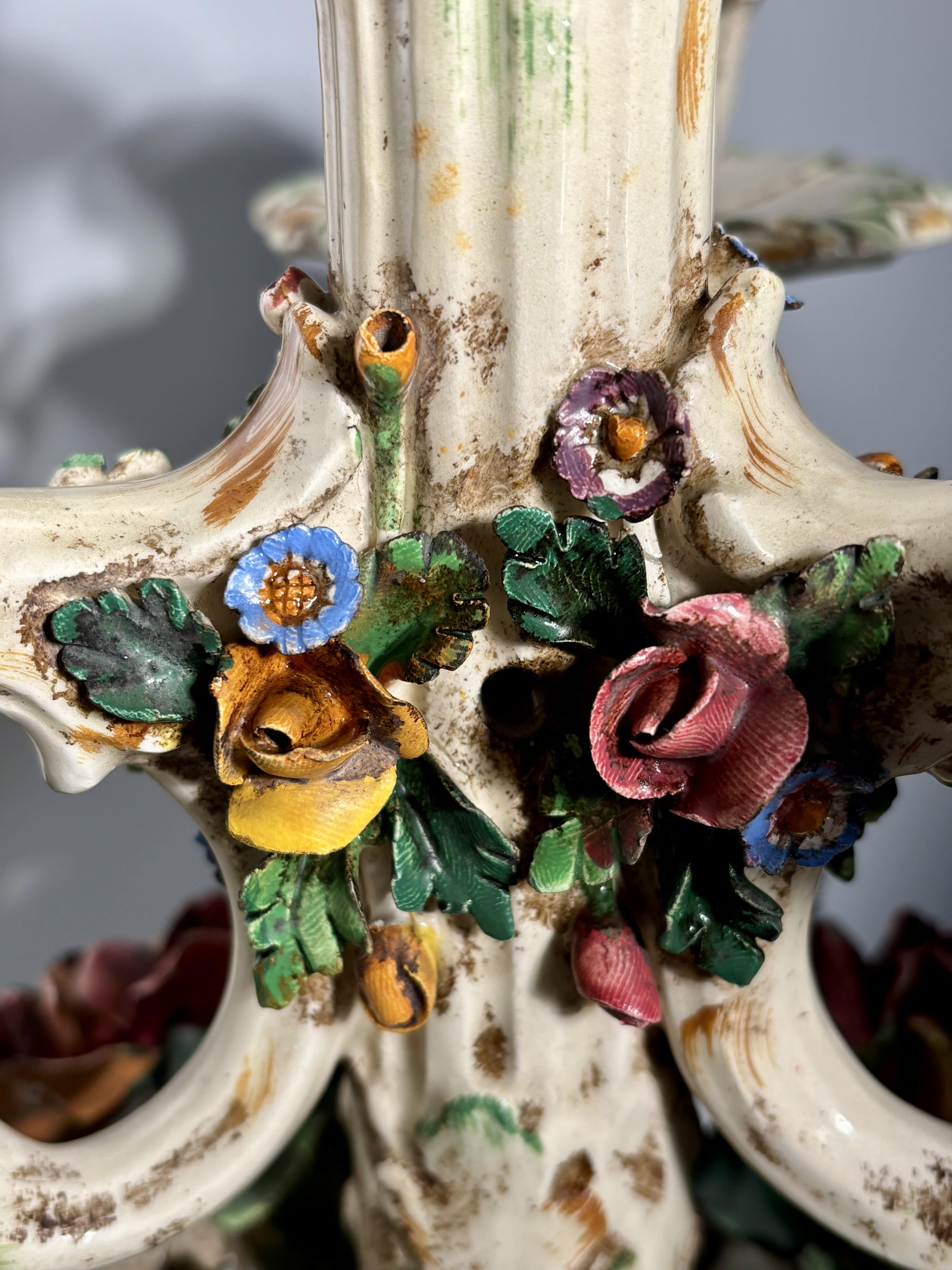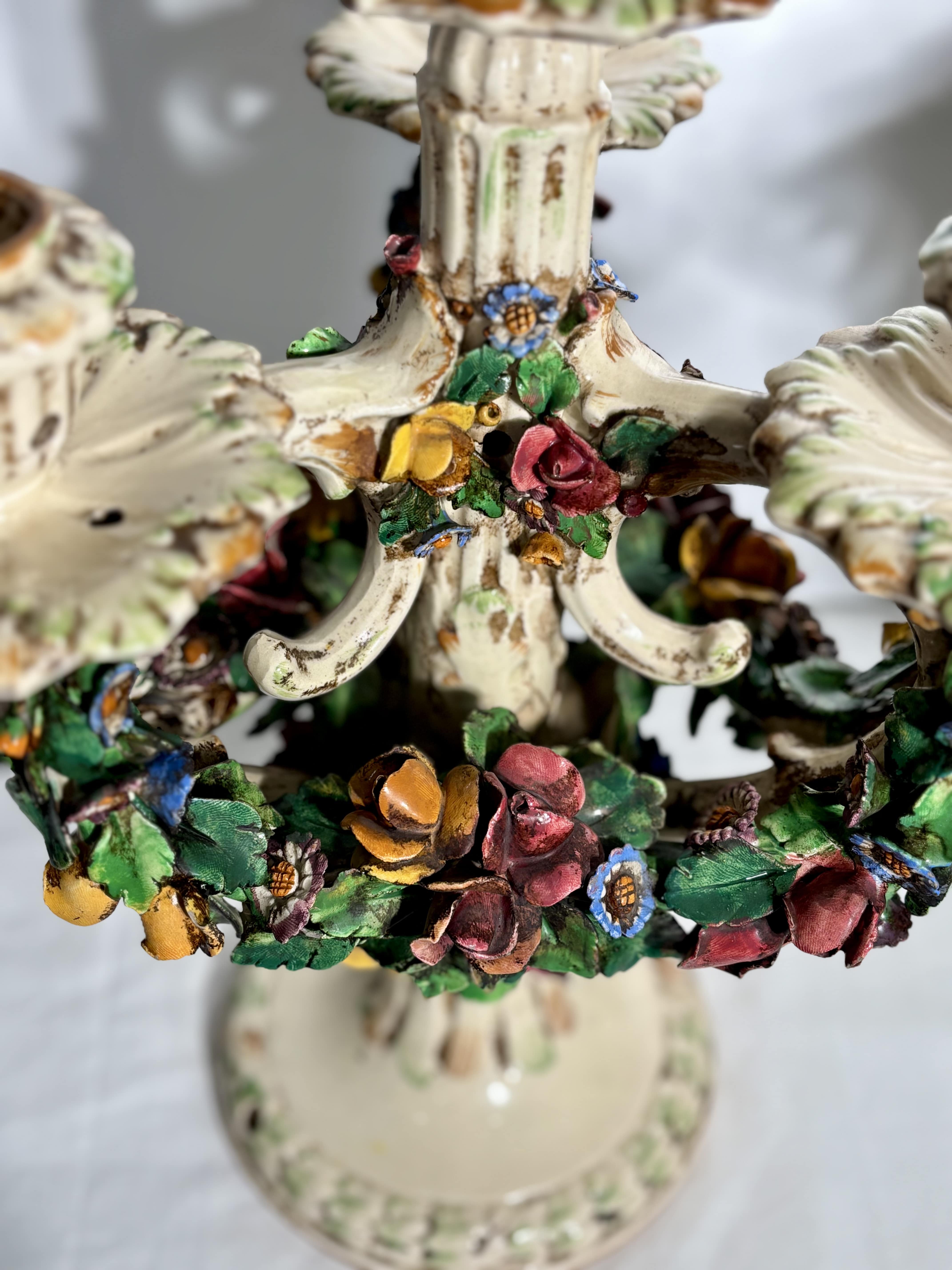 Céramique Italienne, technique du fiori applicati. Très bel état. Superbe paire de candélabres en céramique italienne, travail de Bassano del Grappa, réalisée entre les années 1920 et 1940. Ces pièces illustrent parfaitement la tradition décorative vénitienne du fiori applicati, ou chaque fleur, pétale, feuille est modelé à la main puis appliqué une à une sur la structure. Ce savoir-faire, d'une grande finesse, constitue l'une des signatures historiques des ateliers de Bassano. La composition très florale reprend les codes décoratifs du baroque vénitien: guirlandes torsadées, rosettes, couleurs profondes et émaillage ivoire, typique de la production du début du XXe siècle. Bel état de conservation. Patine douce et homogène. Italie, XXe siècle.