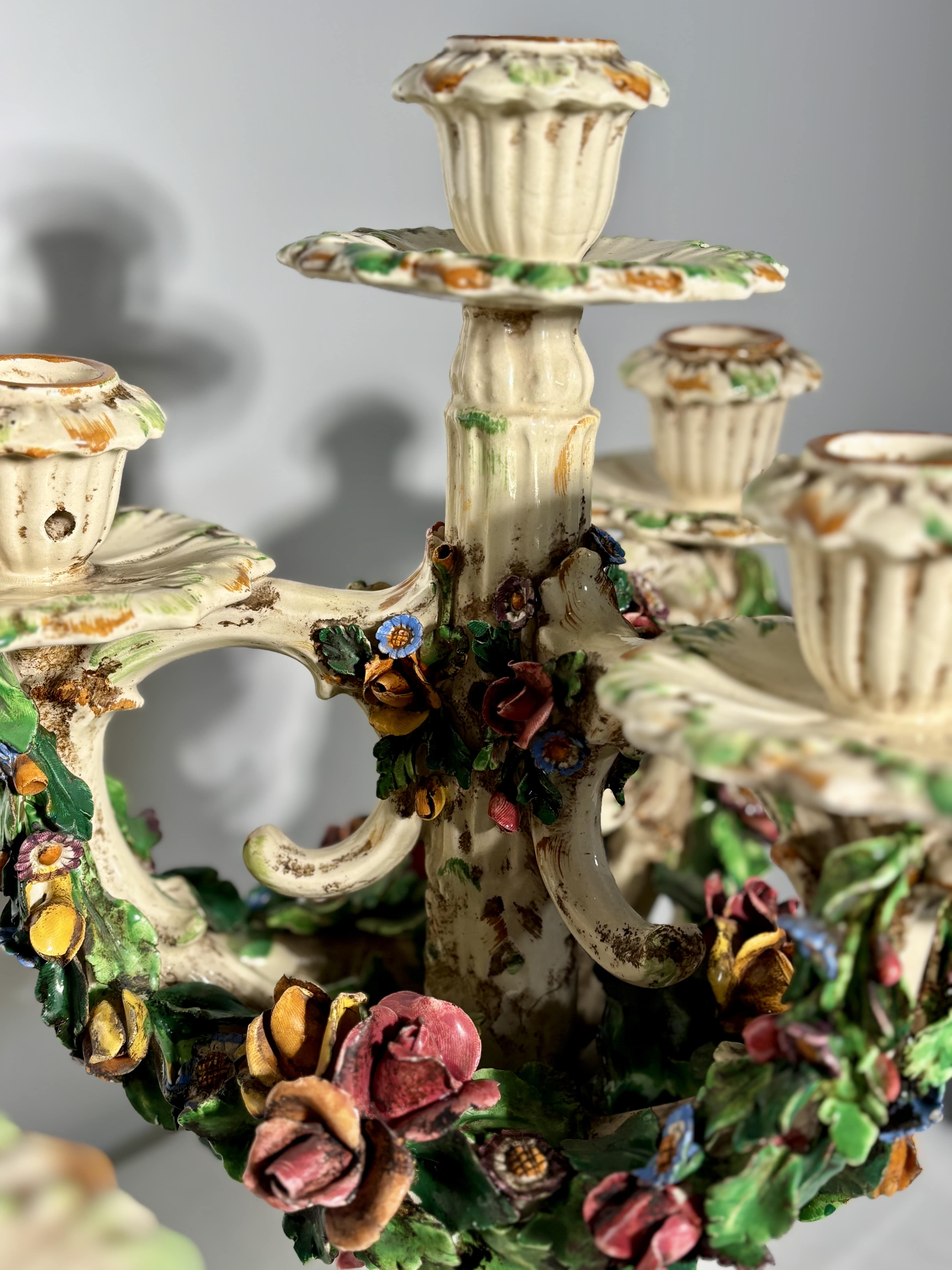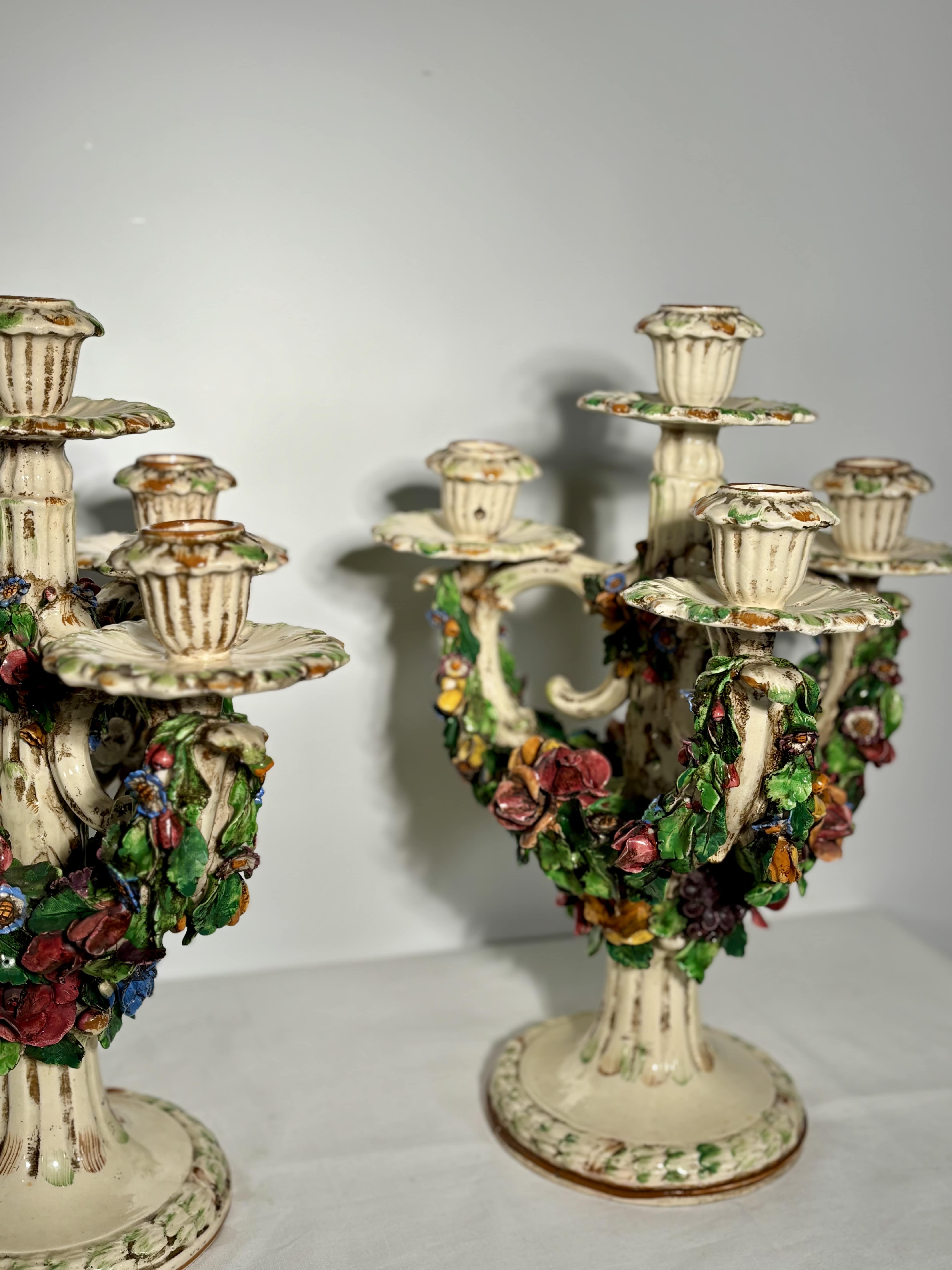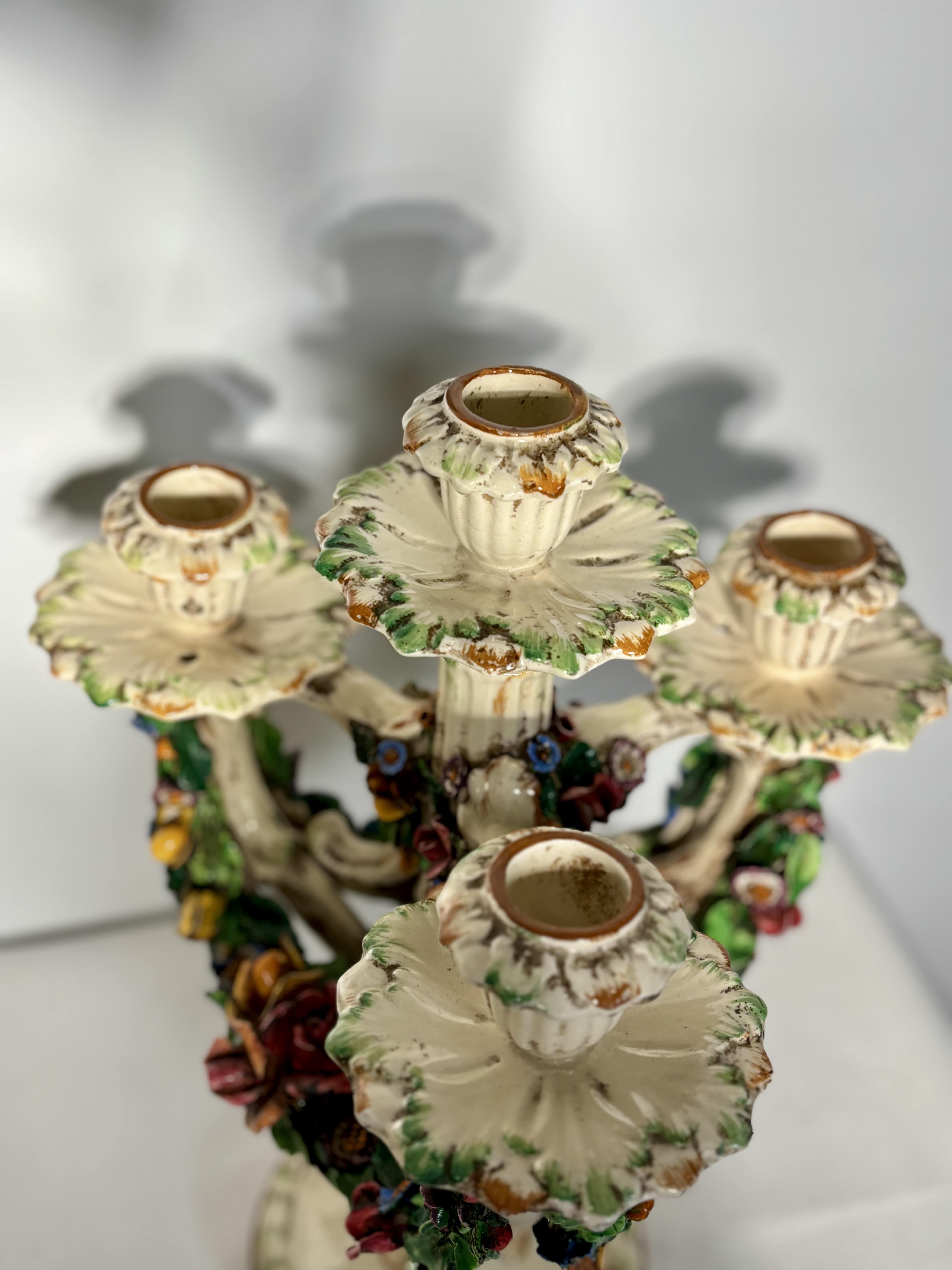 Céramique Italienne, technique du fiori applicati. Très bel état. Superbe paire de candélabres en céramique italienne, travail de Bassano del Grappa, réalisée entre les années 1920 et 1940. Ces pièces illustrent parfaitement la tradition décorative vénitienne du fiori applicati, ou chaque fleur, pétale, feuille est modelé à la main puis appliqué une à une sur la structure. Ce savoir-faire, d'une grande finesse, constitue l'une des signatures historiques des ateliers de Bassano. La composition très florale reprend les codes décoratifs du baroque vénitien: guirlandes torsadées, rosettes, couleurs profondes et émaillage ivoire, typique de la production du début du XXe siècle. Bel état de conservation. Patine douce et homogène. Italie, XXe siècle.
