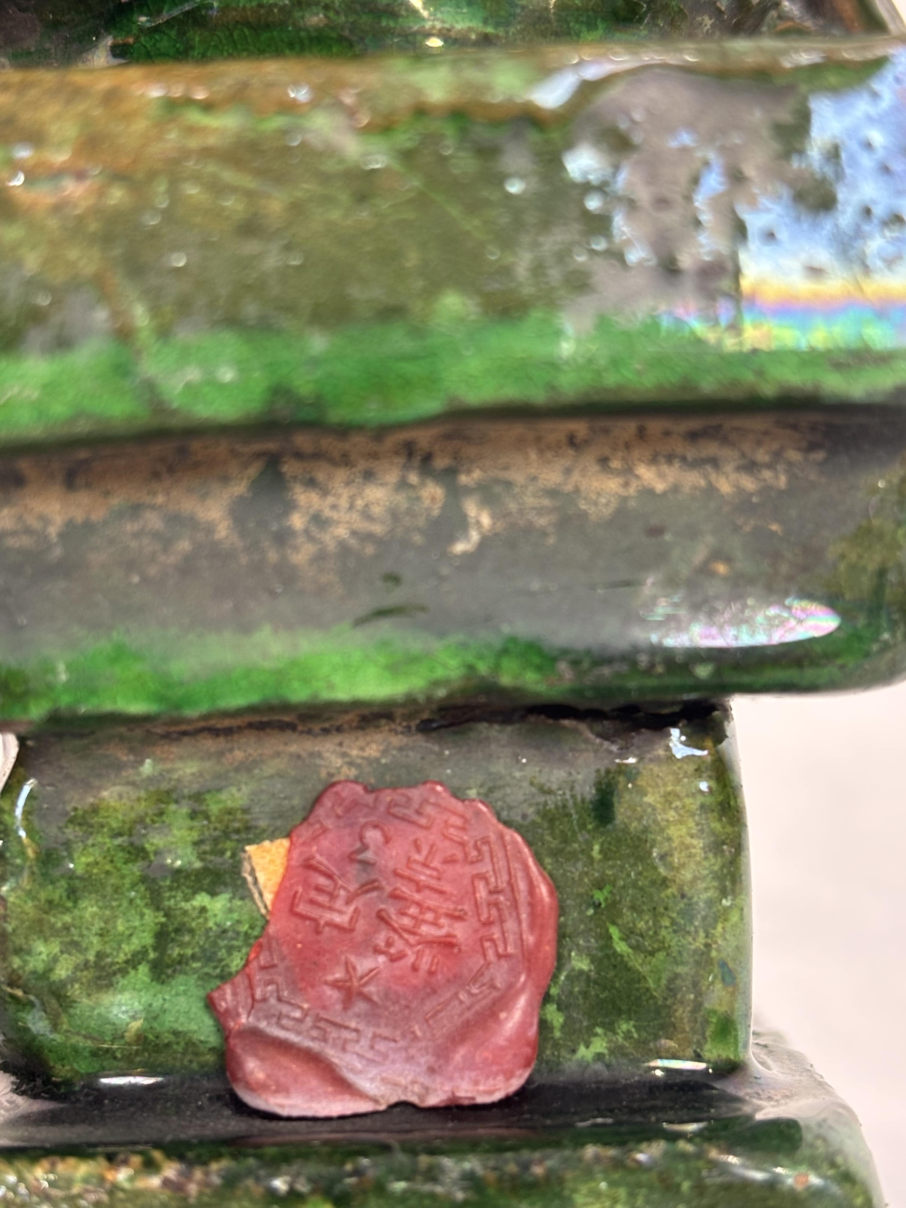 Paire de chiens de Fô gardiens chinois en céramique émaillée vert profond. Ces figures traditionnelles symbolisant la protection étaient autrefois placées à l'entrée des demeures et temples pour éloigner les influences néfastes. Leur allure expressive, le traitement stylisé des crinières et des volutes décoratives leur confèrent beaucoup de caractère. Les bases architecturées, formées de gradins superposés, soulignent leur stabilité et leur rôle de sentinelles. L'émail vert présente de subtiles nuances et un léger miroitement, accentuant l'effet vivant de la surface. Les socles portent encore un cachet de c ire rouge ancien, témoin d'une exportation ancienne. Belle patine.