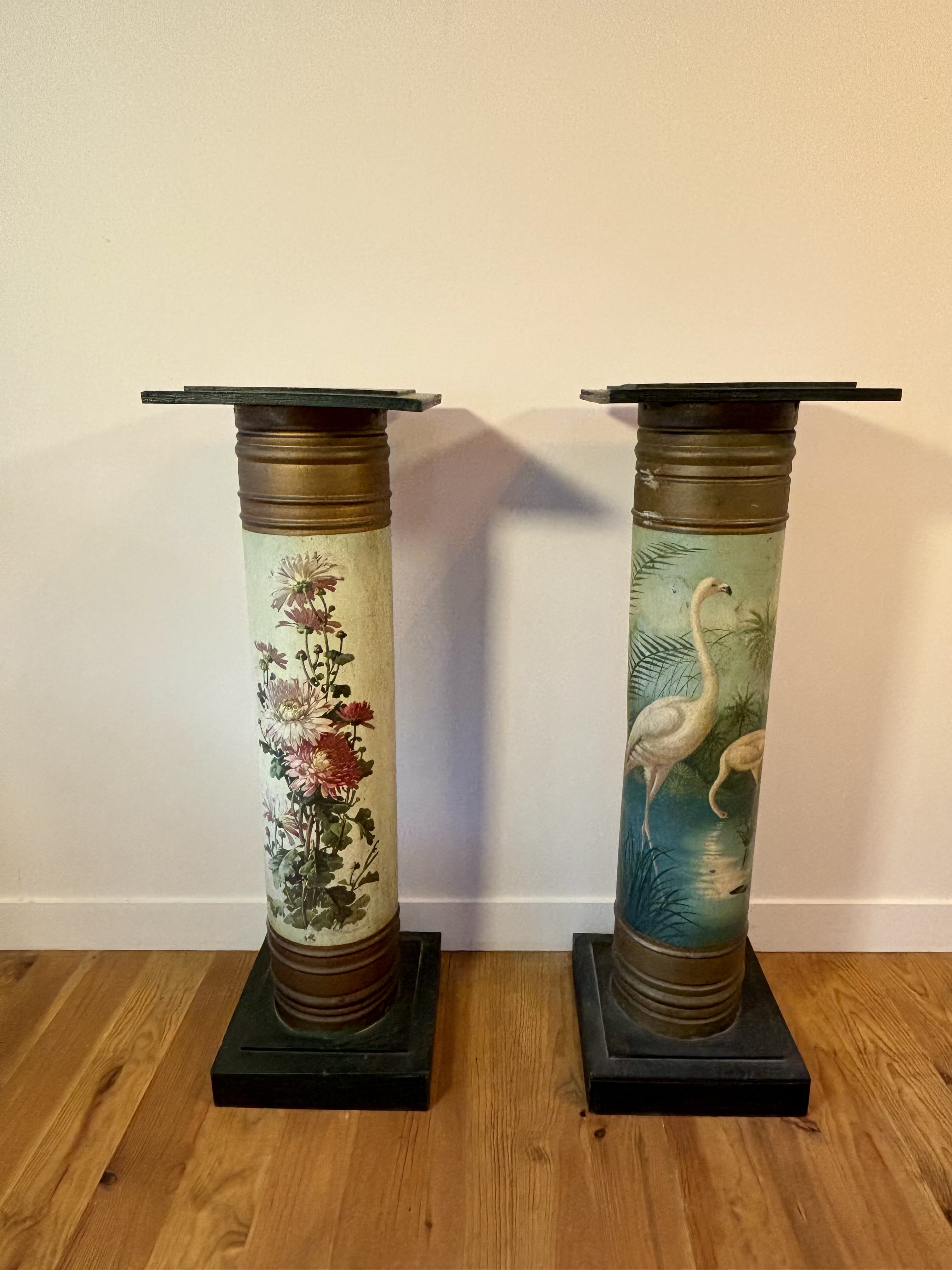Belle paire de colonnes en tôle peinte à décor de fleurs et de flamands roses. Base et plateau en bois. 19e siècle, Napoléon III. Dimensions du plateau : 29,7 x 29,7 cm
