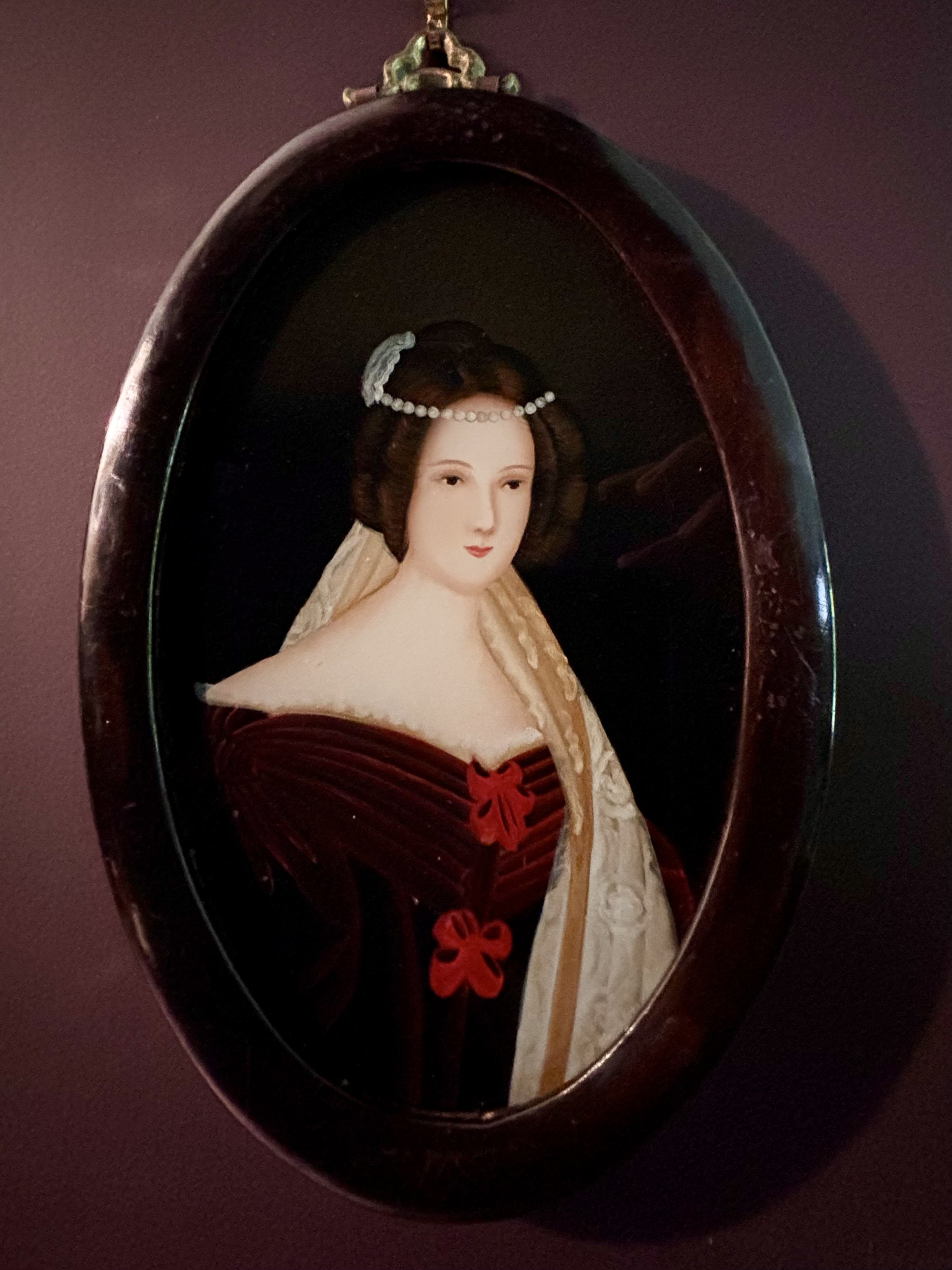 Charmante paire de fixé sous verre ou peinture sous verre, portraits d'élégantes, 20e siècle. Encadrement en bois massif. Le revers en panneau de bois. La peinture sous verre est une technique unique car l’œuvre est réalisée sur le dos du verre.