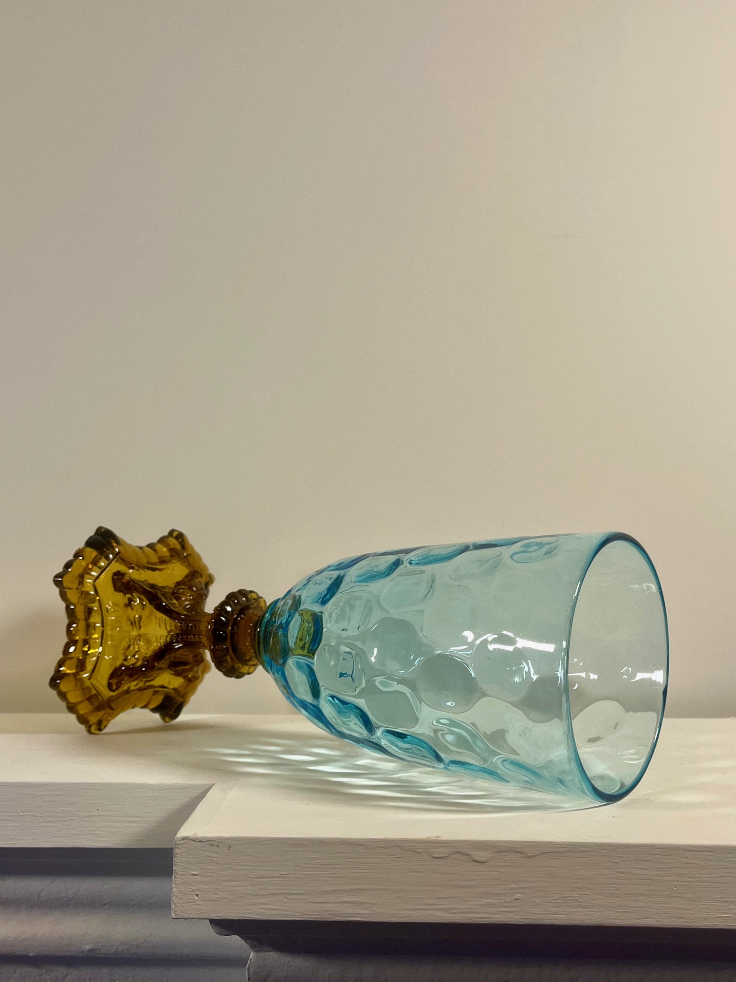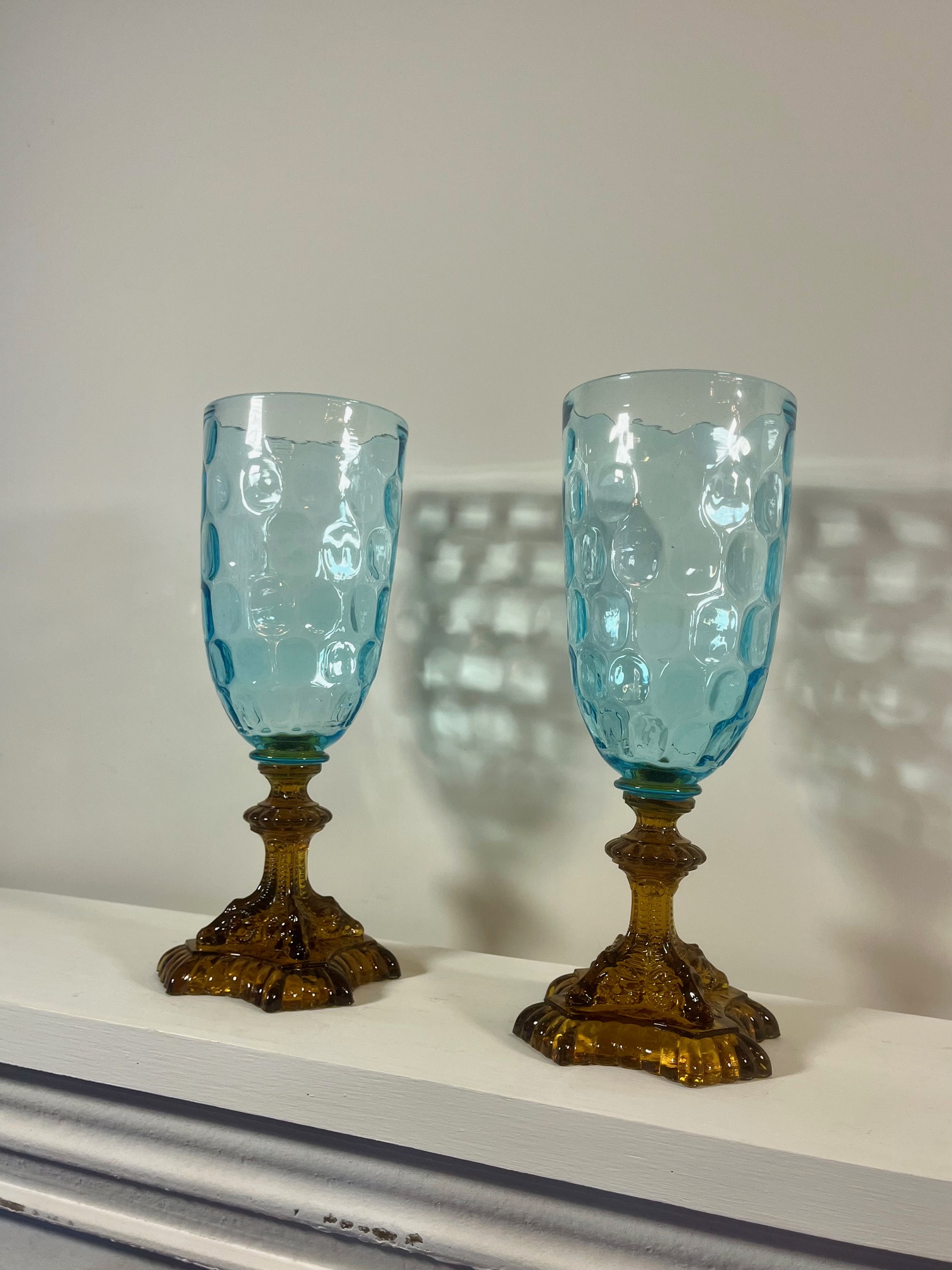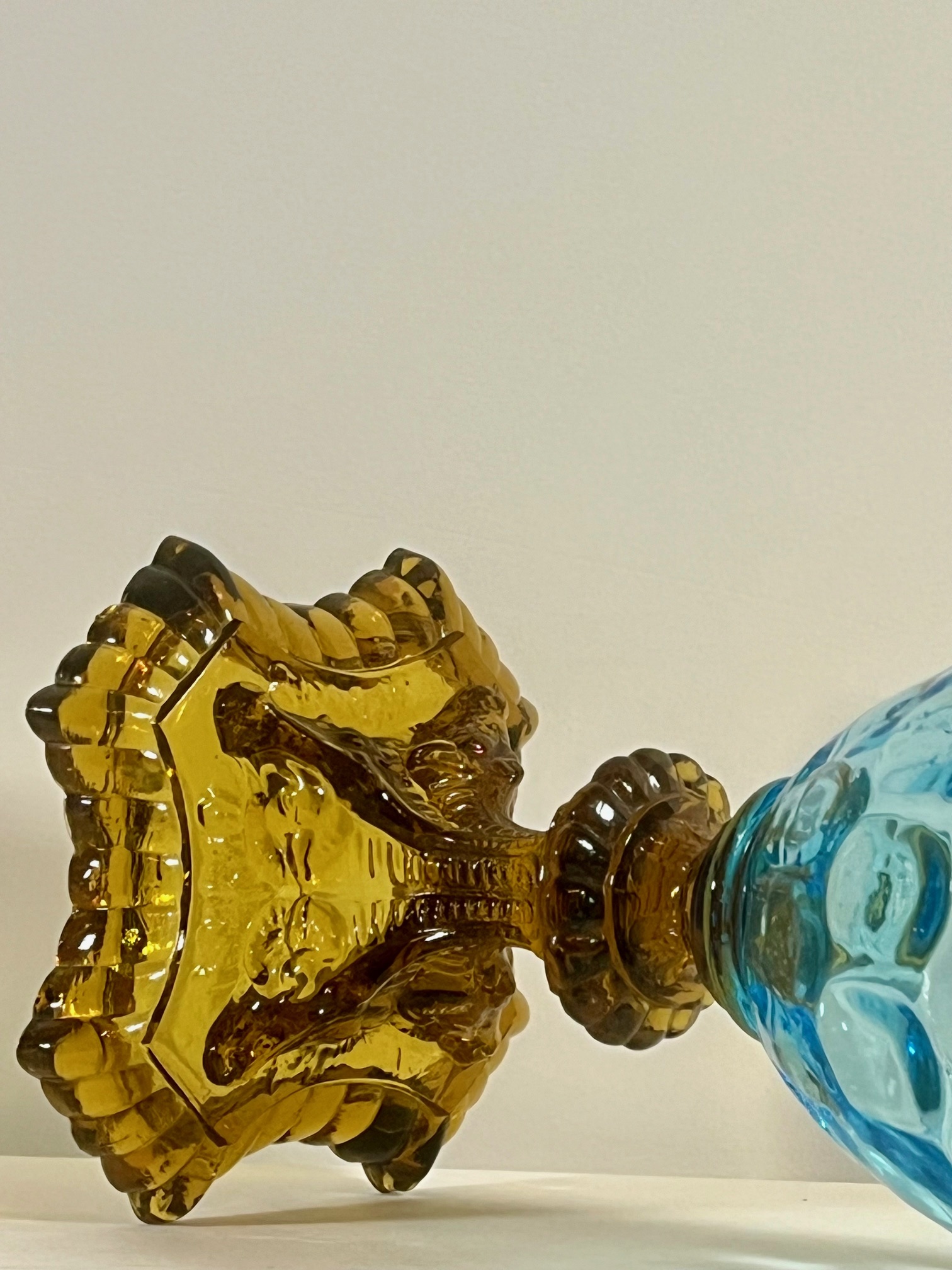 Superbes grands vases anciens en verre pressé de la Cristalleries de PORTIEUX (1705-2012) modèle George Sand, coupe bleu turquoise et piètement ambre à têtes de béliers. Le modèle George Sand signé Portieux a été pressé vers 1900. Fondée en 1705, la cristallerie a travaillé au fil des siècles pour les tables les plus prestigieuses, pour le tsar Nicolas II de Russie, l’écrivaine George Sand, le Ritz ou le Kazakhstan. Et en 2005, les verriers ont fabriqué 2 000 verres bicolores pour le mariage d’Elton John. Etat parfait.