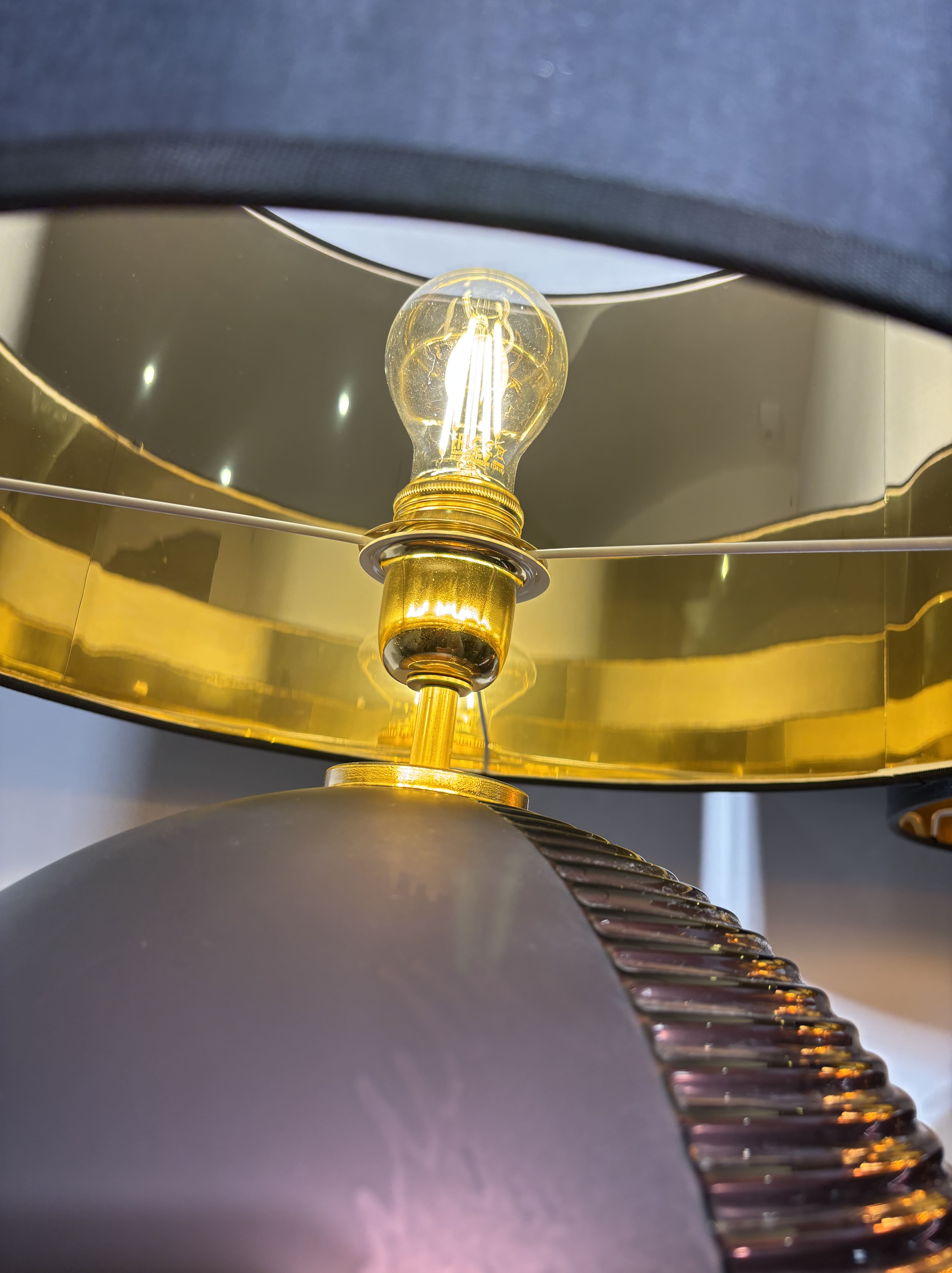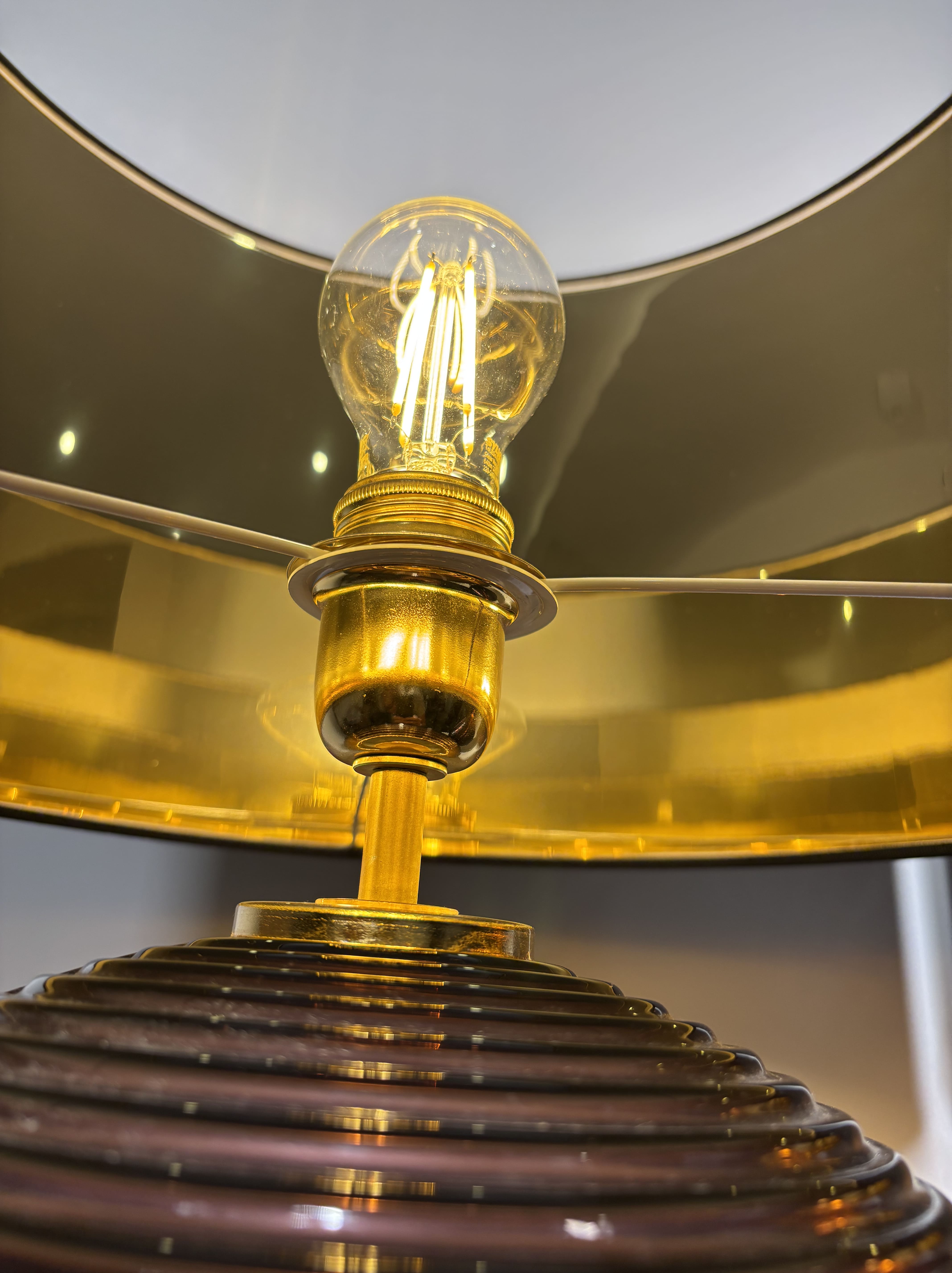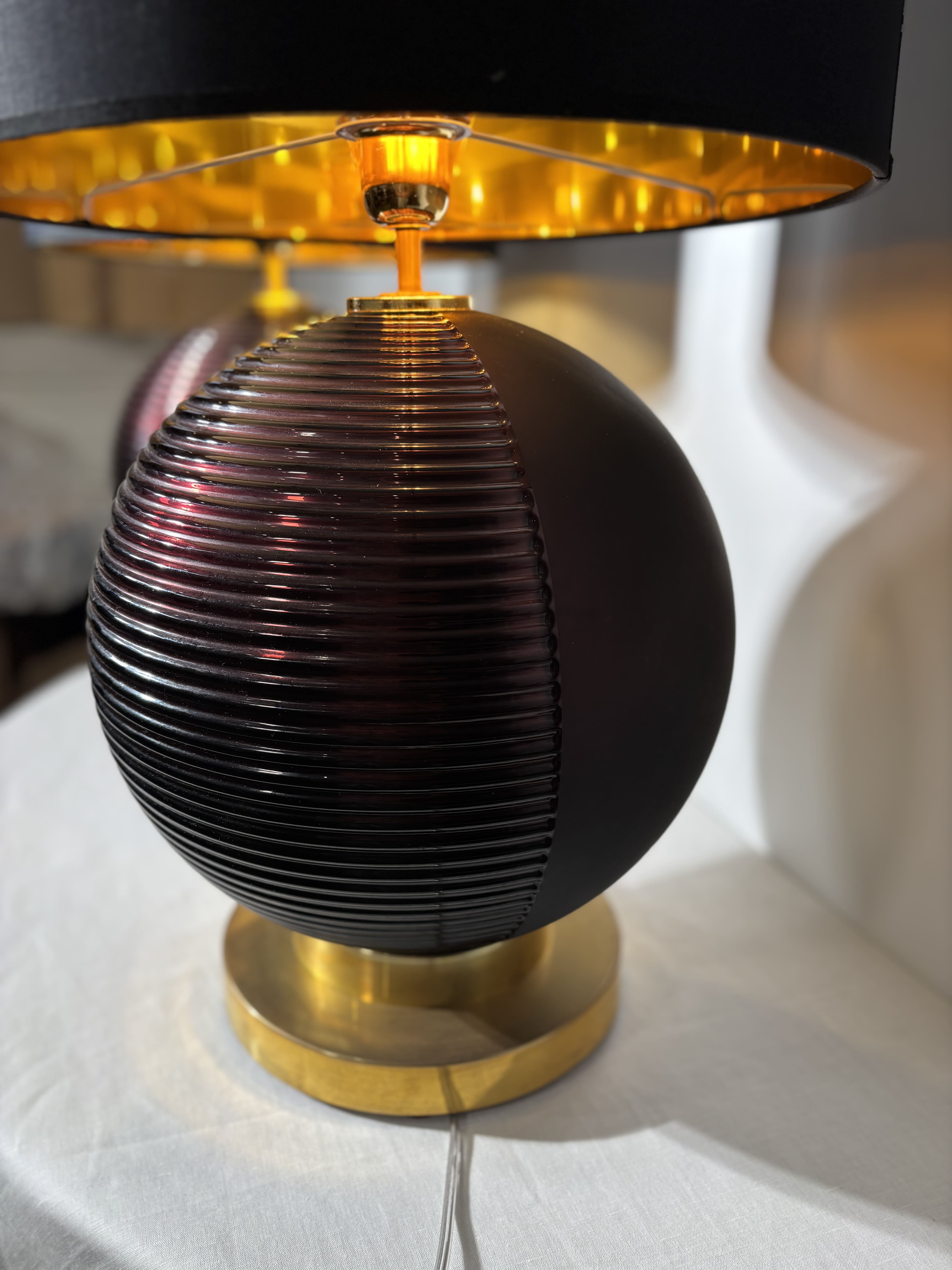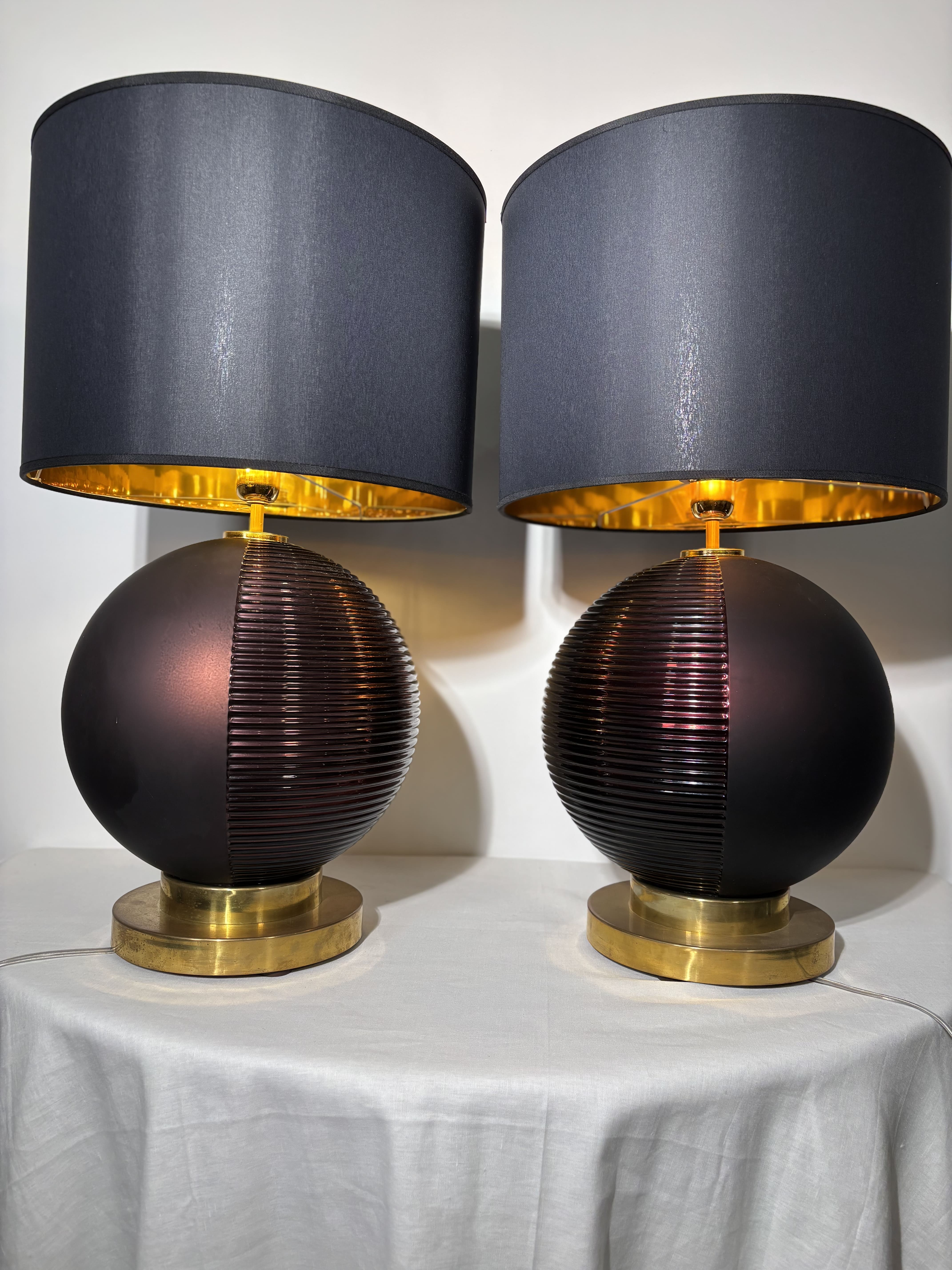 Paire de lampes italiennes spectaculaires en verre de Murano soufflé moulé des années 1980. Les sphères présentent une teinte prune profonde, satinée sur la moitié de la sphère et brillante et striée sur l'autre moitié. Bases circulaires en laiton. Abat-jour cylindriques noir et doré. Pièces décoratives spectaculaires, graphiques. Peuvent être vendues à l'unité au prix de 950 euros la lampe
