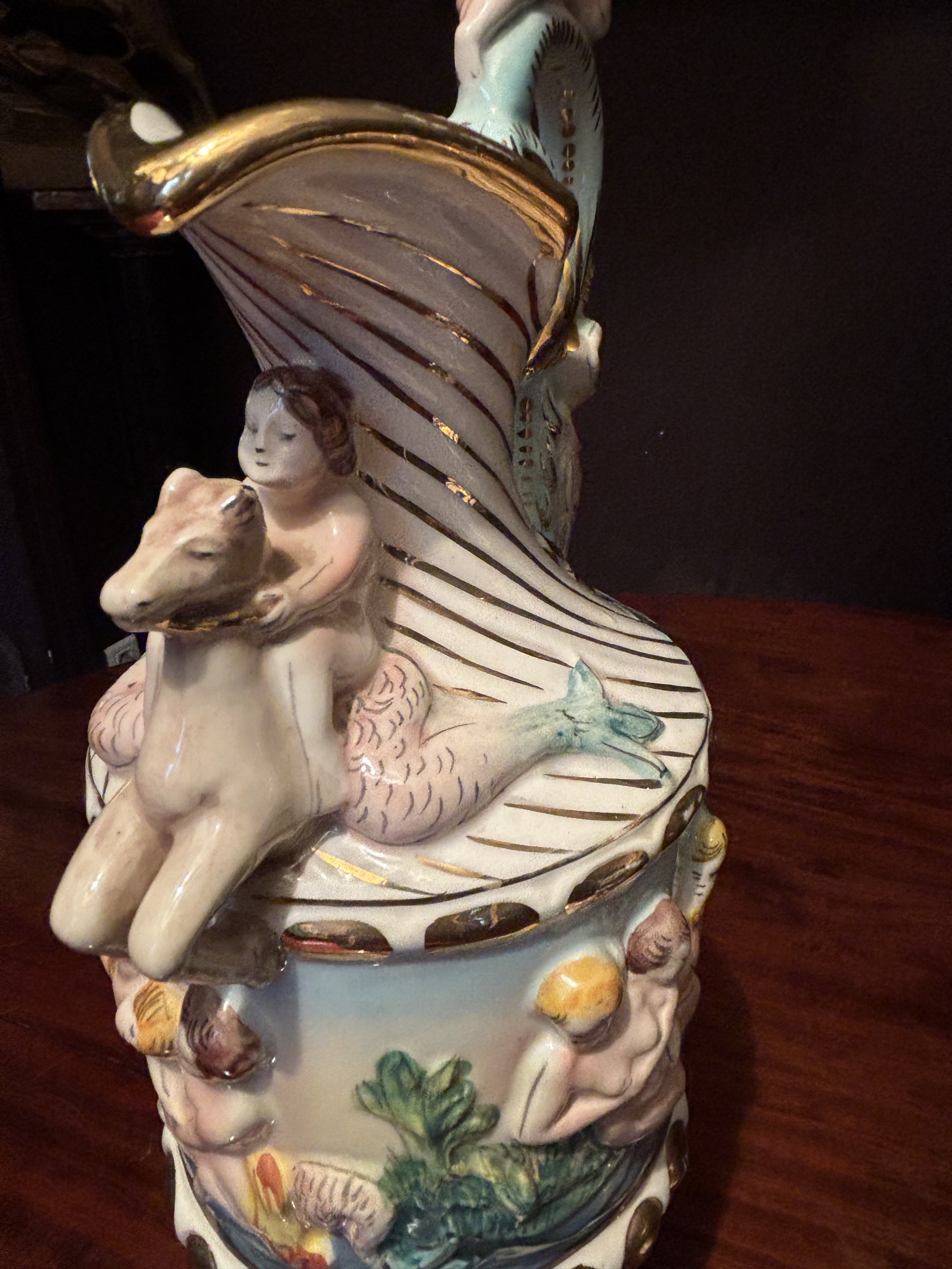 Paire de pichets décoratifs en porcelaine peinte et dorée Capodimonte ornés de scènes mythologiques en relief. Marqué sous la base : 219 Italy Capodimonte XXe siècle