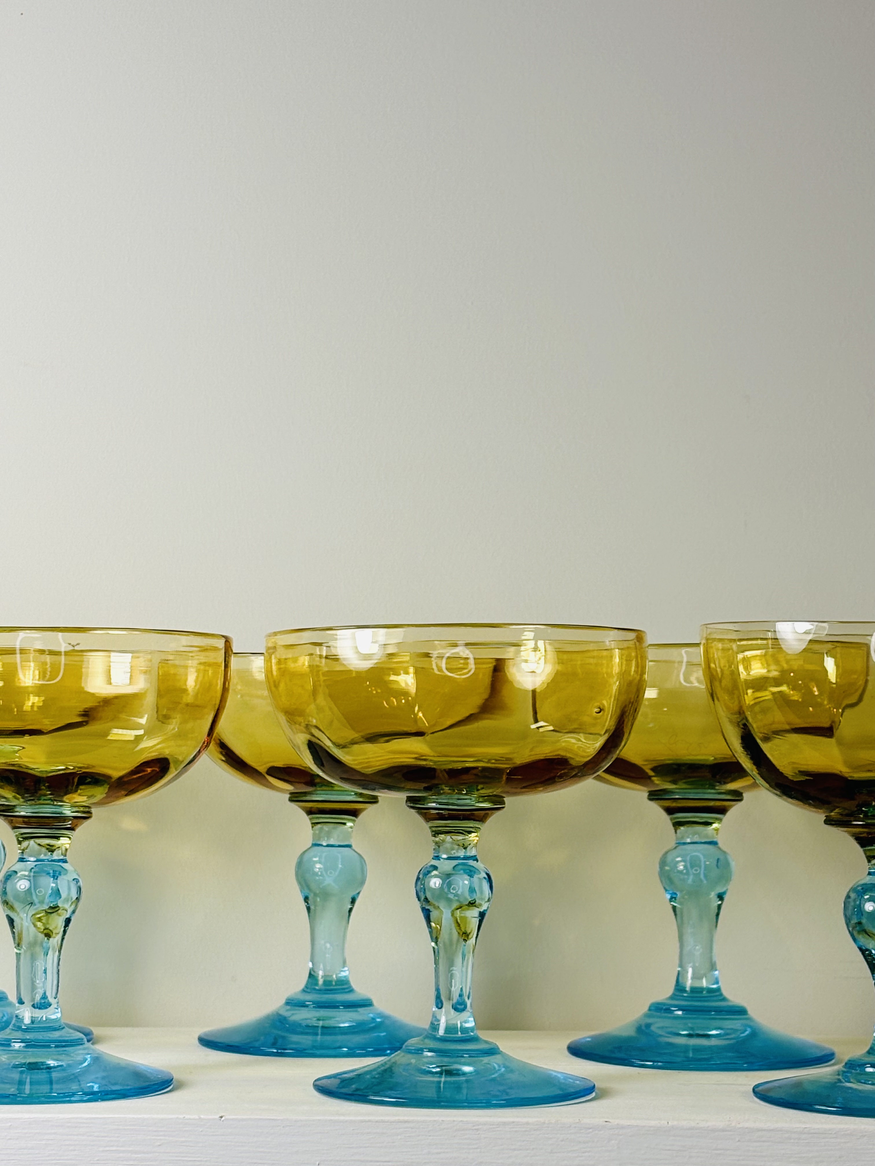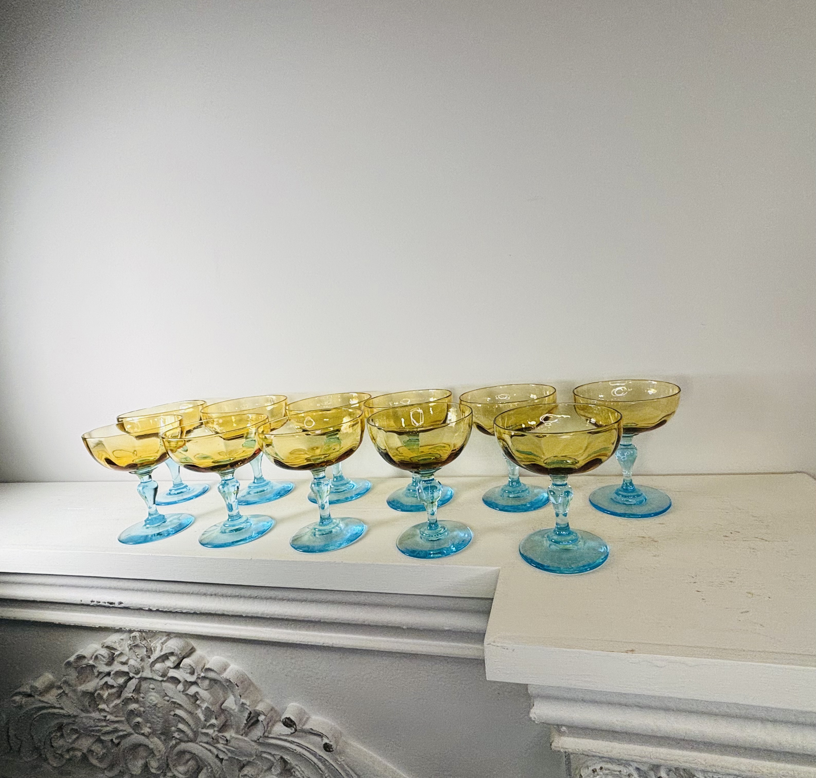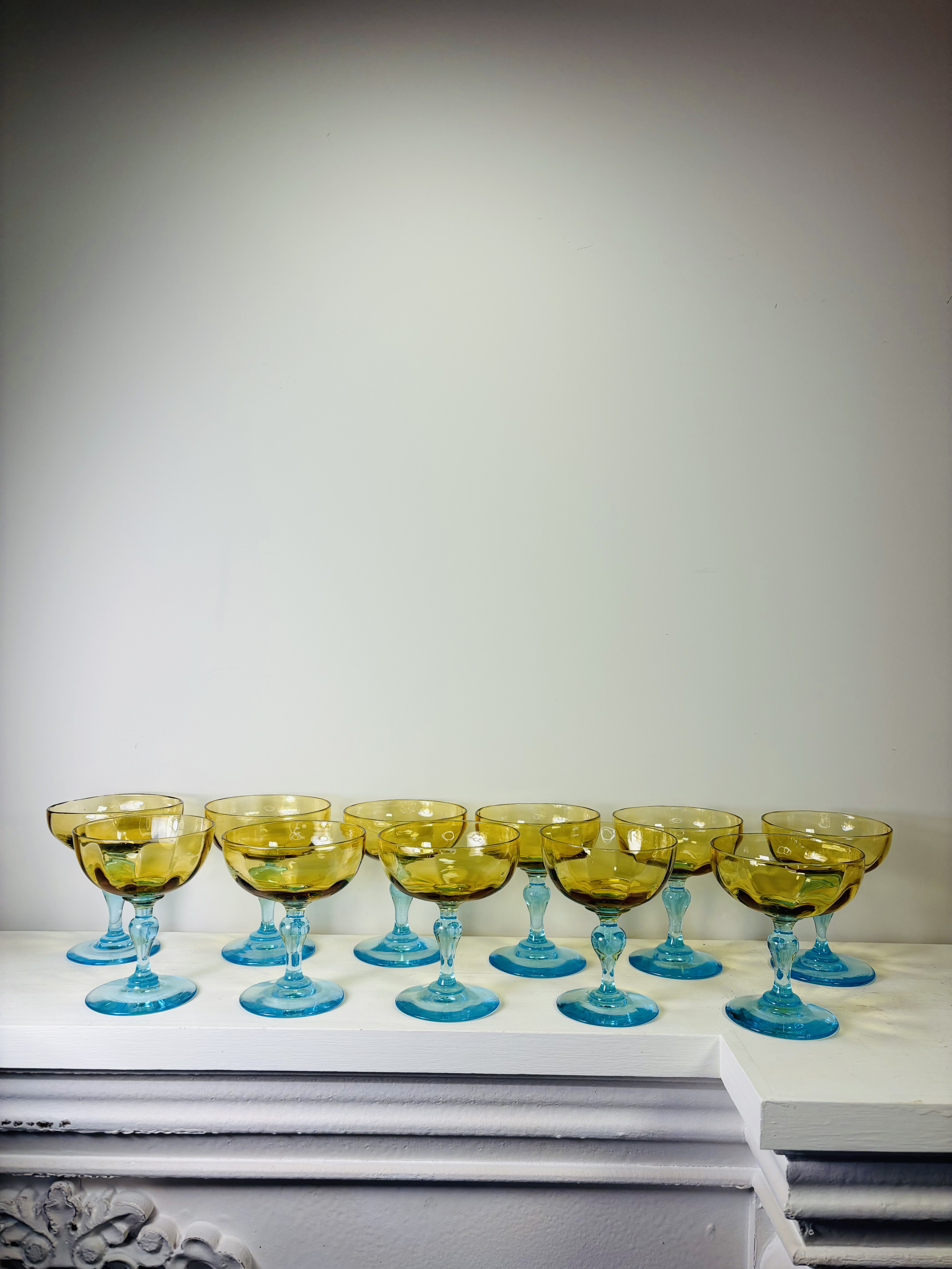 Rare et magnifique suite de onze coupes à champagne de la cristallerie Portieux en France, modèle George Sand. 19ème siècle. Pied balustre de couleur bleu, coupe jaune ambrée. En parfait état. Chaque verre est une pièce unique réalisée à la bouche par l’artisan. La petite histoire de France voudrait que ce modèle fut offert par Chopin à Georges Sand.