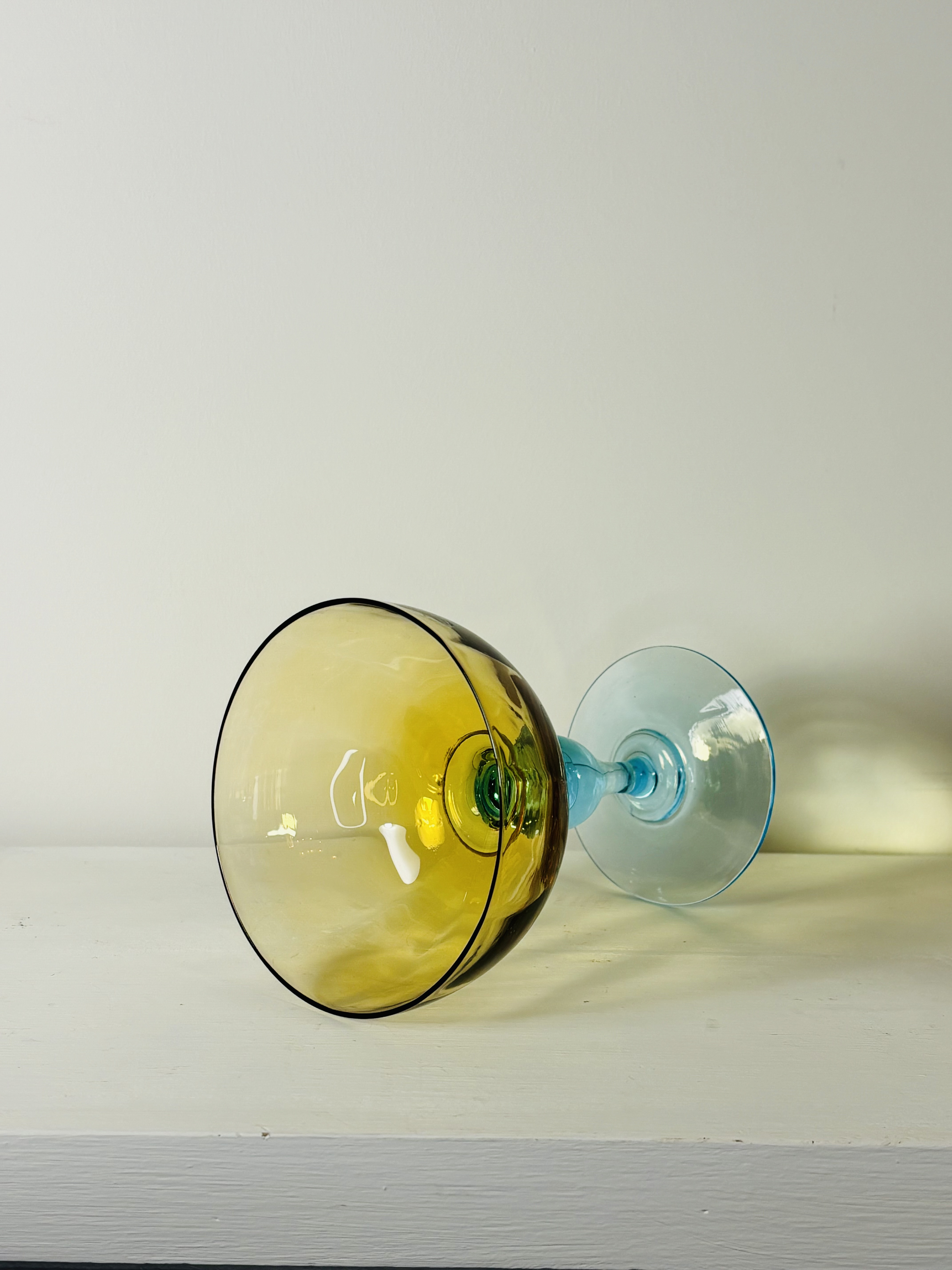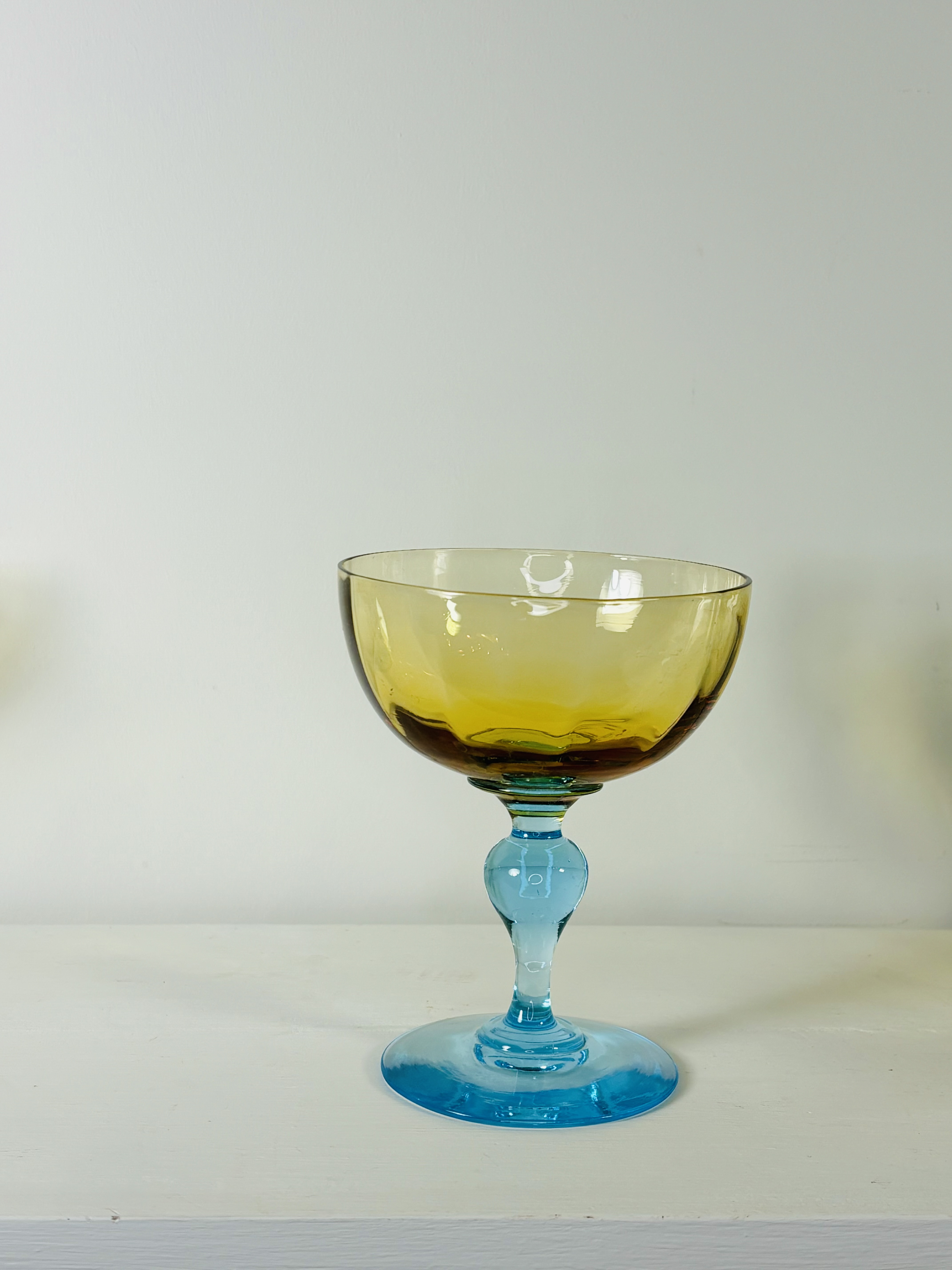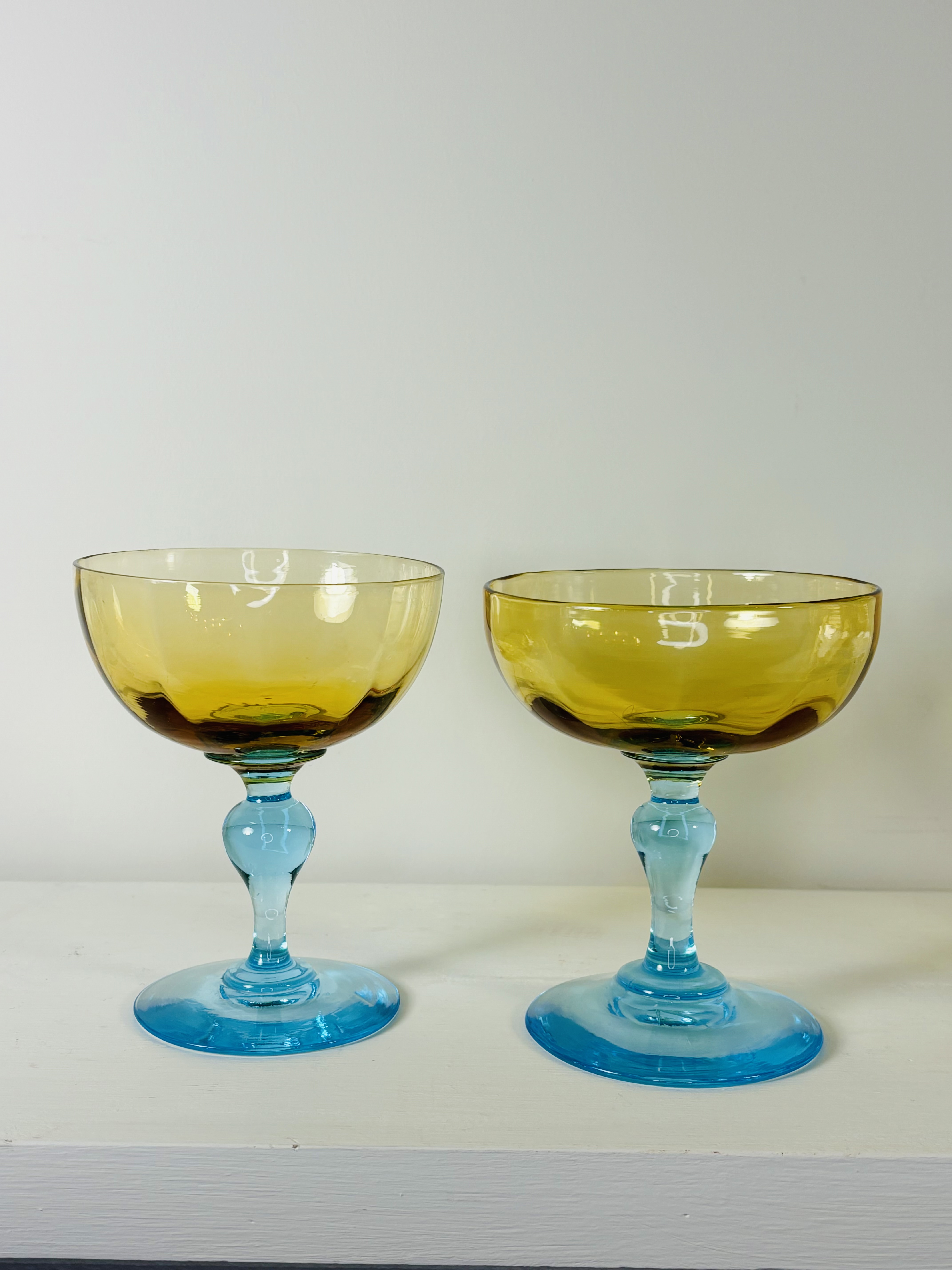 Rare et magnifique suite de onze coupes à champagne de la cristallerie Portieux en France, modèle George Sand. 19ème siècle. Pied balustre de couleur bleu, coupe jaune ambrée. En parfait état. Chaque verre est une pièce unique réalisée à la bouche par l’artisan. La petite histoire de France voudrait que ce modèle fut offert par Chopin à Georges Sand.