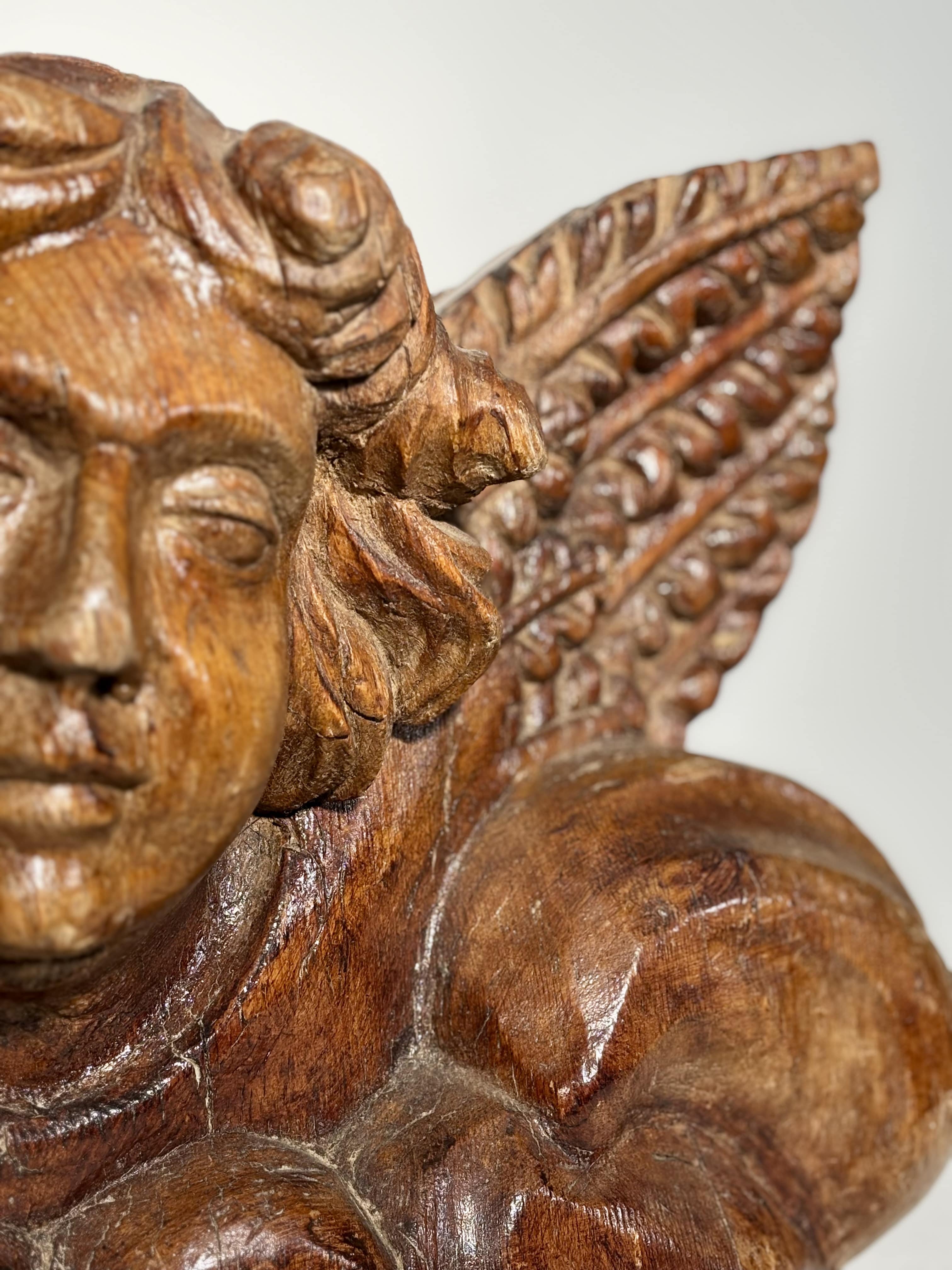 Rare sculpture en bois sculpté, représentant une tête d'ange ailée, traitée en fort relief. Ce fragment provient très probablement d'un élément architectural ou de boiserie religieuse (retable, décor d'église, ensemble conventuel). Le visage, plein et serein, présente une expression intériorisée typique de la sculpture baroque française provinciale: paupières mi-closes, bouche fine, modelé doux mais profondément expressif. La chevelure est animée de boucles généreuses et creusées, conférant rythme et présence à l'ensemble. Les ailes déployées, stylisées et graphiques, accentuent la composition et renforcent la monumentalité de la pièce. Le revers, laissé brut, révèle les traces d'outils, assemblages anciens et reprises, attestant d'un démontage et d'un usage architectural. La patine chaude et nuancée, aux tonalités miel et brun, est authentique, marquée par le temps. Présence décorative très recherchée.