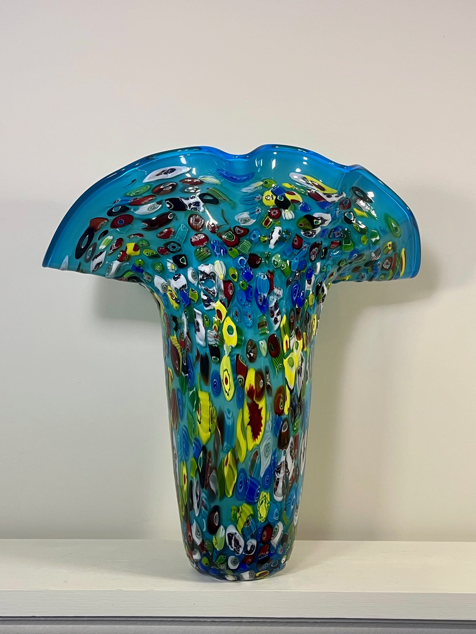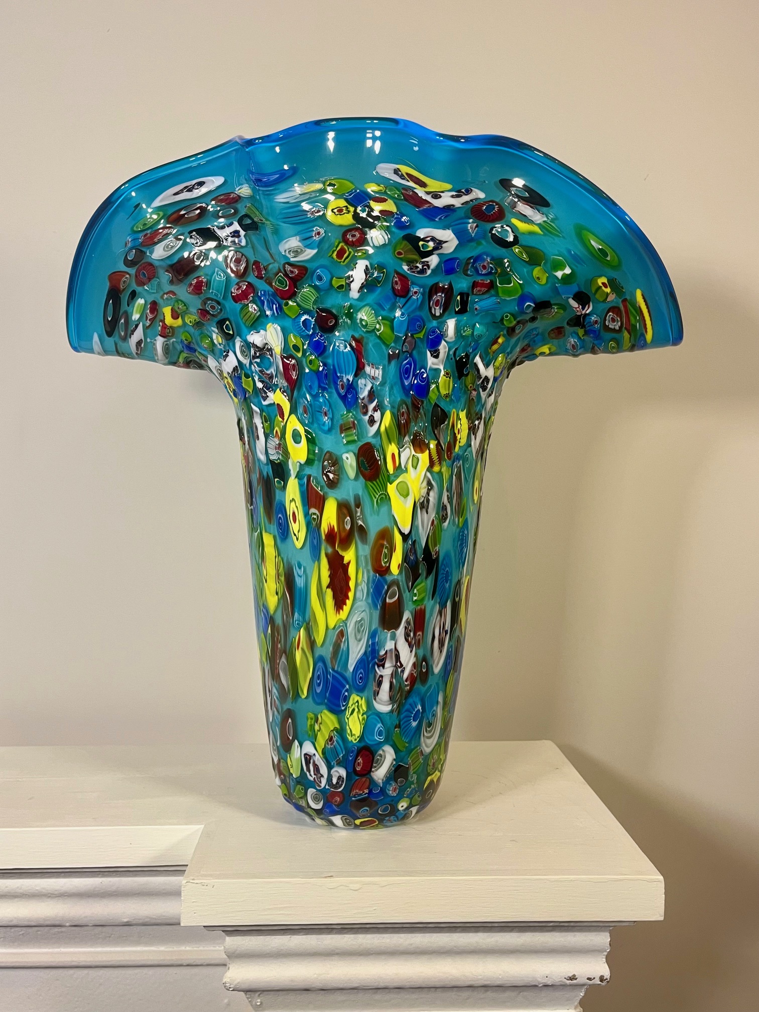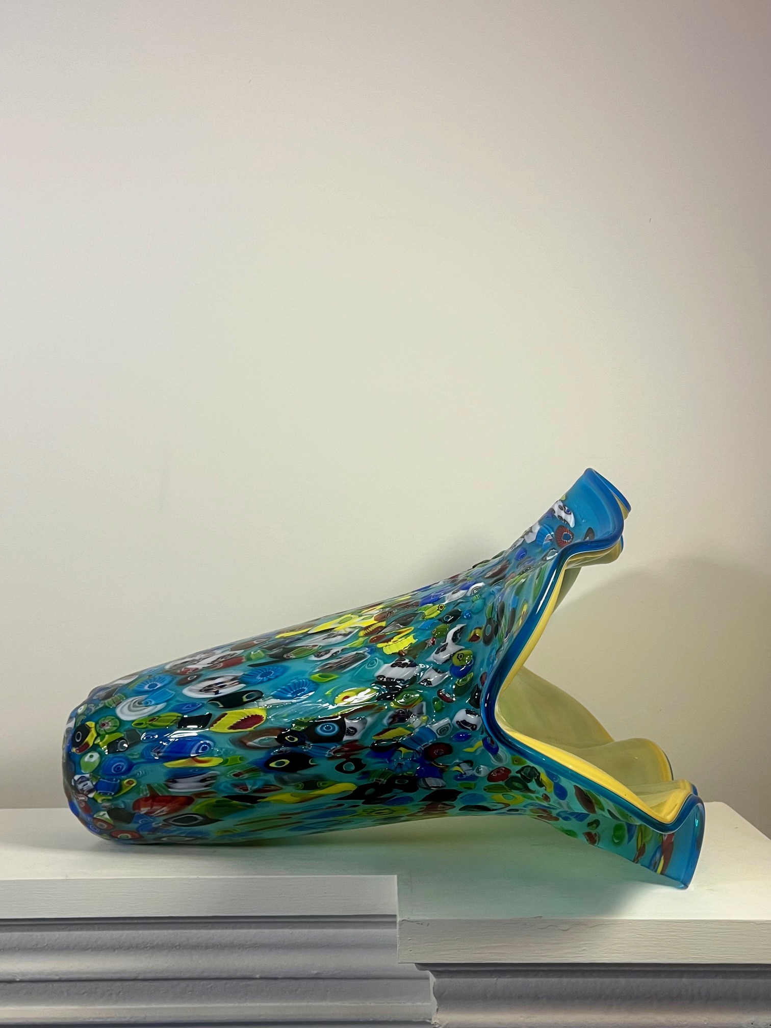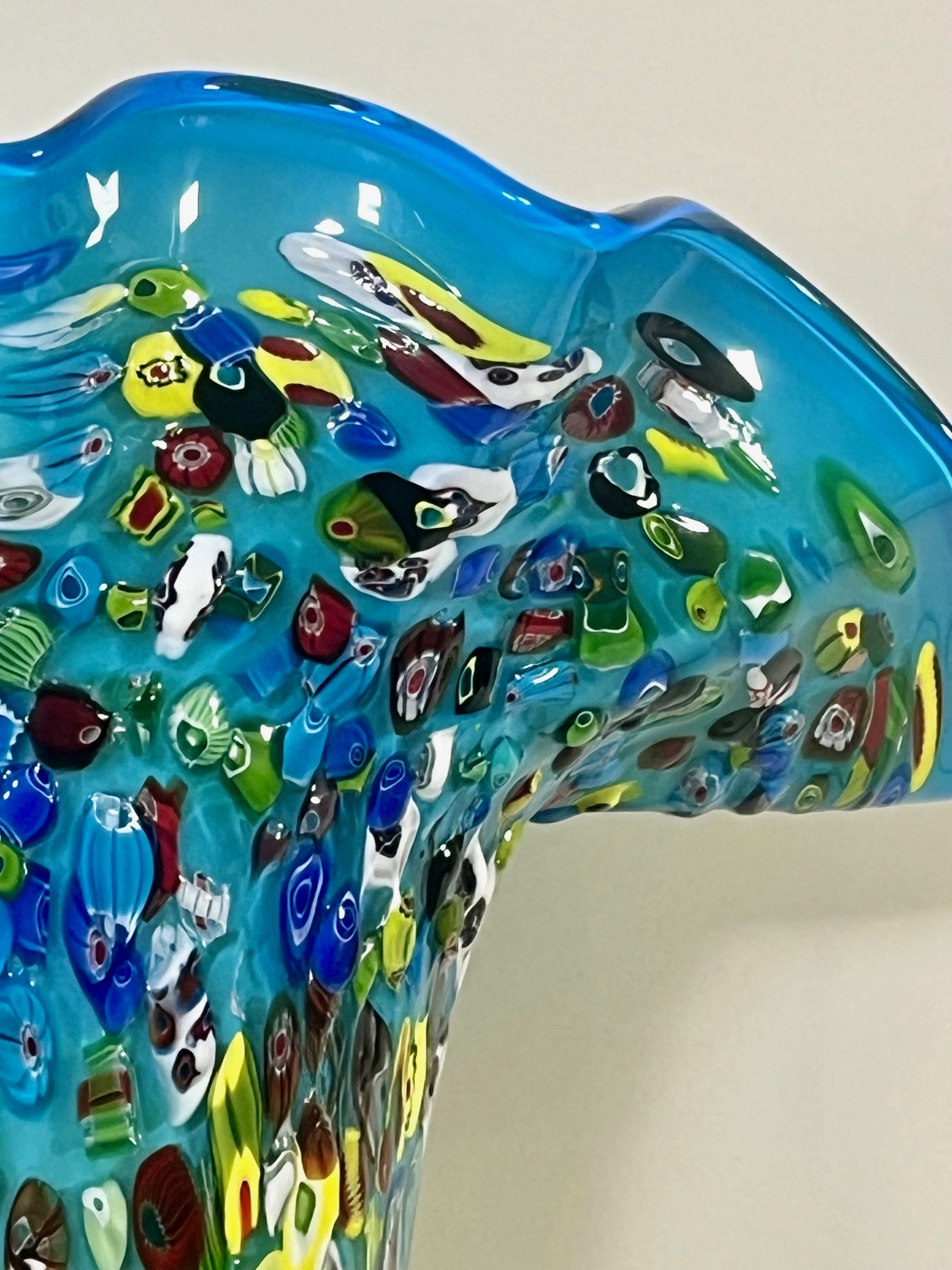 Très grand vase en verre de Murano datant de 1960, verre bleu avec de riches incrustations de verre millefiori à l'intérieur, bordure courbée jaune. Italie. Très belle pièce de qualité en parfait état.