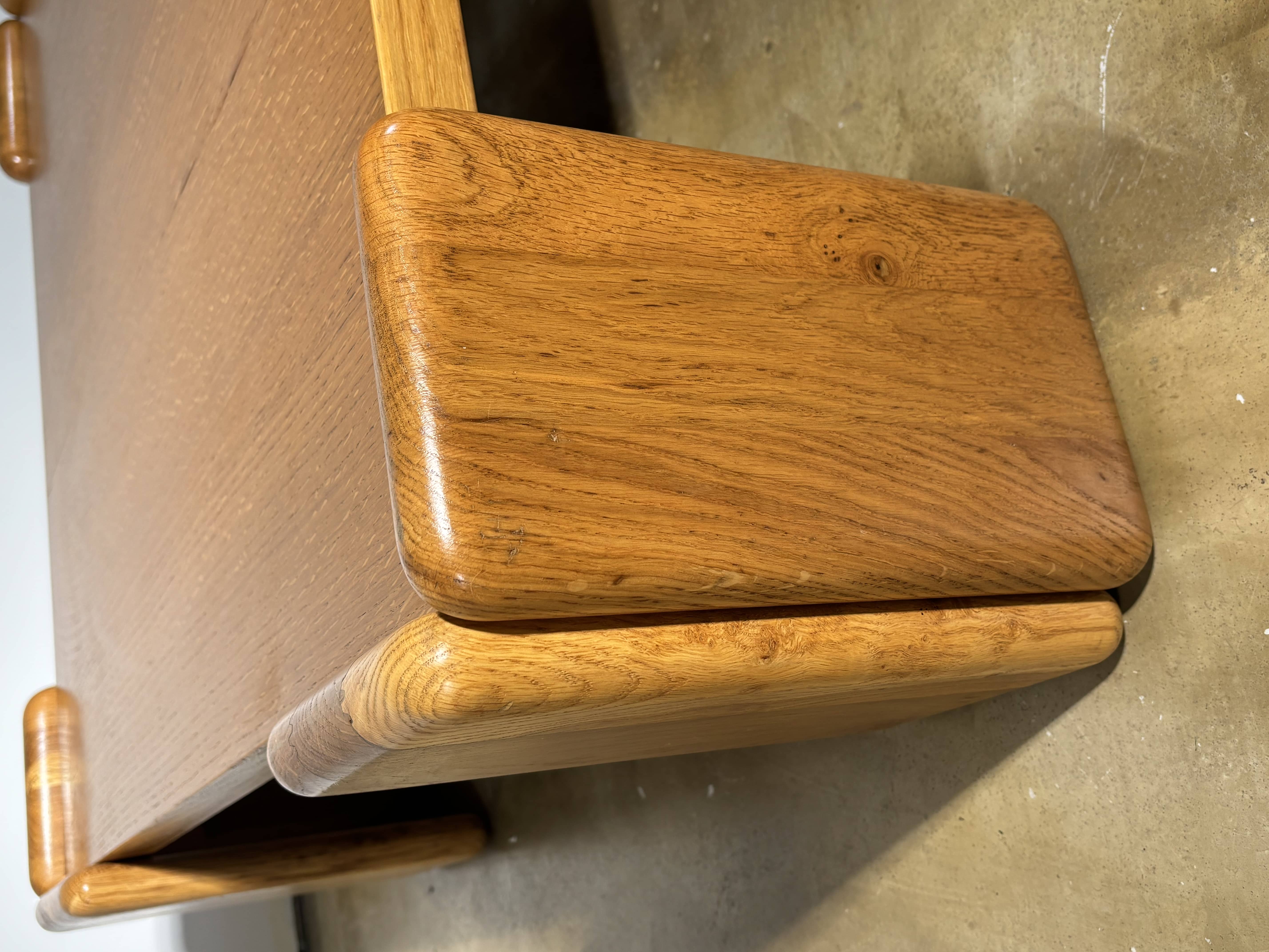 Le plateau repose entre les pieds dans un équilibre parfait entre robustesse et légèreté. La texture du chêne, les nœuds du bois et les arêtes soigneusement arrondies témoignent d'une fabrication de grande qualité.