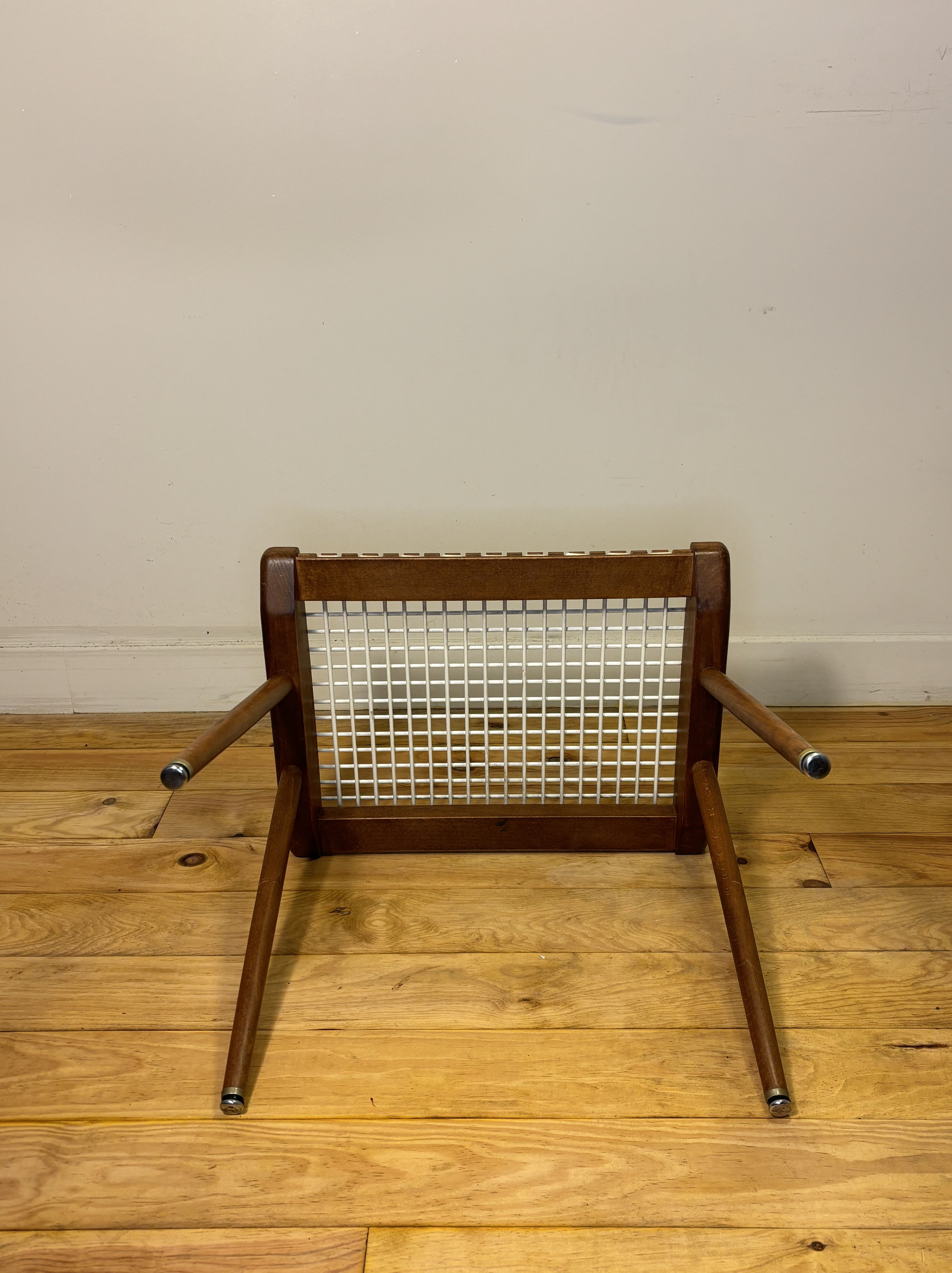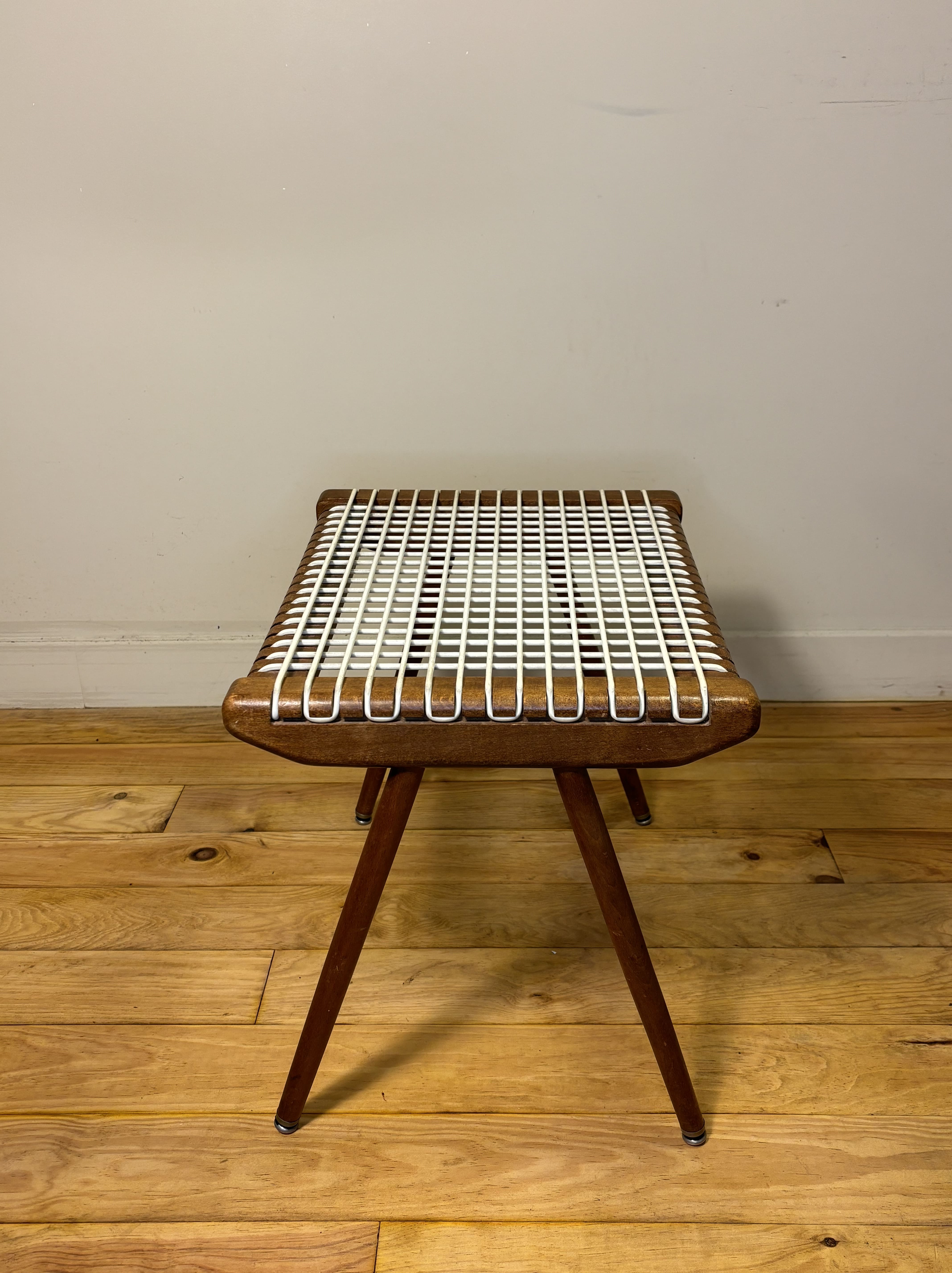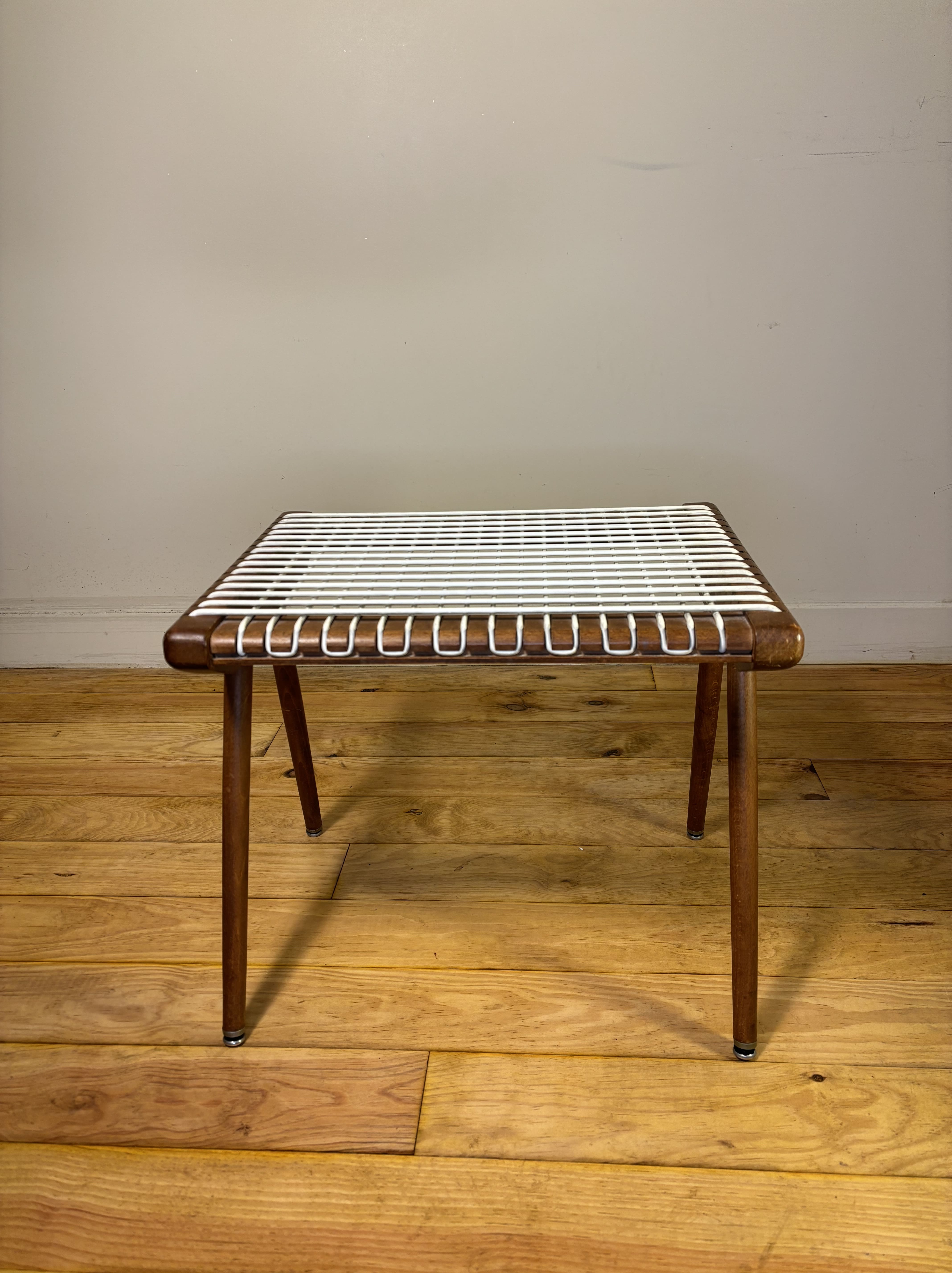 Tabouret ou bout de canapé vintage en teck et scoubidou de Georges Tigien, Editeur Pradera, 1950-1960. Laçage de jonc plastique blanc dit fil « prénas ». Il incarne le style emblématique de l'époque et est en excellent état.