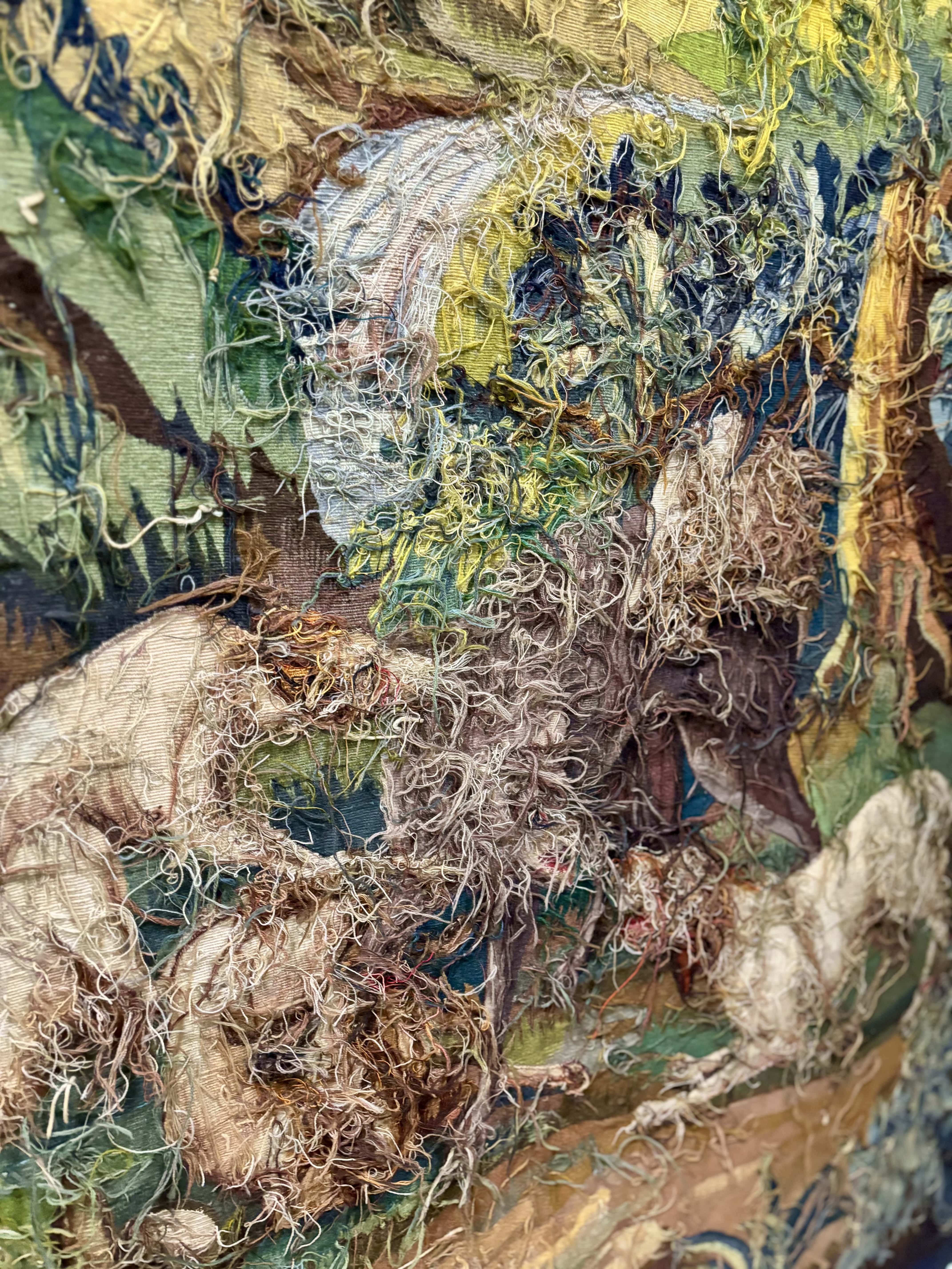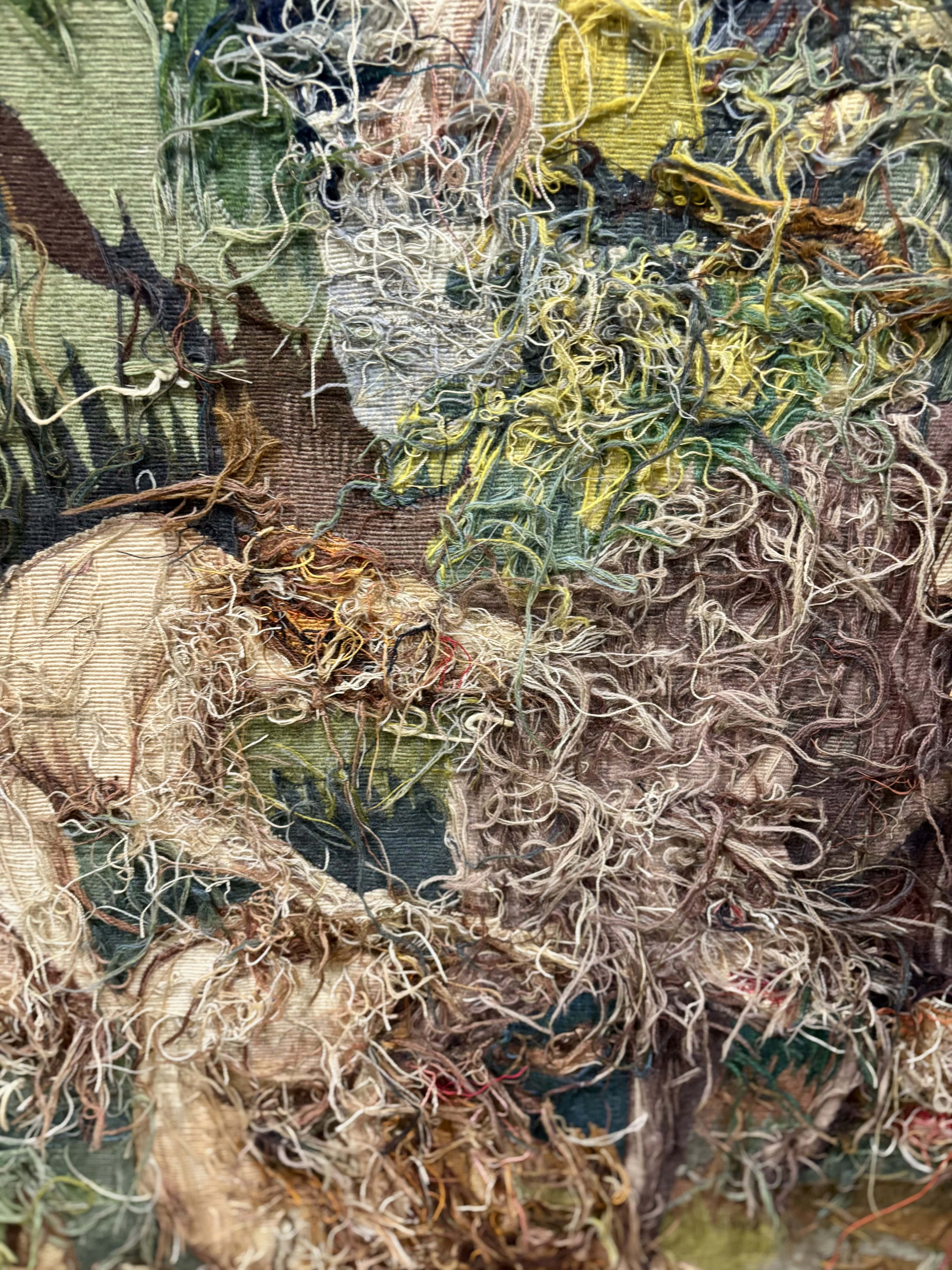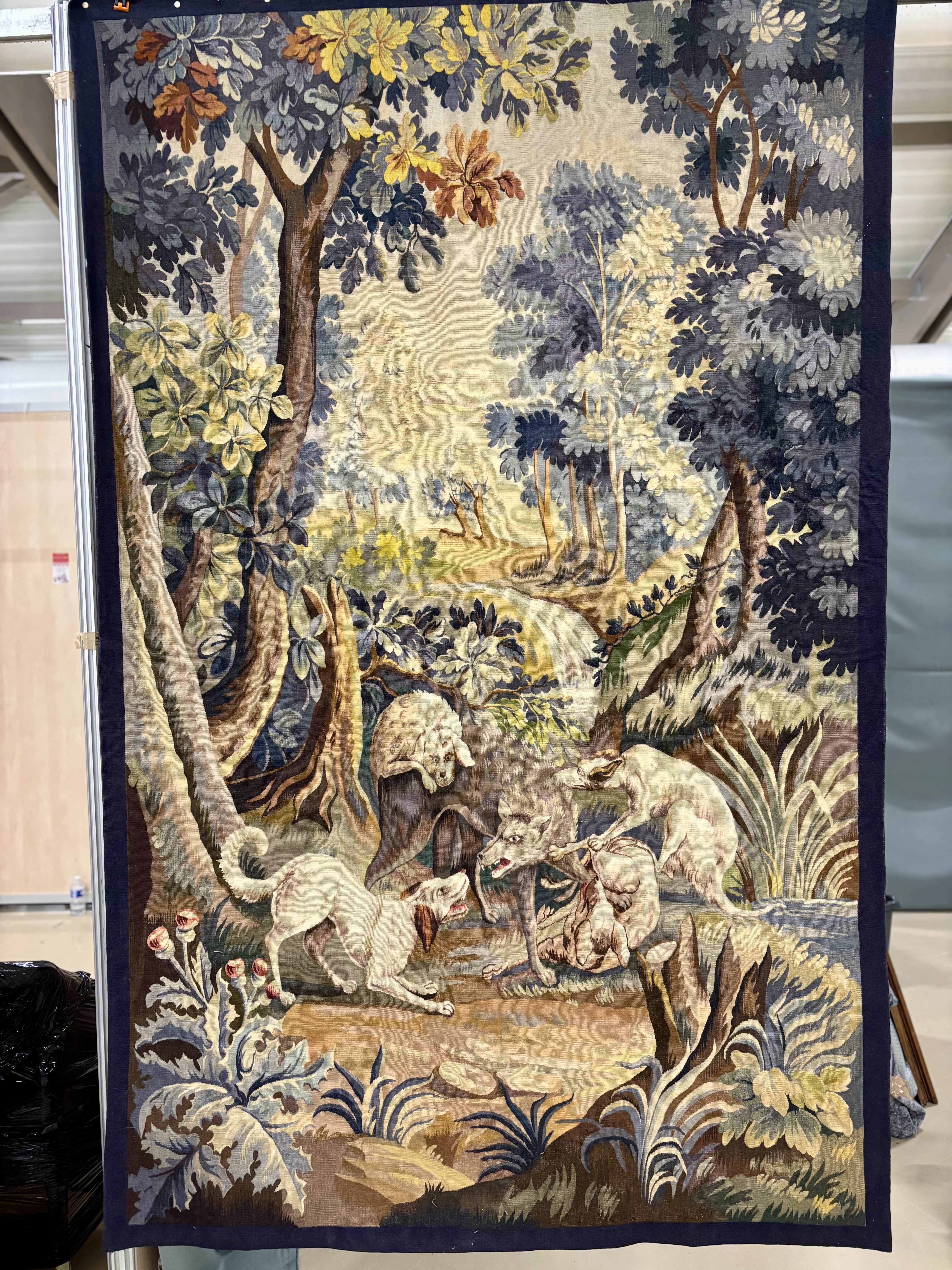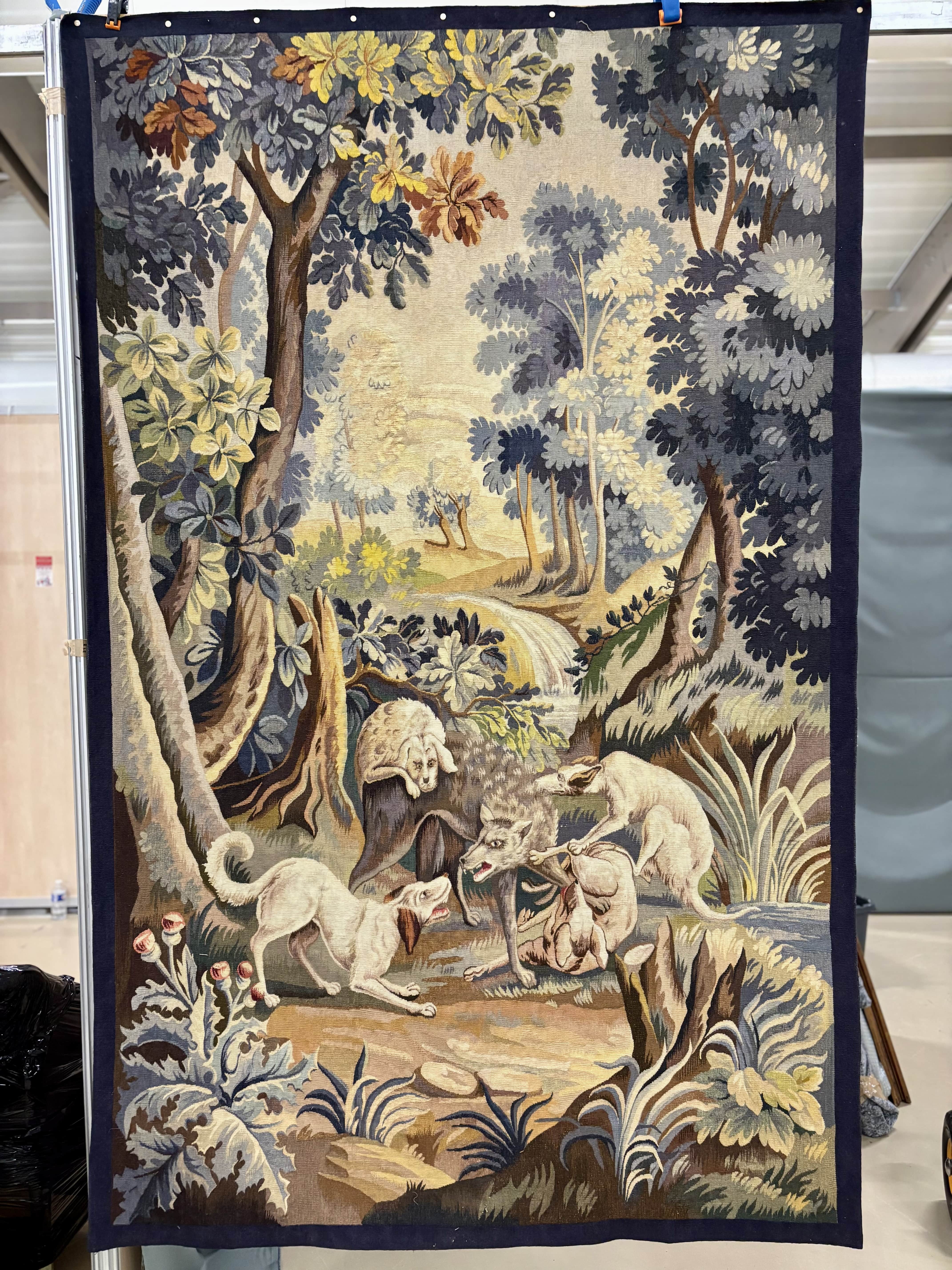 Superbe tapisserie tissée main à Aubusson, issue de l'Atelier Jean Picaud présentant un décor de chasse au loup dans un paysage boisé à la manière des grandes verdures classiques. La scène meten valeur un loup cerné par une meute de chiens, traitée avec un sens remarquable du mouvement et de la dramaturgie. L'ensemble est rythmé par un jeu de feuillages bleutés, verts, ocres et beiges, une palette caractéristique de la production aubussonnaise du XXe siècle. L'oeuvre se distingue par la qualité de son tissage visible au revers : densité régulière, diversité des laines, finesse des dégradés. Le carton reprend le vocubulaire décoratif des grandes tentures de chasse du XVIIIe siècle, réinterprété avec une sensibilité par les ateliers aubussonnais. Très bel état général. Prête à être posée. France milieu XXe siècle