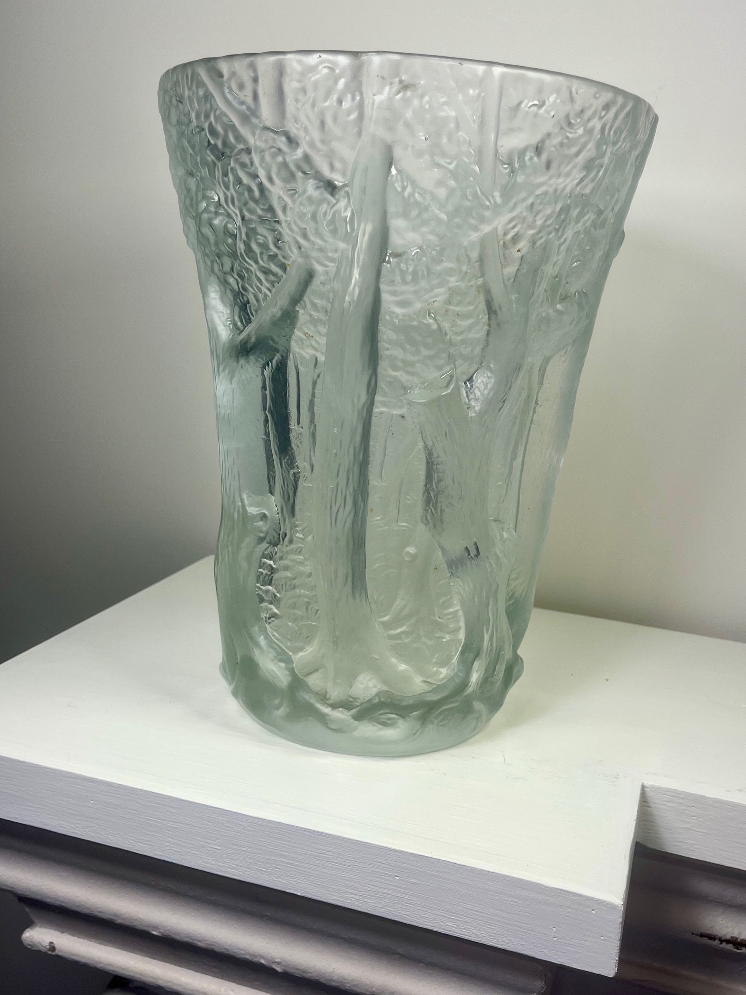 Découvrez l'élégance tchèque avec notre exceptionnel vase en cristal moulé du designer Josef Inwald (1906-1937) pour Barolac et datant des années 30, période Art Déco. Baptisée "Dans la forêt", cette très belle pièce ornée d'arbres en relief est d'une qualité remarquable, son poids substantiel et sa taille évoquant le prestige de Lalique.