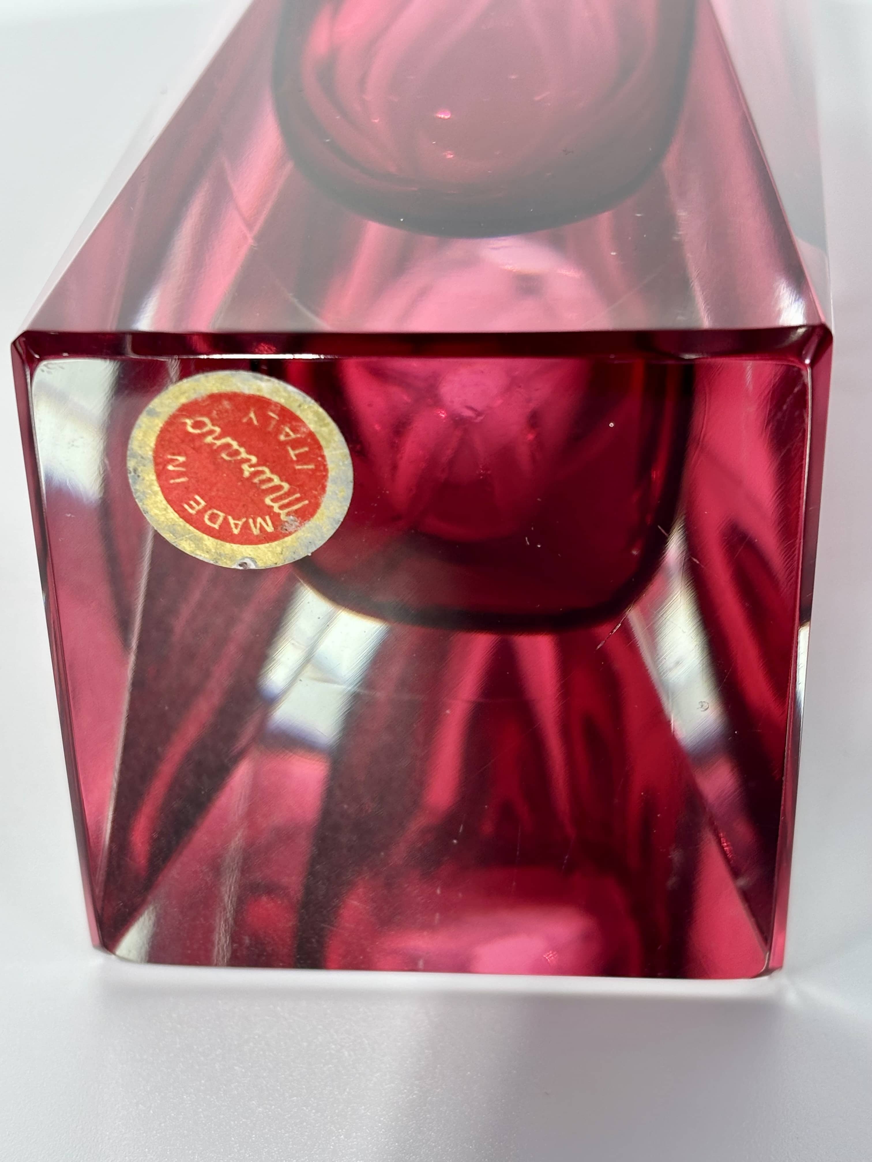 Vase soliflore de section carrée en cristal de Murano (cristallo), exemplaire remarquable du design italien des années 60. Pièce architecturale alliant la rigueur de la taille géométrique à la fluidité de la couleur. Points forts: . Technique: travail de Sommerso (verre superposé) présentant un noyau fushia amarante en suspension dans une épaisse masse de cristal translucide. . Finition: entièrement taillé à facettes et poli à froid. Les arêtes sont vives, créant des jeux de réfraction spectaculaires à la lumière. . Authenticité: Etiquette d'origine "Made in Murano Italy" présente sous la base. . Attribution: modèle caractéristique des productions de Mandruzzato ou Flavio Poli. . Parfait état de conservation. Aucun éclat, aucune égrisure sur les arêtes. Cristal limpide. Pourquoi choisir cette pièce: C'est un grand format (26 cm) doté d'une présence visuelle forte. Sa couleur vive et son design minimaliste en font un objet de collection recherché.