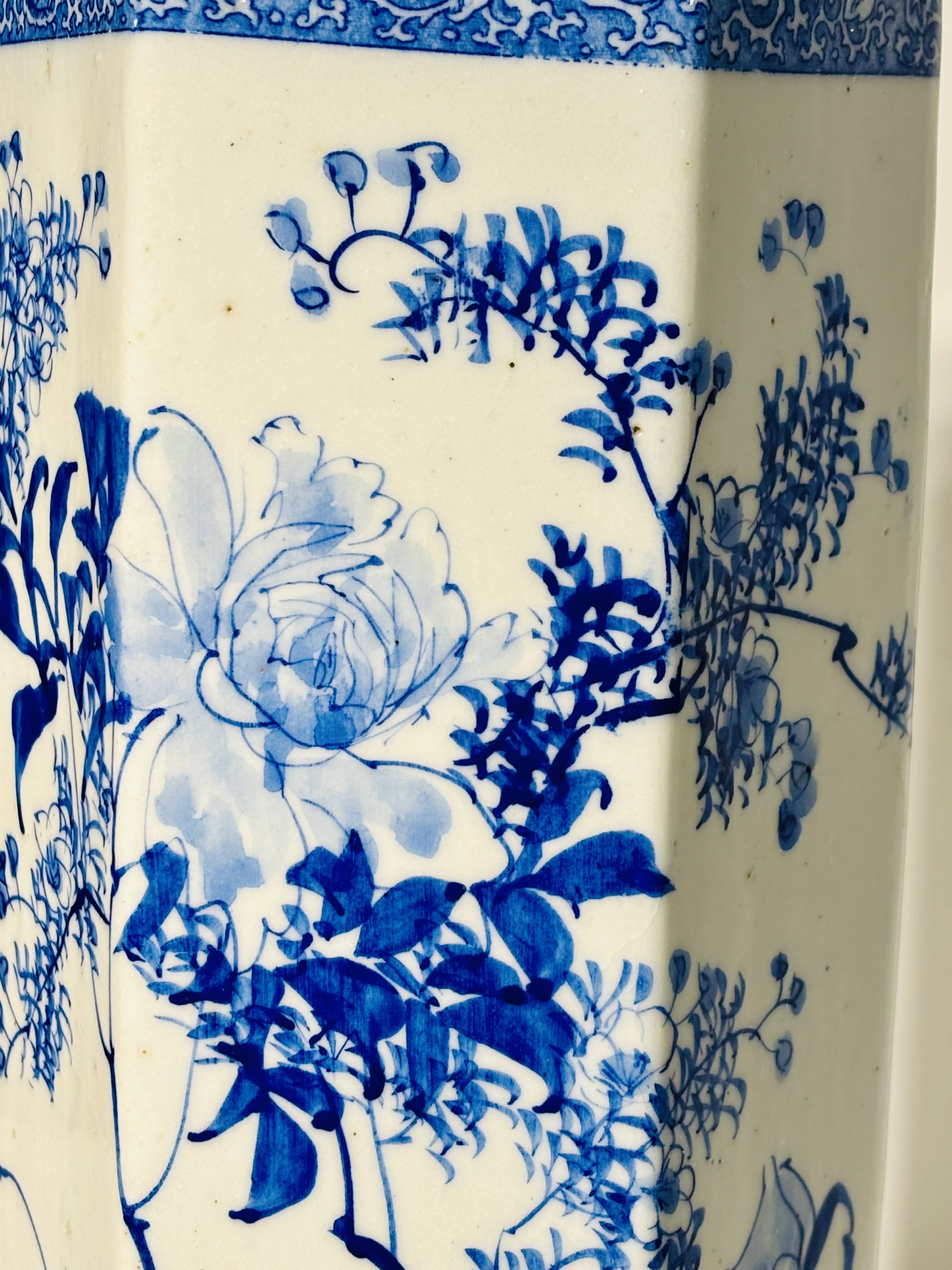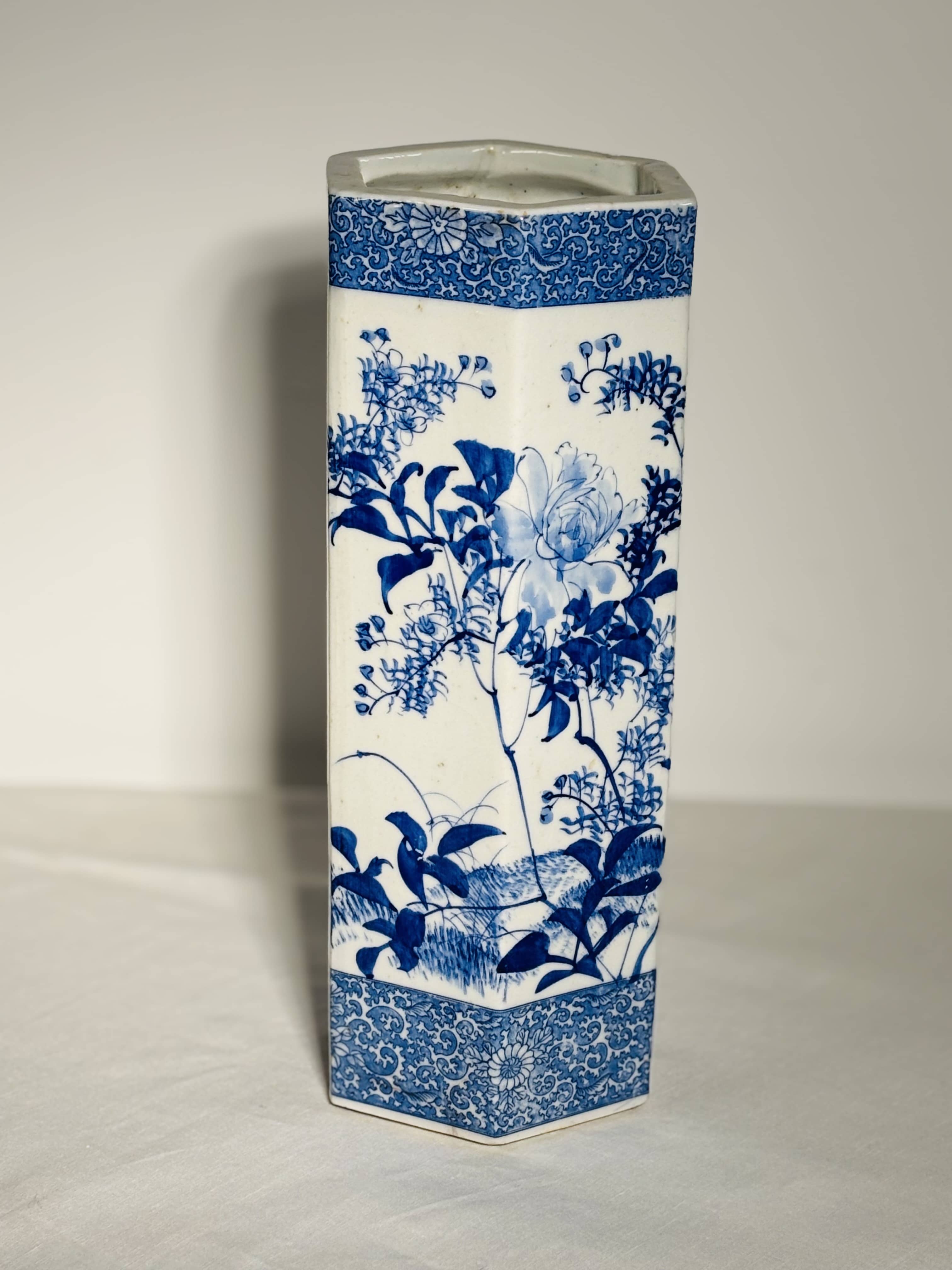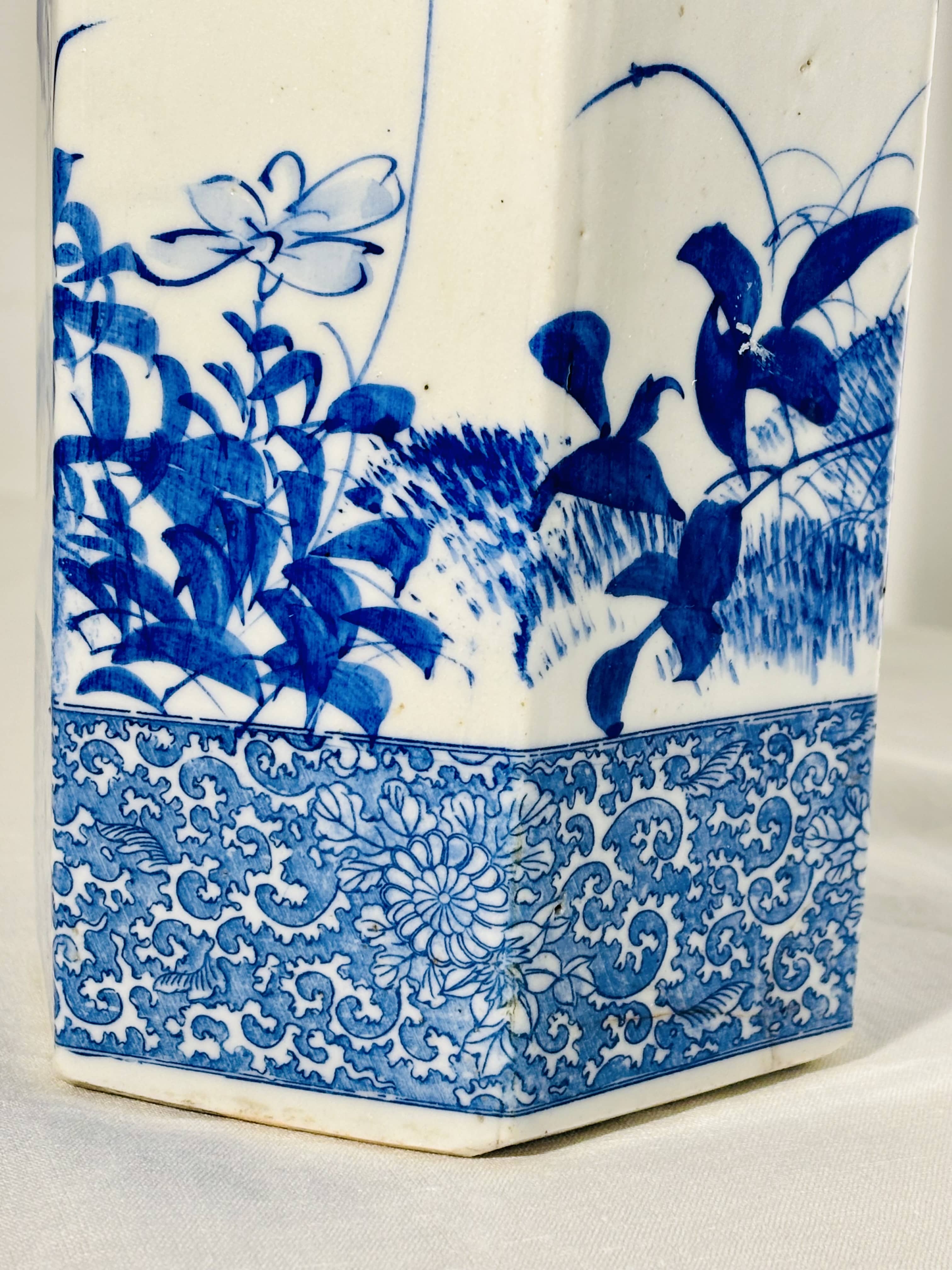 Élégant vase de forme hexagonale en porcelaine à décor "Bleu et Blanc", datant de la fin de l'époque Meiji (circa 1890-1910).