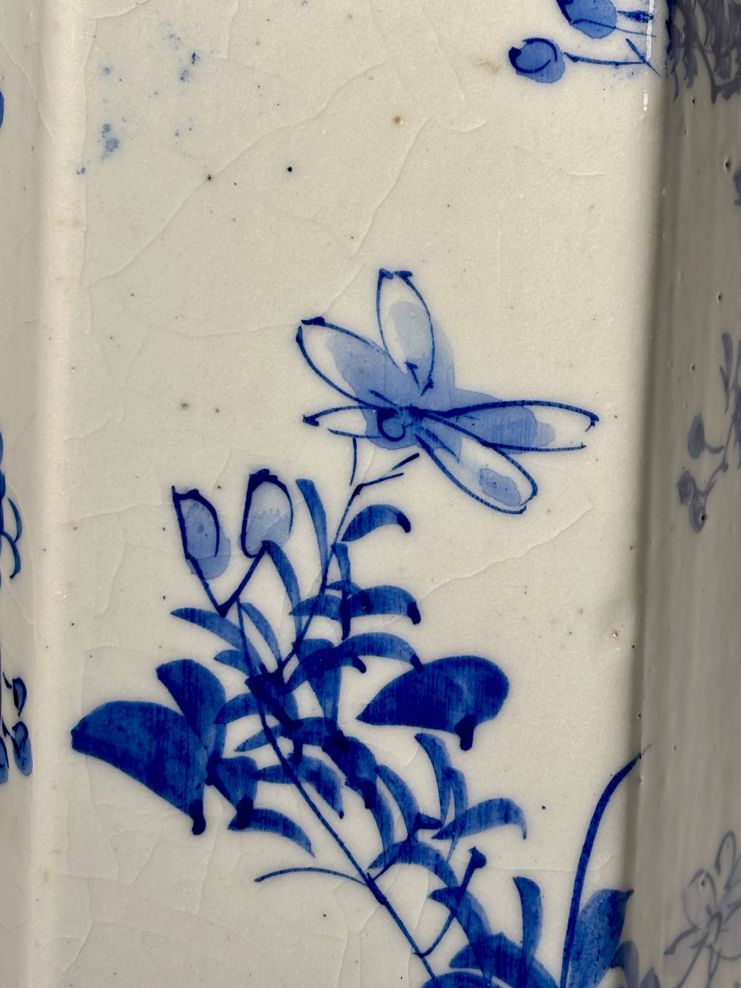 Ce vase présente un décor naturaliste riche et équilibré, mettant en scène des pivoines en pleine floraison — symbole de prospérité et de noblesse — ainsi que des papillons, traités avec une grande finesse graphique. Le dessin se distingue par un trait vif et des dégradés de bleu de cobalt profonds caractéristiques des productions japonaises de la région de Seto destinées à l'exportation.