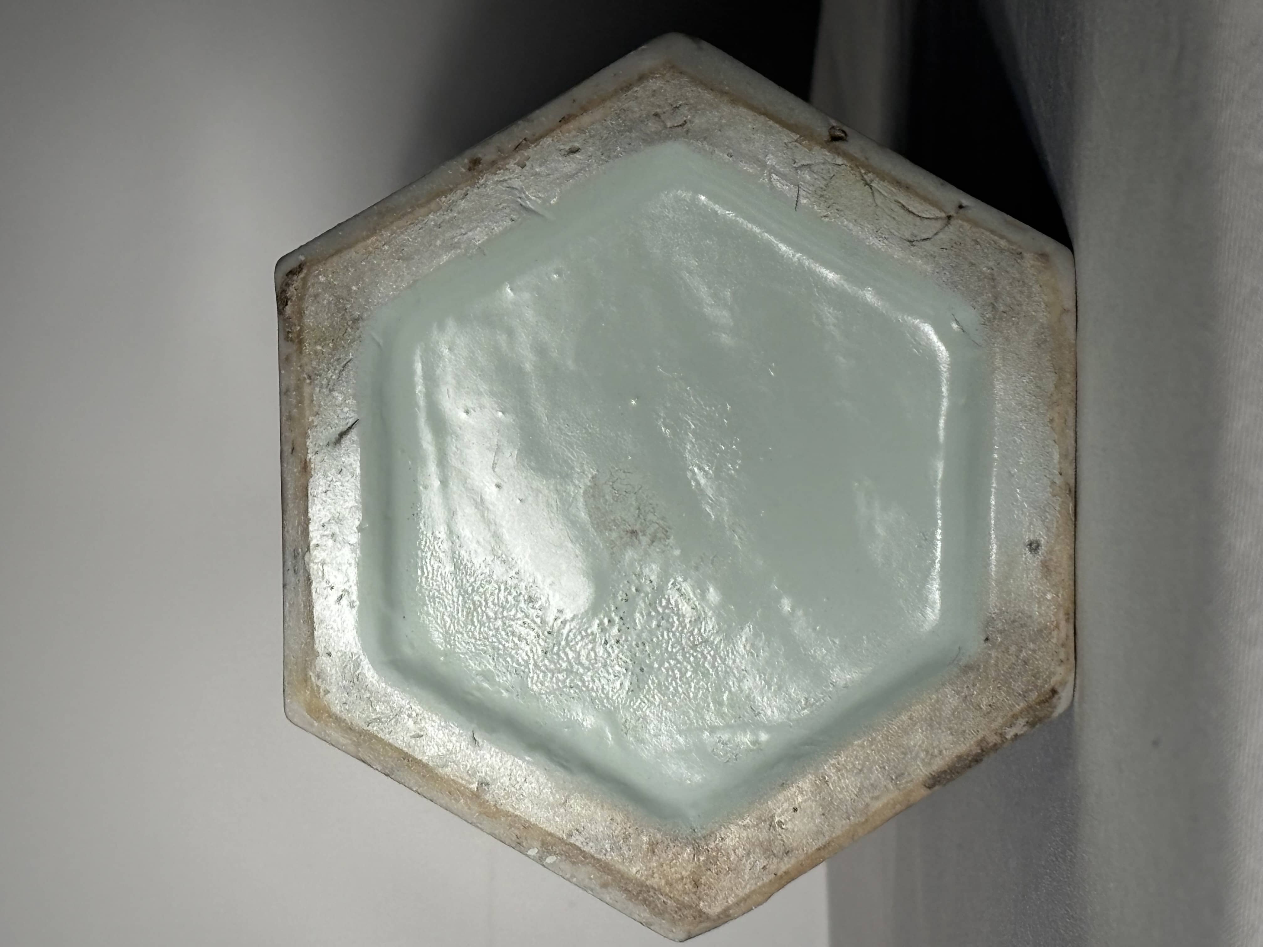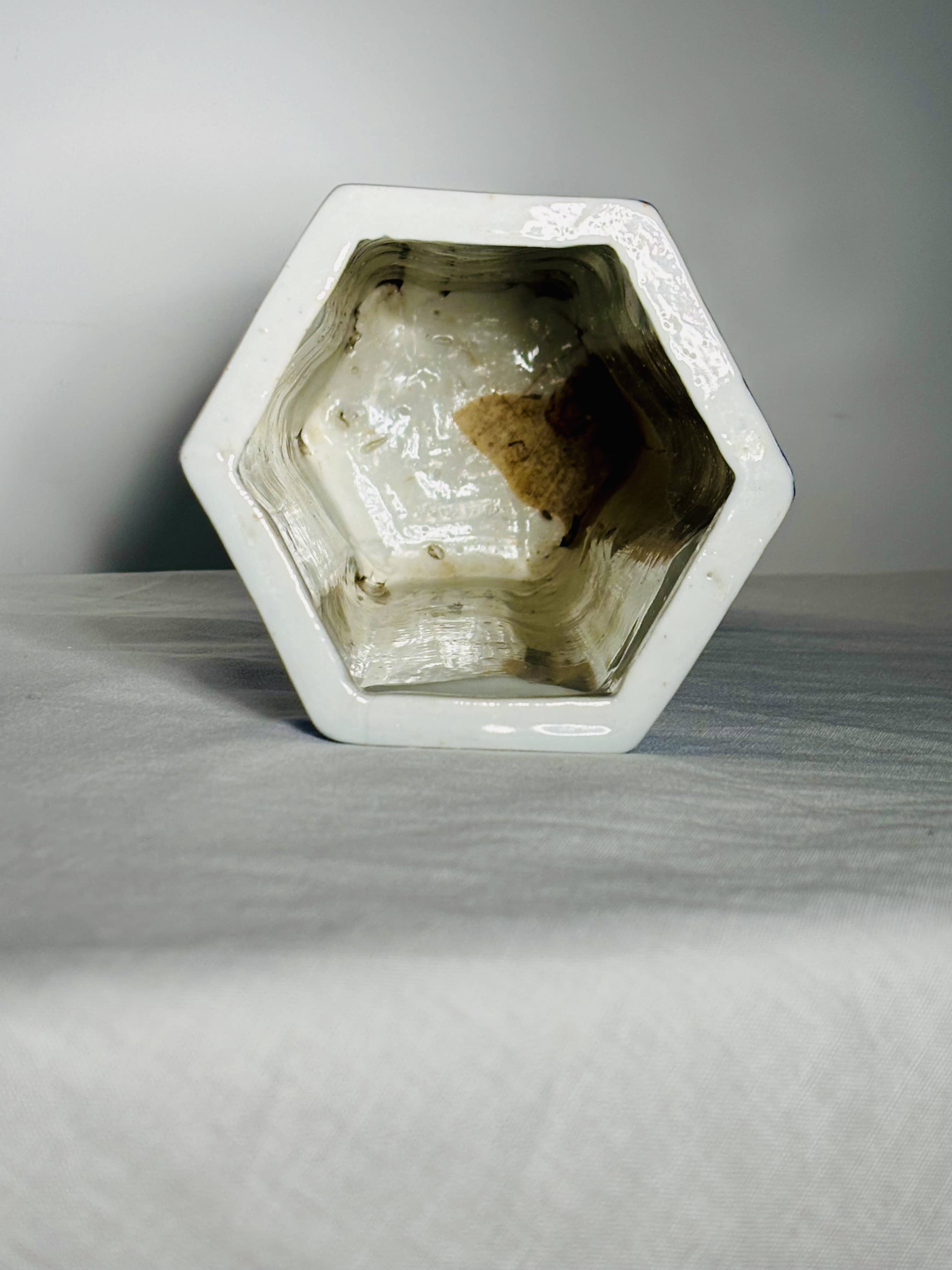 La forme hexagonale, plus rare et recherchée que les formes cylindriques classiques, offre des jeux de lumière intéressants sur les facettes, ce qui en fait un objet de décoration idéal pour une mise en scène contemporaine ou un montage en lampe de haute facture.