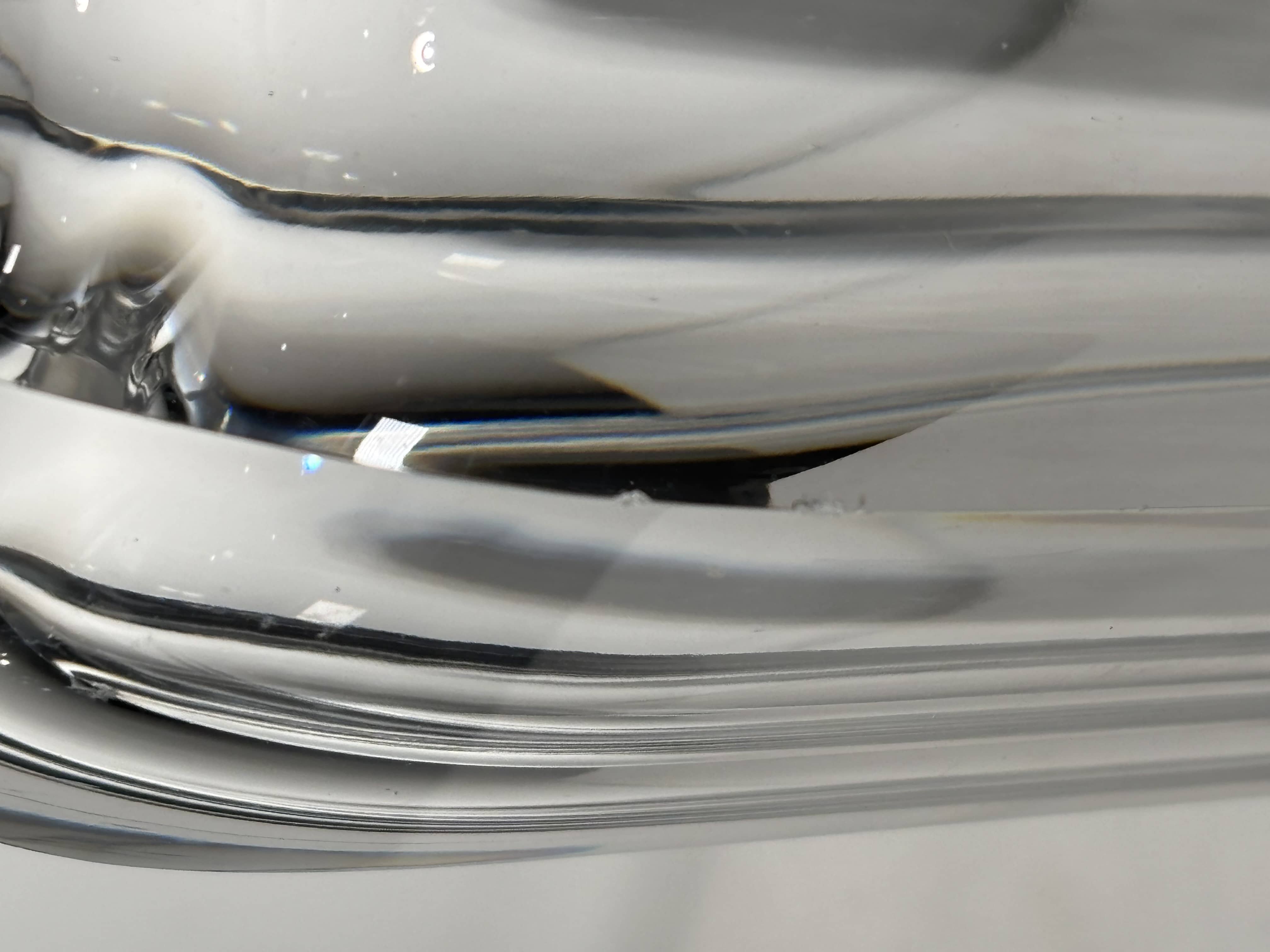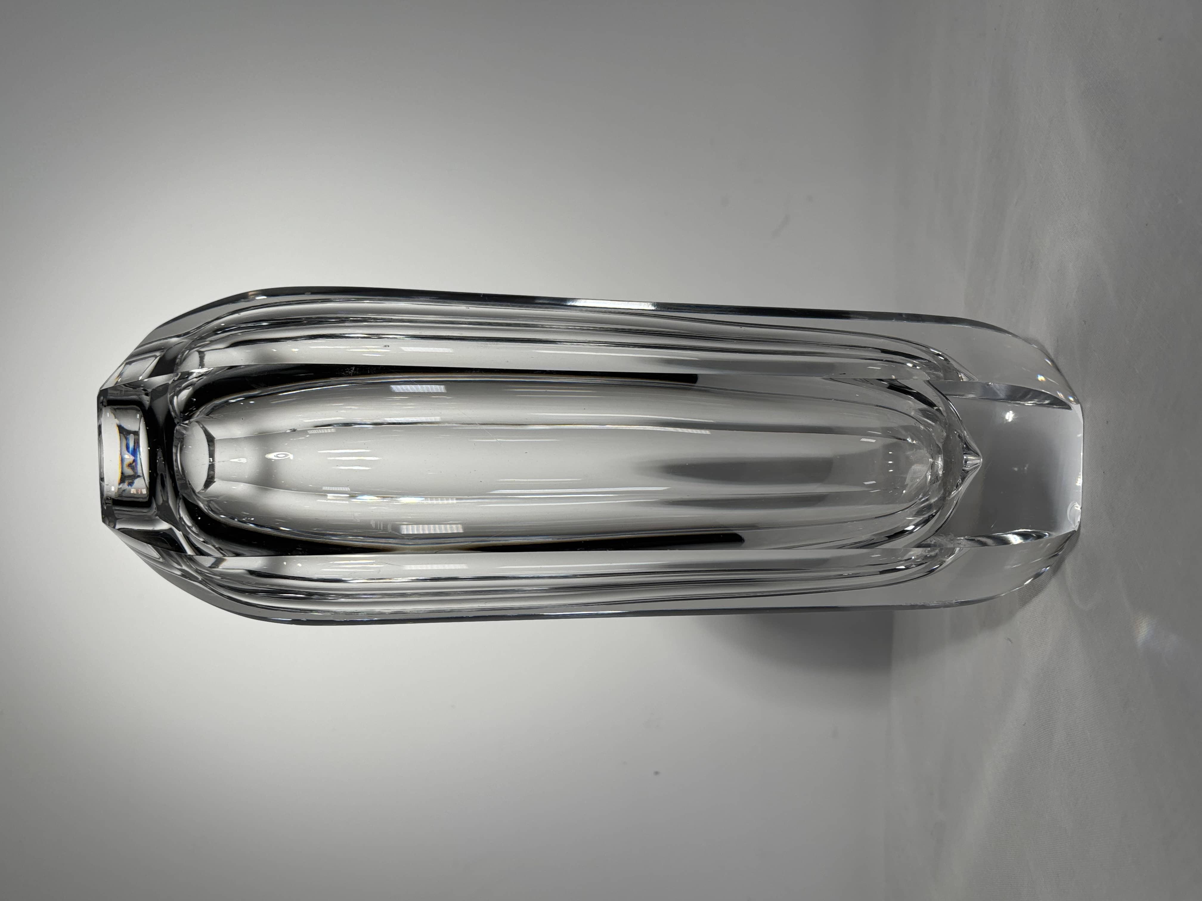Grand vase en cristal soufflé et taillé, signé et daté sous la base Boda 1947. Pièce de la manufacture Boda Glasbruk (Suède), antérieure à la période Erik Höglund et à la fusion des manufactures qui donnera naissance à Kosta Boda AB en 1976.Le vase présente une forme élancée à parois épaisses, structurée par six côtes verticales taillées dans la masse du cristal, créant un remarquable effet optique d’un cylindre intérieur suspendu dans la matière. Cristal incolore d’une pureté et d’une clarté exceptionnelles, d’un poids significatif témoignant de la haute teneur en plomb propre aux productions de qualité de cette époqueEn 1947, Boda Glasbruk est encore une manufacture indépendante, produisant des pièces dans la grande tradition verrière du Småland. Cette période pré-Höglund est peu documentée et les pièces signées et datées y sont rares. Le vocabulaire formel de ce vase — rigueur architecturale, jeu sur la masse et la transparence, traitement géométrique des surfaces — s’inscrit pleinement dans le modernisme nordique naissant de l’après Seconde Guerre mondialBon état général pour une pièce de cette ancienneté. On notera un petit éclat sur la base ainsi que deux minuscules égrenures sur l'une des arêtes, sans incidence sur la lisibilité esthétique de l'ensembGravé à la pointe sous la base : Boda 1947