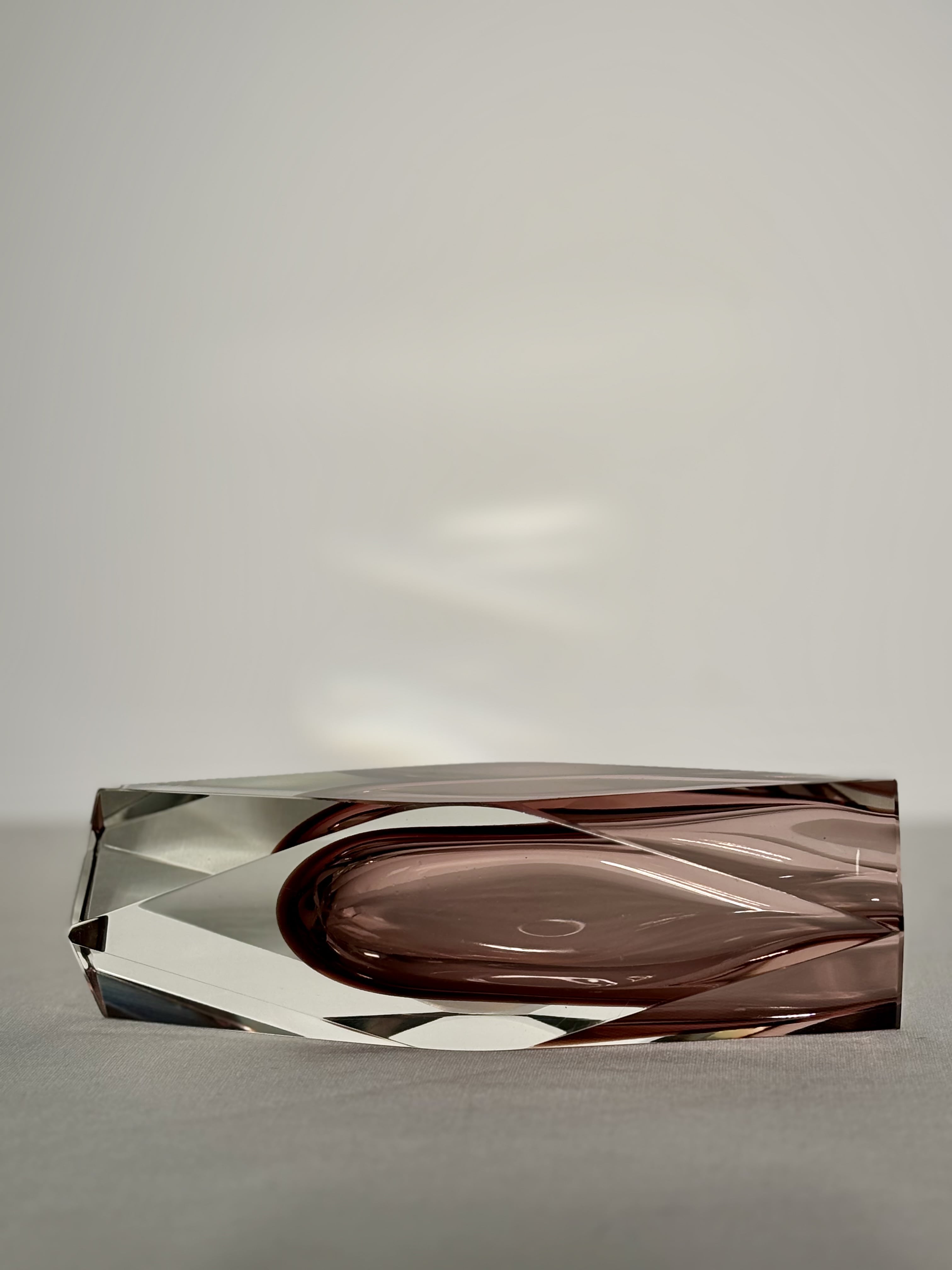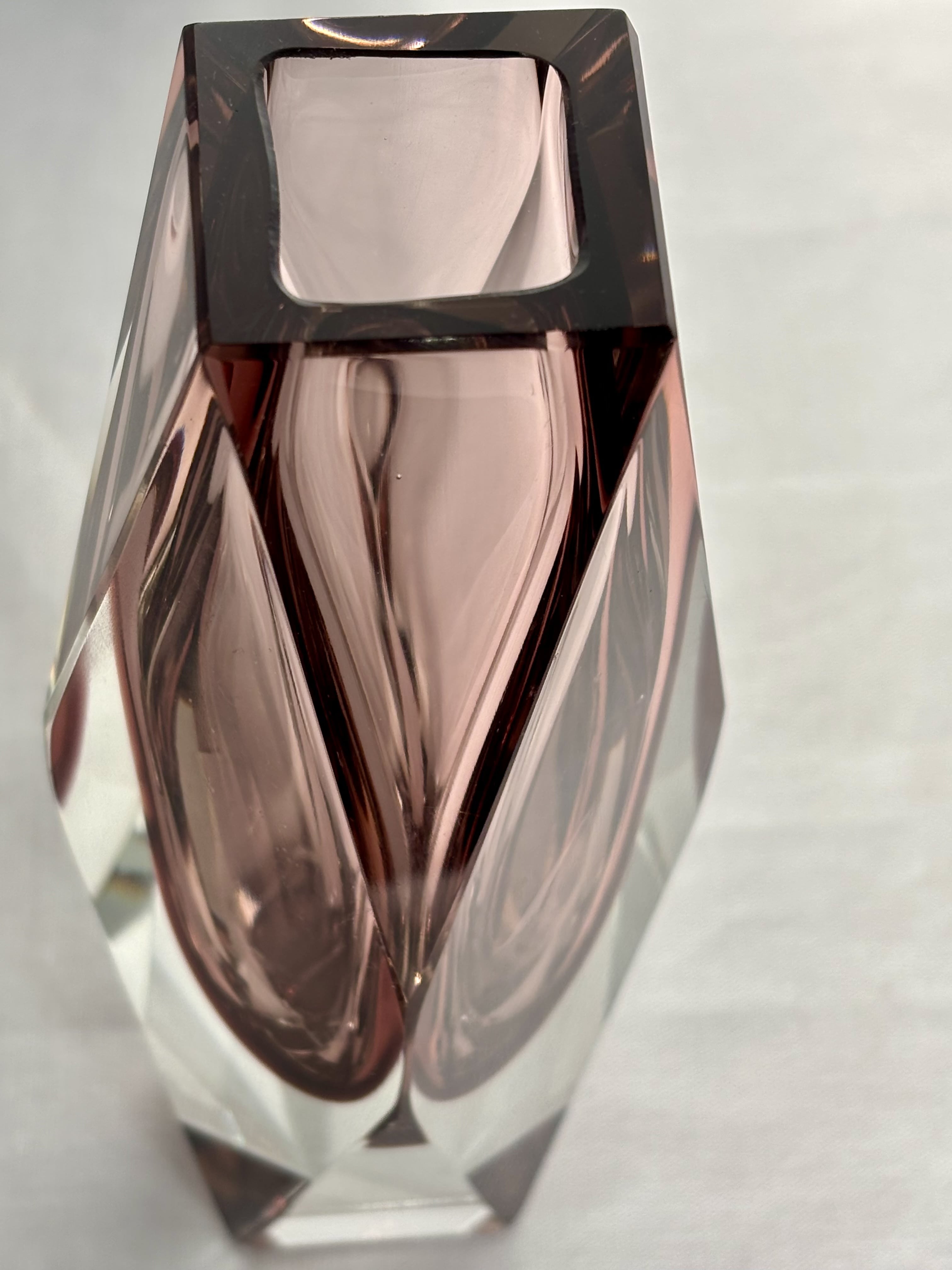 Vase sommerso en verre de Murano réalisé selon la technique traditionnelle de superposition de couches de verre fondu, nécessitant une parfaite maitrise du travailà chaud. Cette méthode permet d'obtenir une profondeur de matière et une densité optique particulièrement remarquables, signatures des grandes productions muranaises du XXe siècle. La teinte améthyste fumé, enchâssée dans une épaisse masse de verre clair crée un jeu subtil de transparence et de profondeur. Le décor est souligé par un facettage architectural aux lignes tendues et nettes, conférant à la pièce une présence sculpturale affirmée. Ce vase s'inscrit dans la grande tradition des recherches formelles menées à Murano dans les années 1960-1970, période durant laquelle le verre est envisagé comme un véritable matériau d'architecture et de sculpture, au-delà de sa seule fonction décorative. Parfait état. Aucun éclat ni égrenure. Murano-Italie XXe siècle, vers 1960-1970