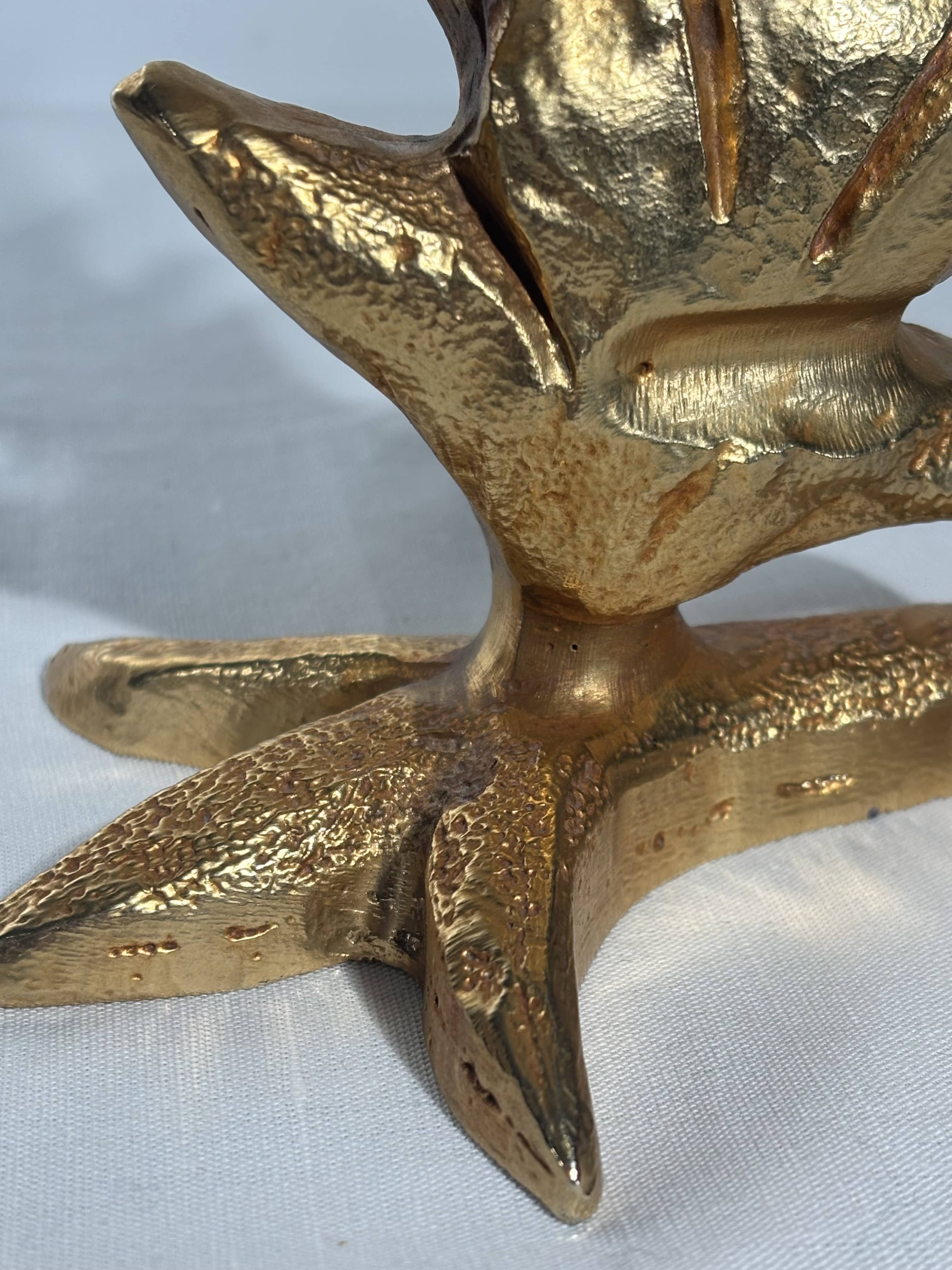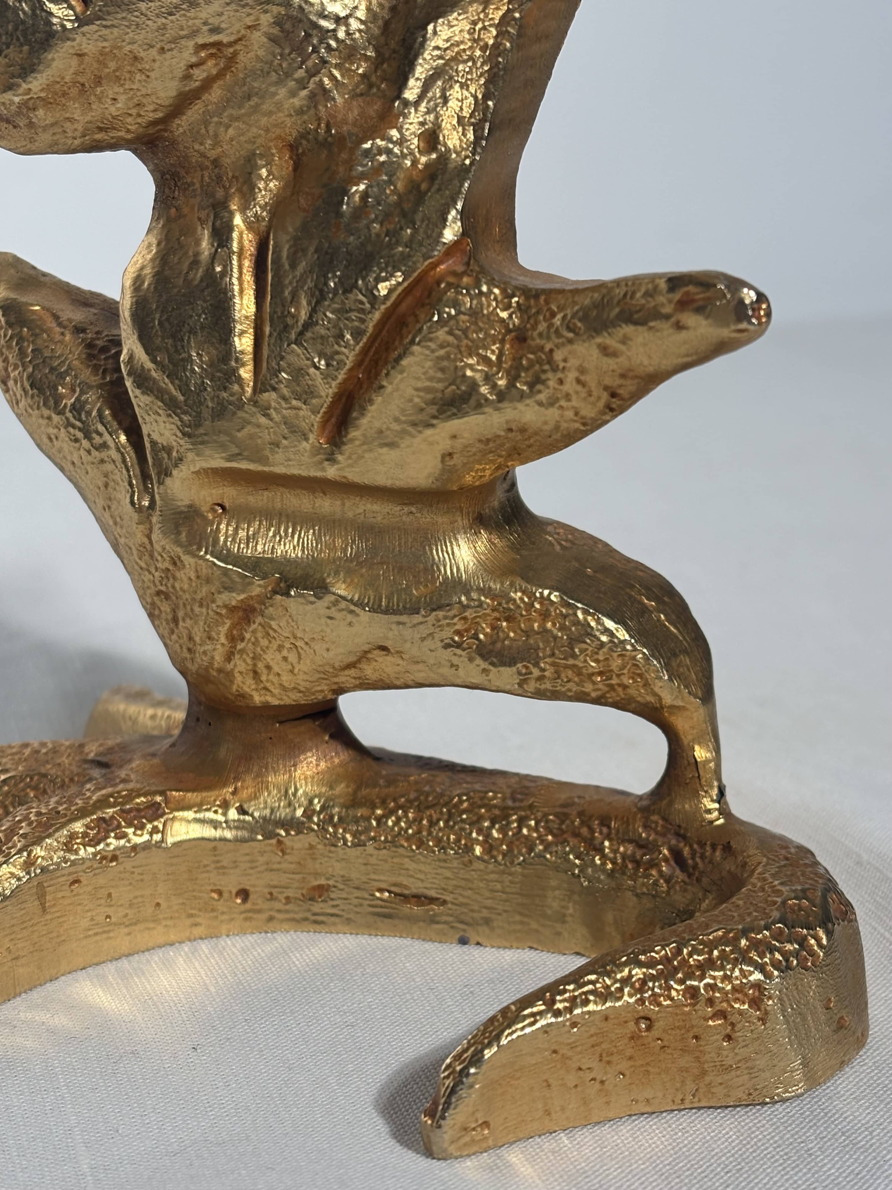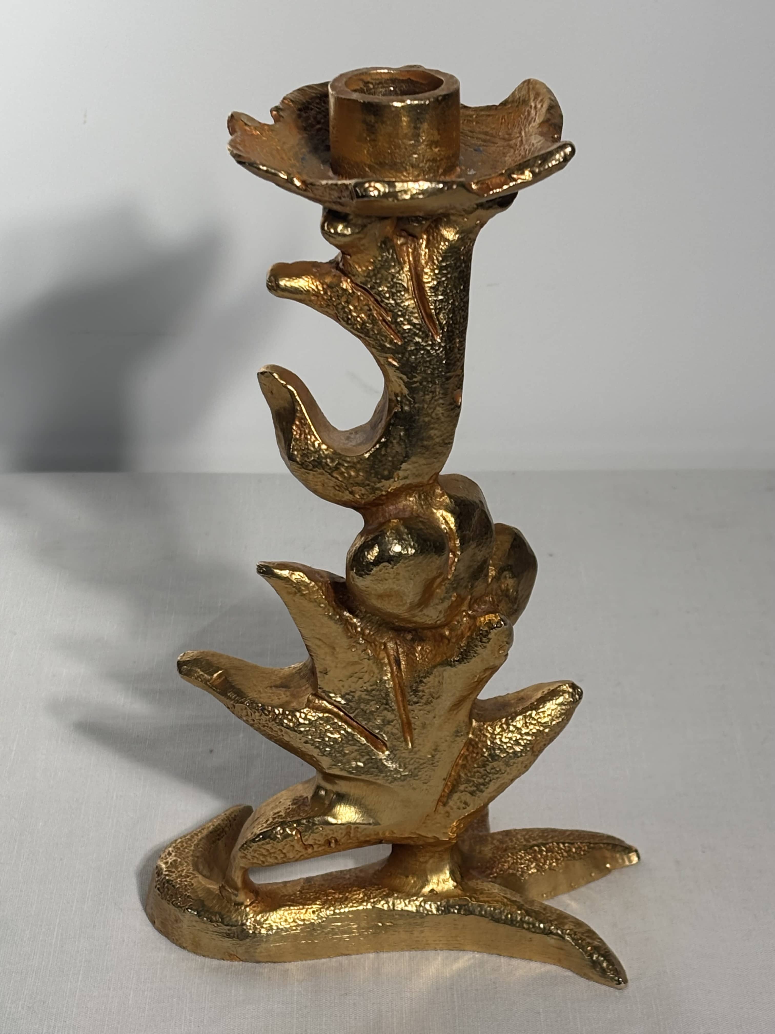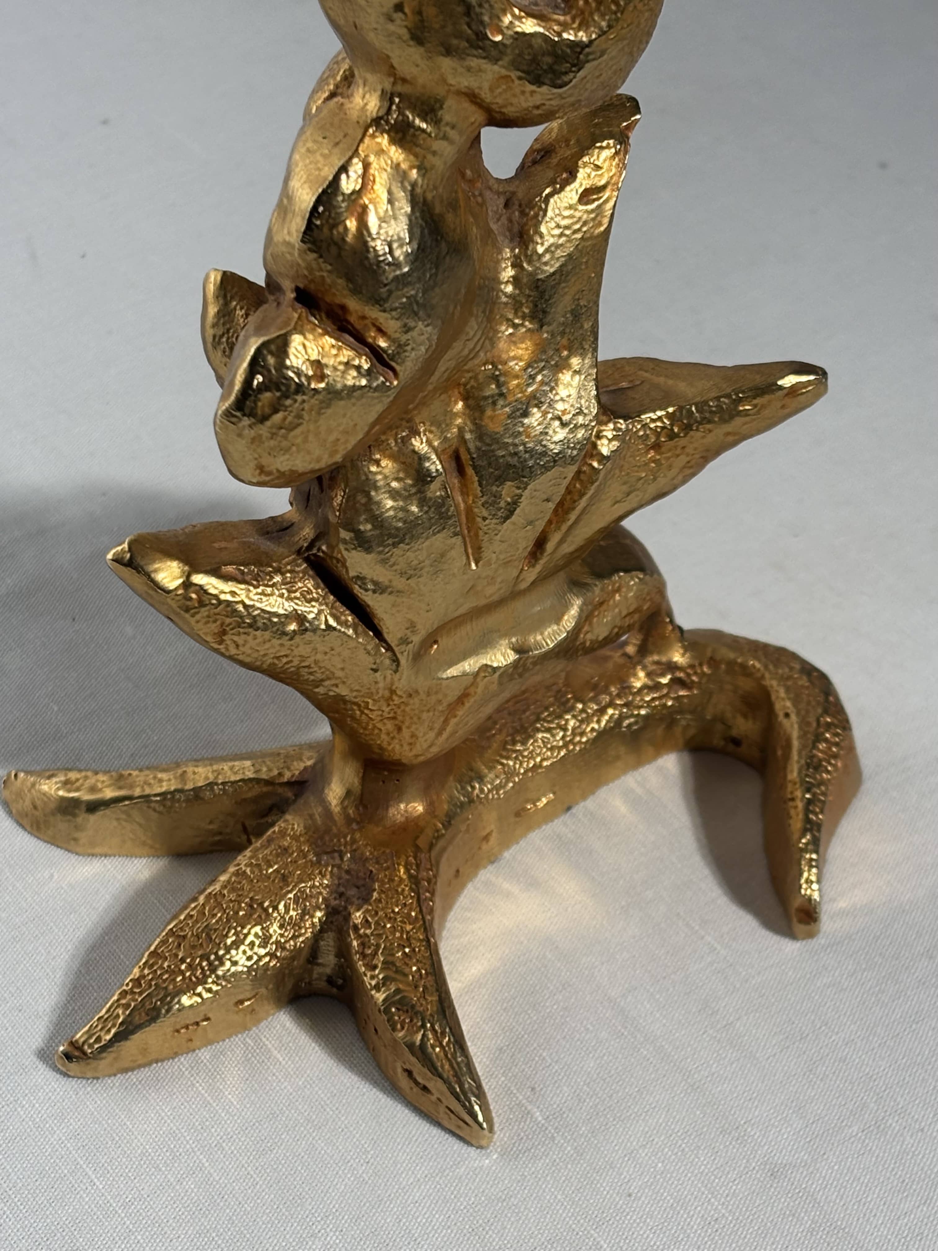 Bougeoir sculptural en bronze doré de Georges Mathias pour Fondica, caractéristique du travail organique et expressif de la seconde moitié du XXe siècle. La pièce se distingue par une composition verticale libre, évoquant une forme végétale ou coralienne stylisée. Le fût se déploie en excroissances successives aux lignes sinueuses et dynamiques, créant un jeu d'ombres et de reliefs particulièrement vibrant. La base tripode, largement épanouie, assure stabilité tout en prolongeant cette esthétique biomorphique. La dorure présente une profondeur et un éclat qui magnifient les aspérités du bronze. C'est une pièce de caractère, à la fois primitive et extrêmement raffinée.