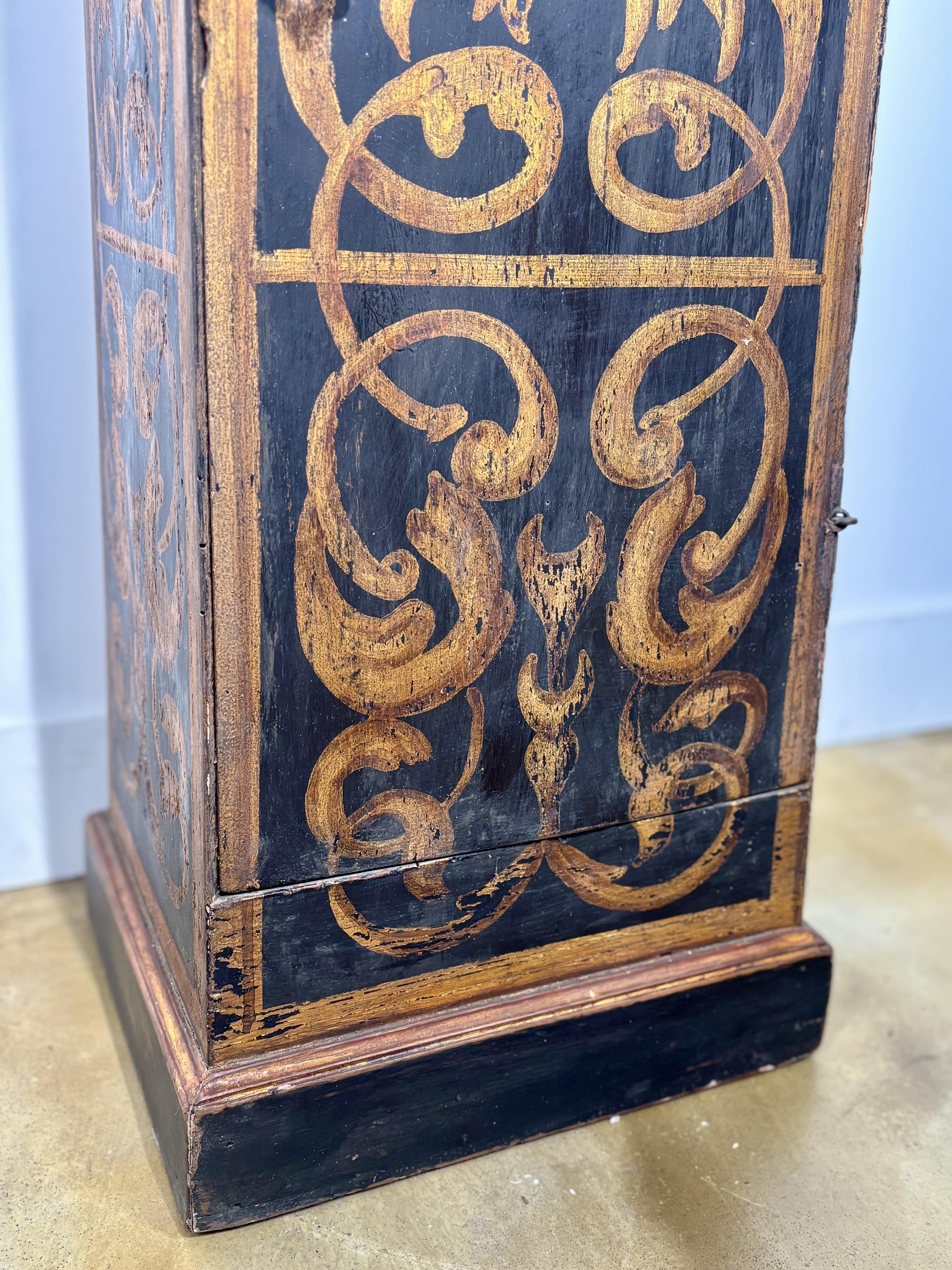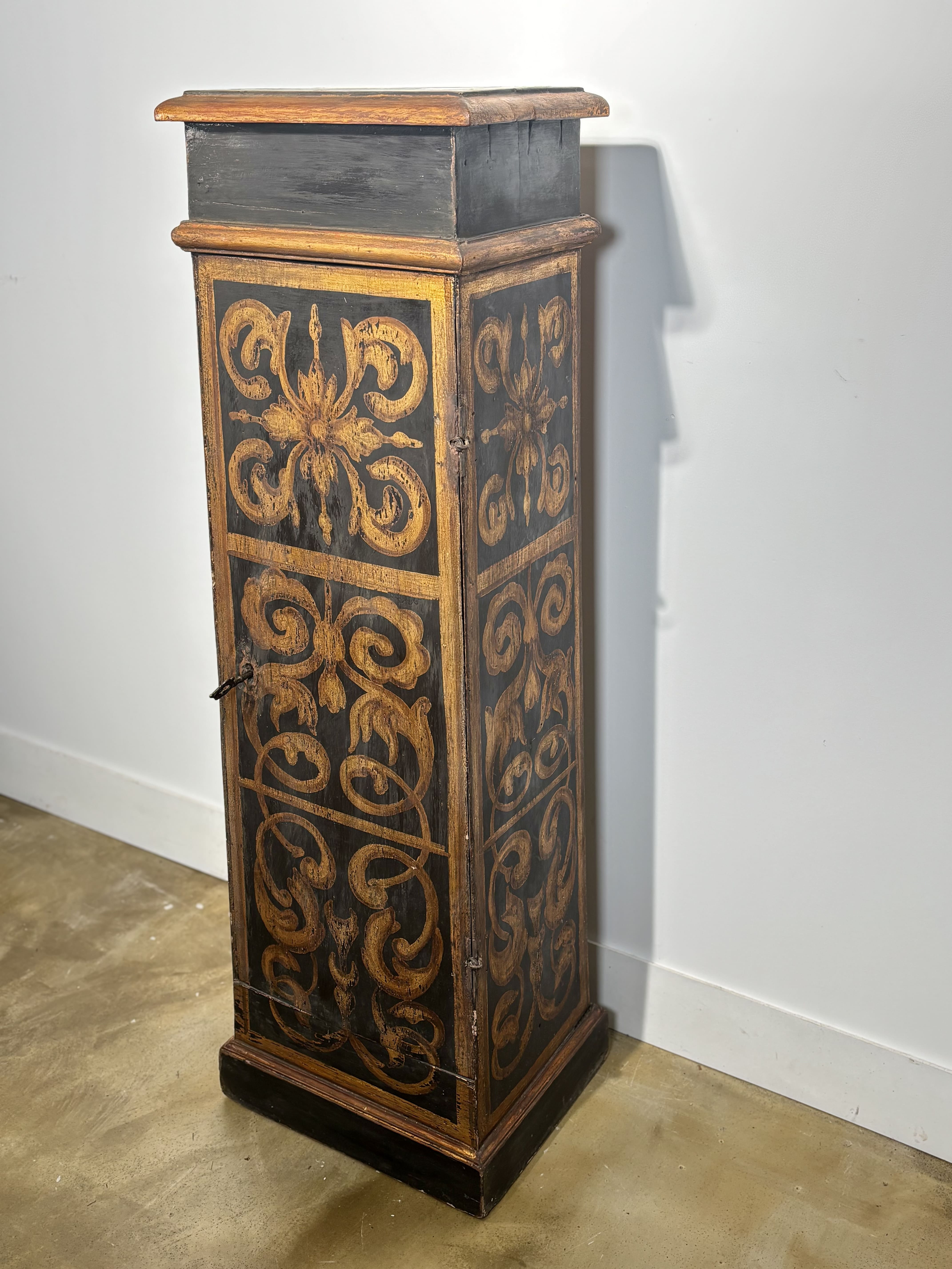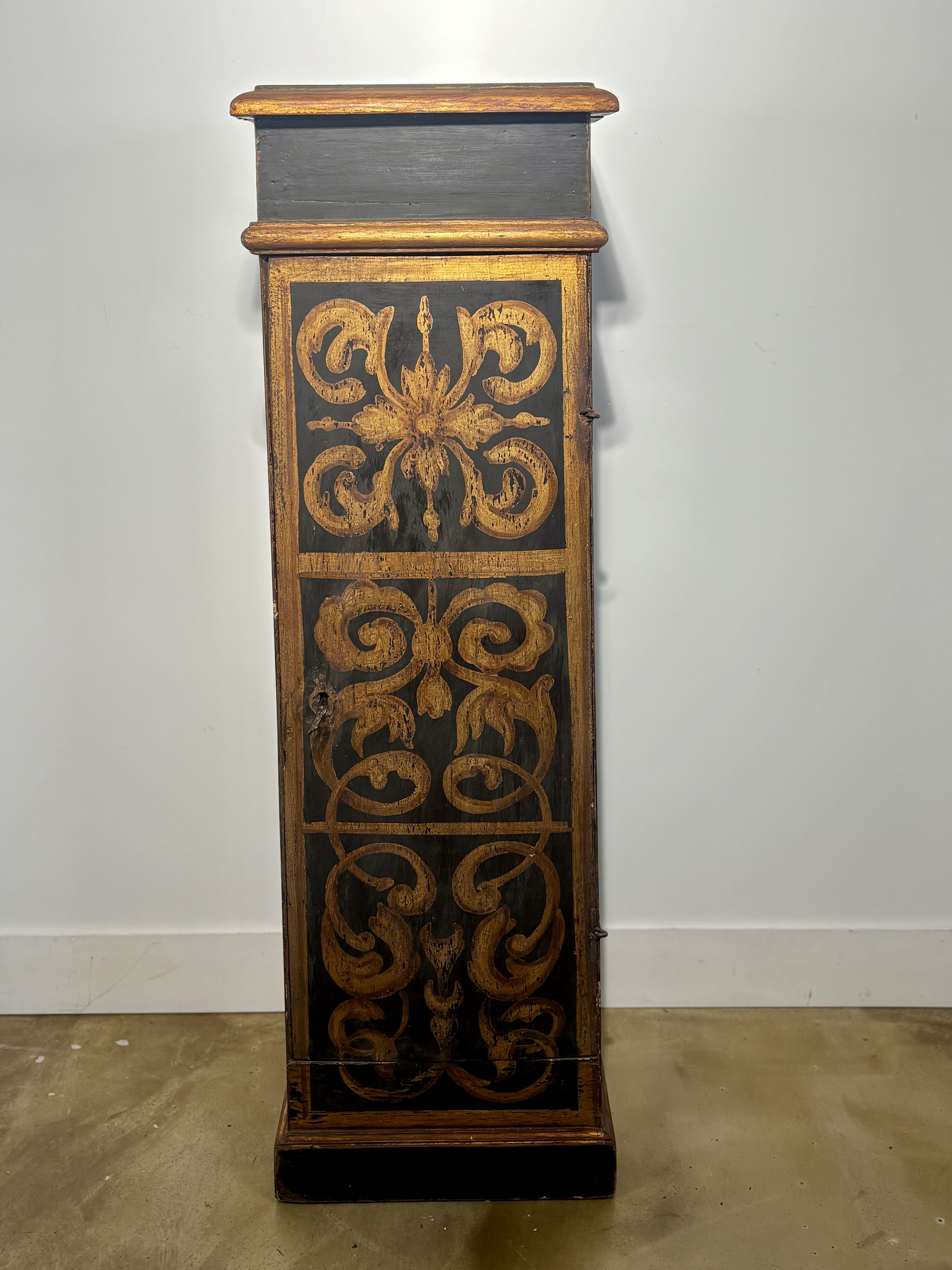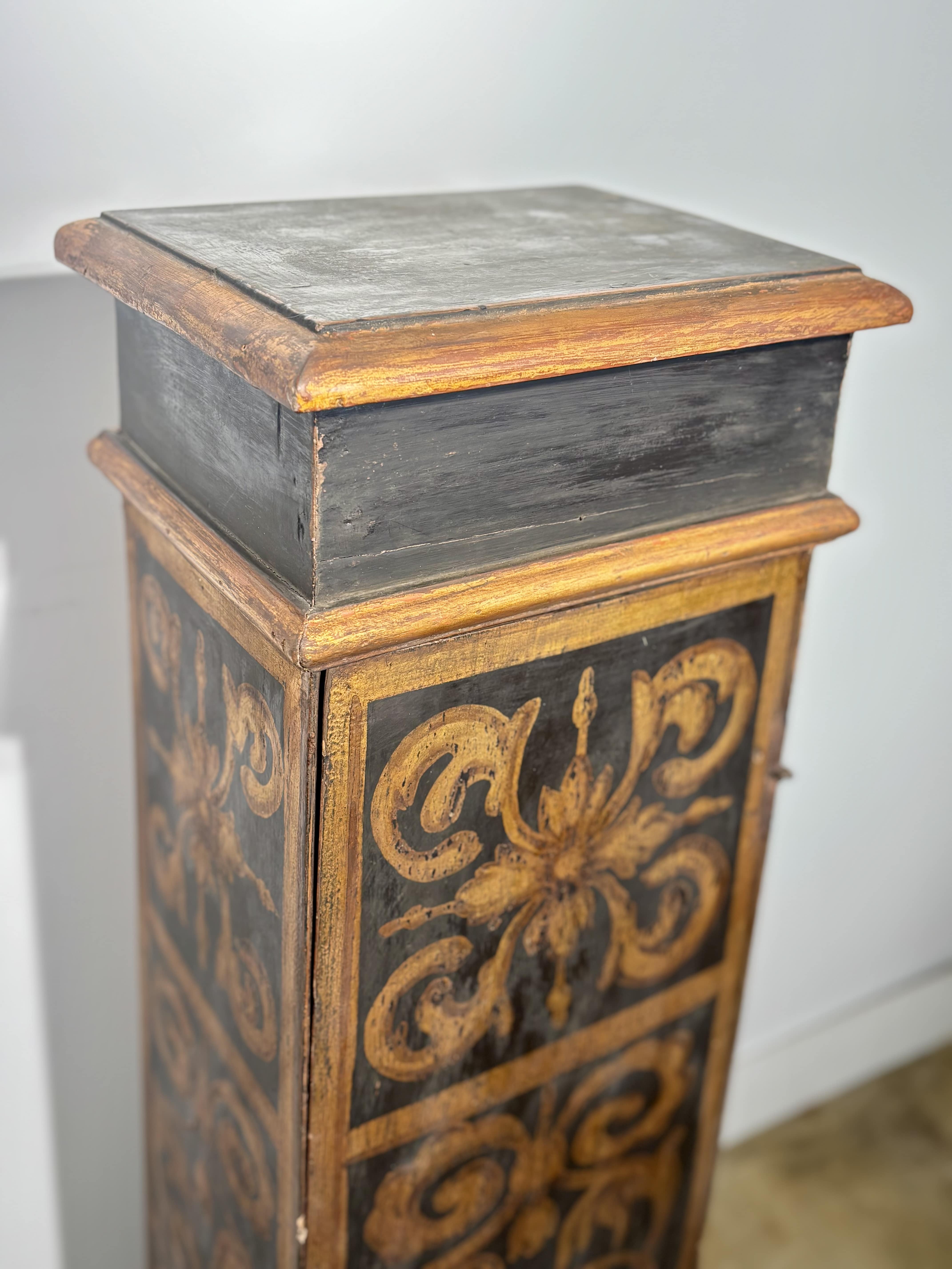 Elégante colonne d'appoint ou sellette de forme rectangulaire, réalisée en bois peint à fond noir profond, rehaussé d'un décor doré. Production italienne du XIXe siècle s'inspirant du répertoire ornemental du XVIIIe siècle. Les quatre faces présentent une composition symétrique de rinceaux feuillagés, fleurons et motifs floraux stylisés, finement exécuté en dorure mate sur fond noir. Le dessin conjugue une rigueur néo-classique à des réminiscences baroques, conférant à la pièce une présence architecturale affirmée. La colonne ouvre par une porte latérale munie de ferrures anciennes d'origine, donnant accès à un intérieur en bois naturel, aménagé d'une étagère fixe. La structure repose sur une base moulurée sobre, et est surmontée d'un plateau supérieur débordant, aux arêtes adoucies, également soulignées de dorure. Polychromie conservée avec des usures cohérentes avec l'âge. A mi chemin entre mobilier et élément décoratif servant à la fois de colonne décorative, de support d'objets ou de petit meuble de rangement discret.